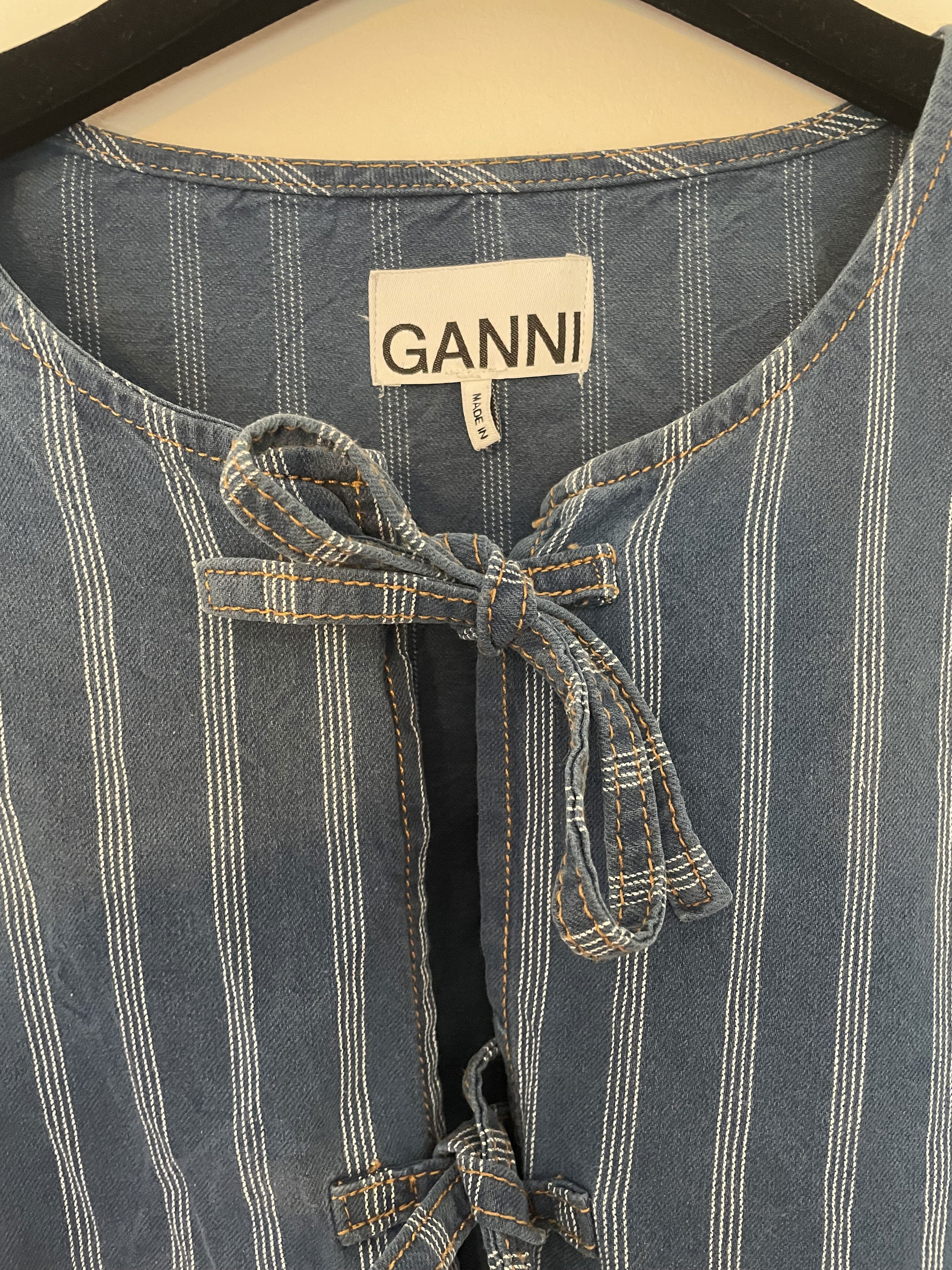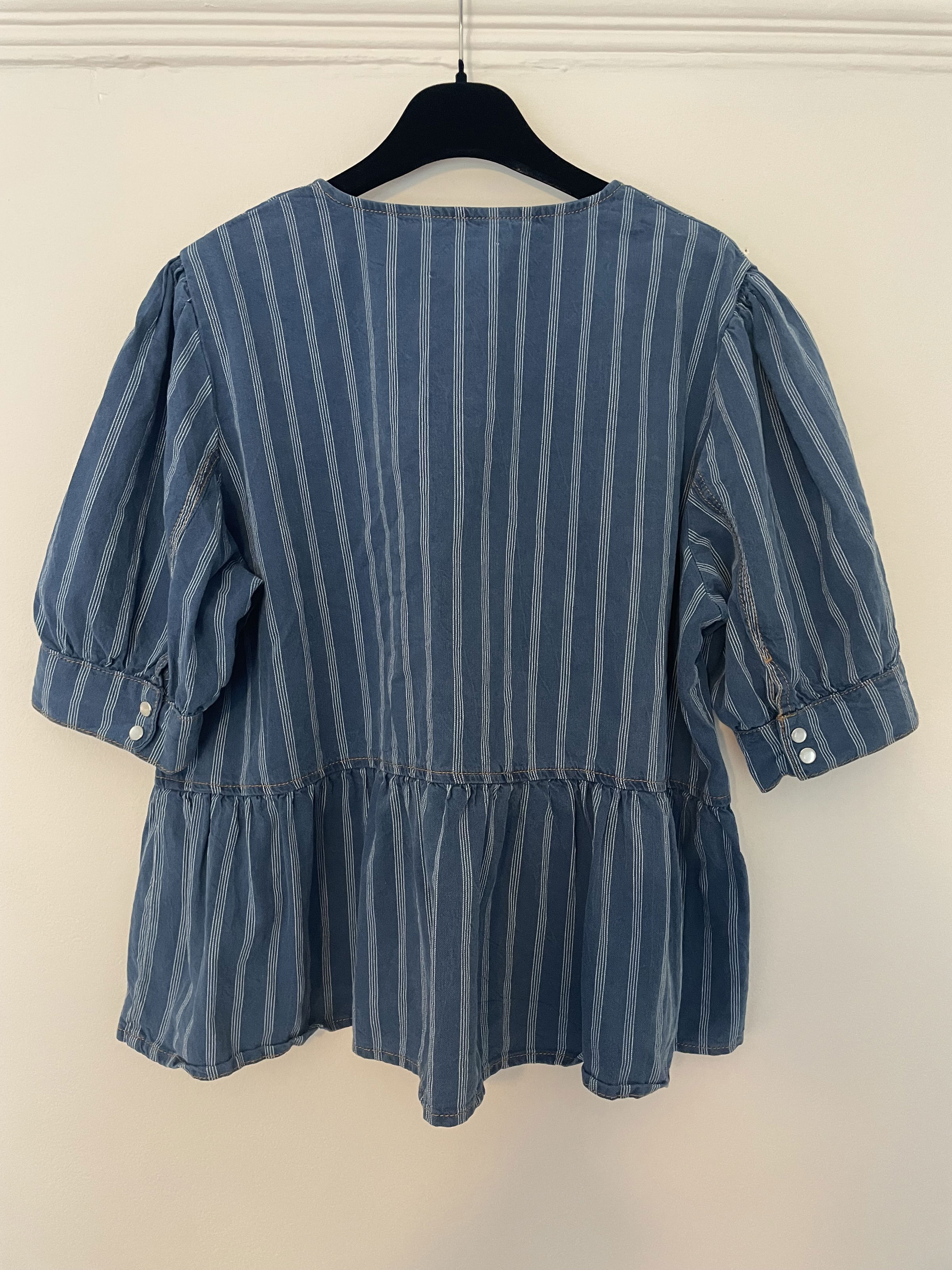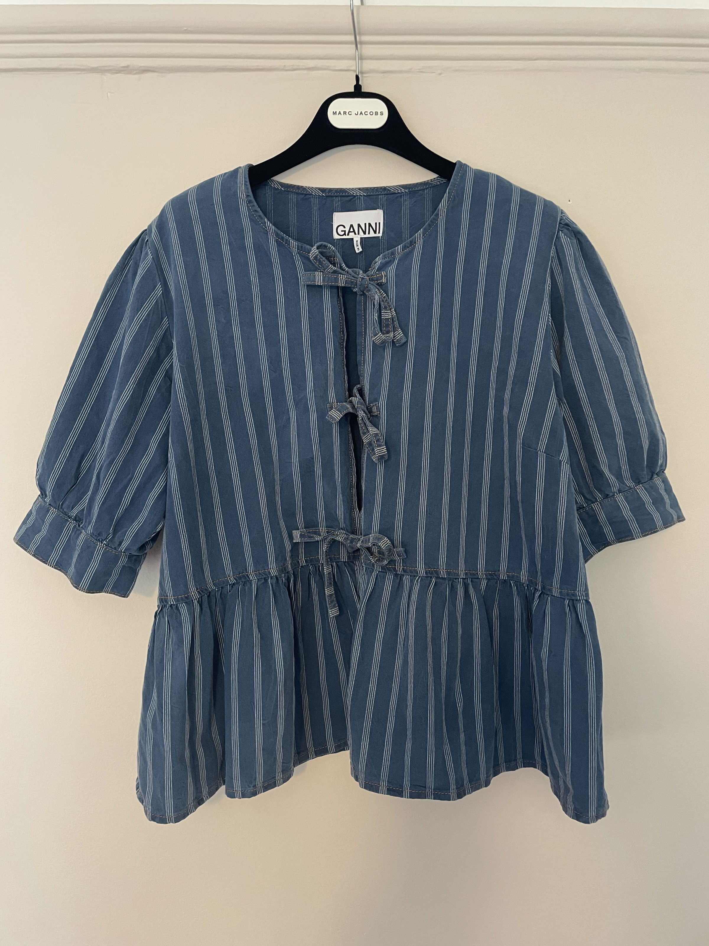 Ganni tie front peplum blouse in really nice soft denim with white ticking stripe. Really great iconic Ganni style. Hardly worn so in great condition.