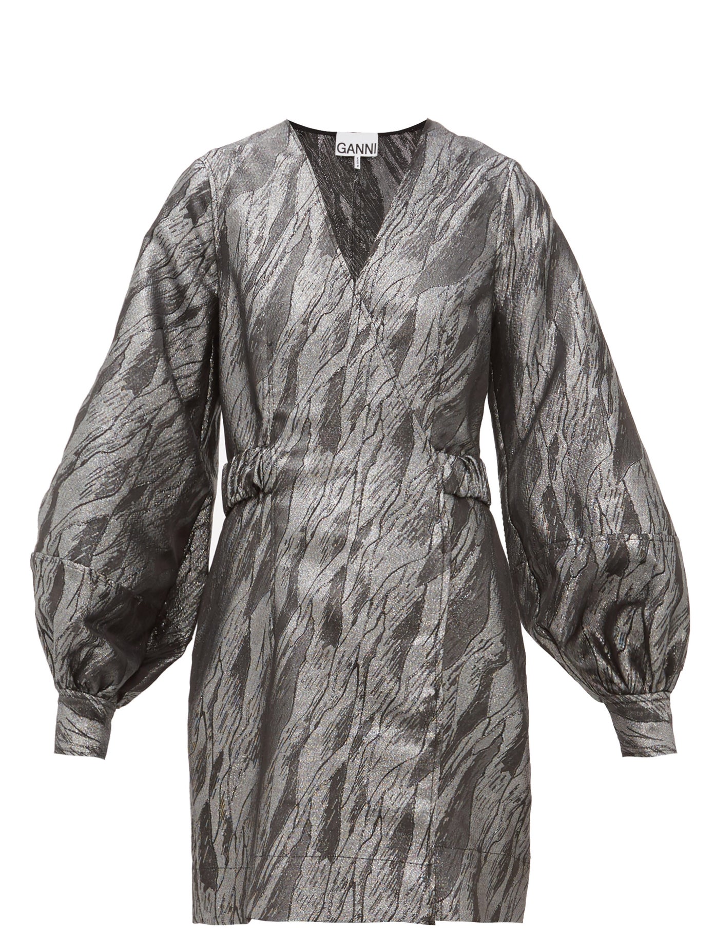 brown organic cotton all-over leopard print spread collar V-neck short puff sleeves below-knee length