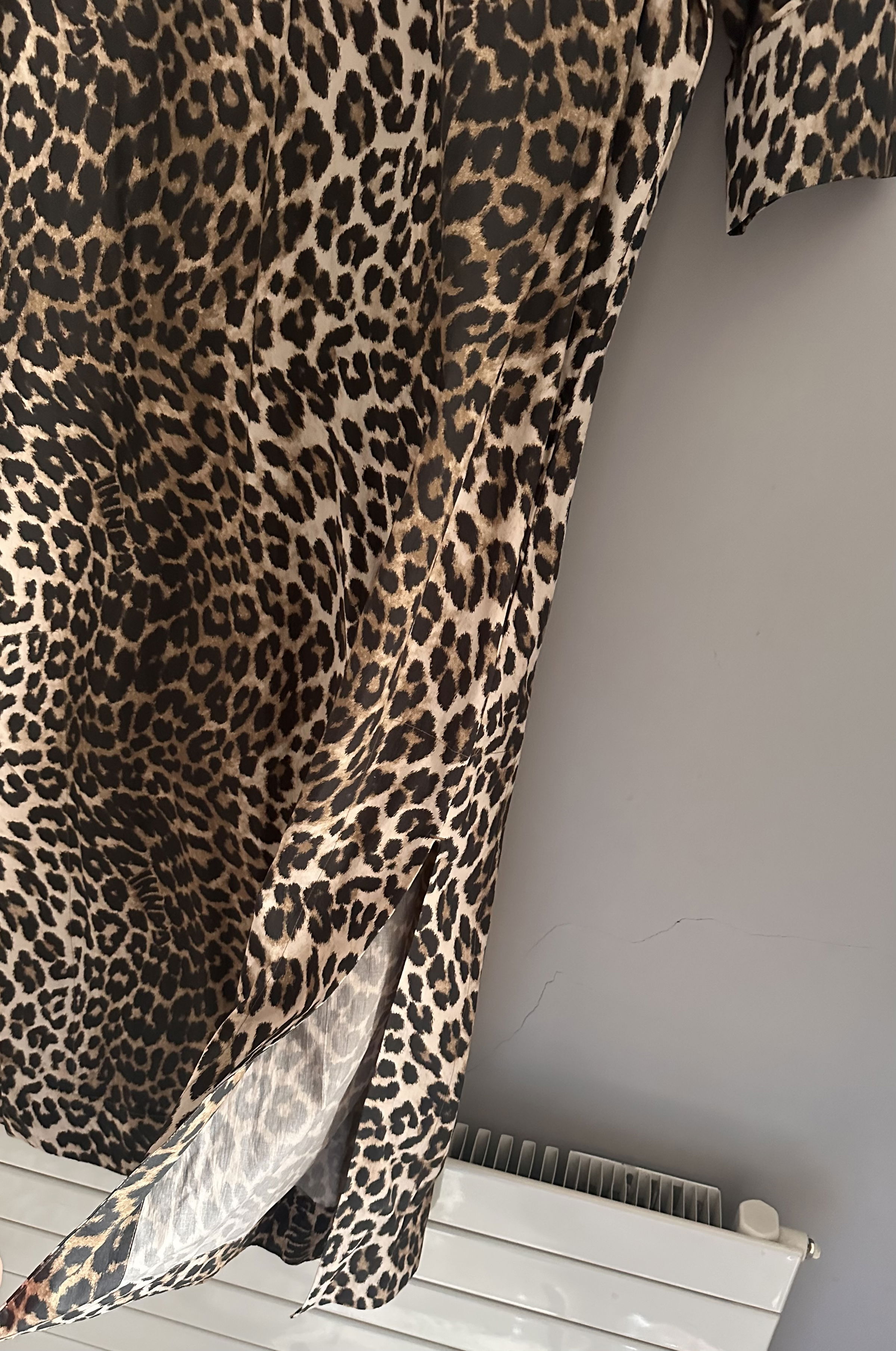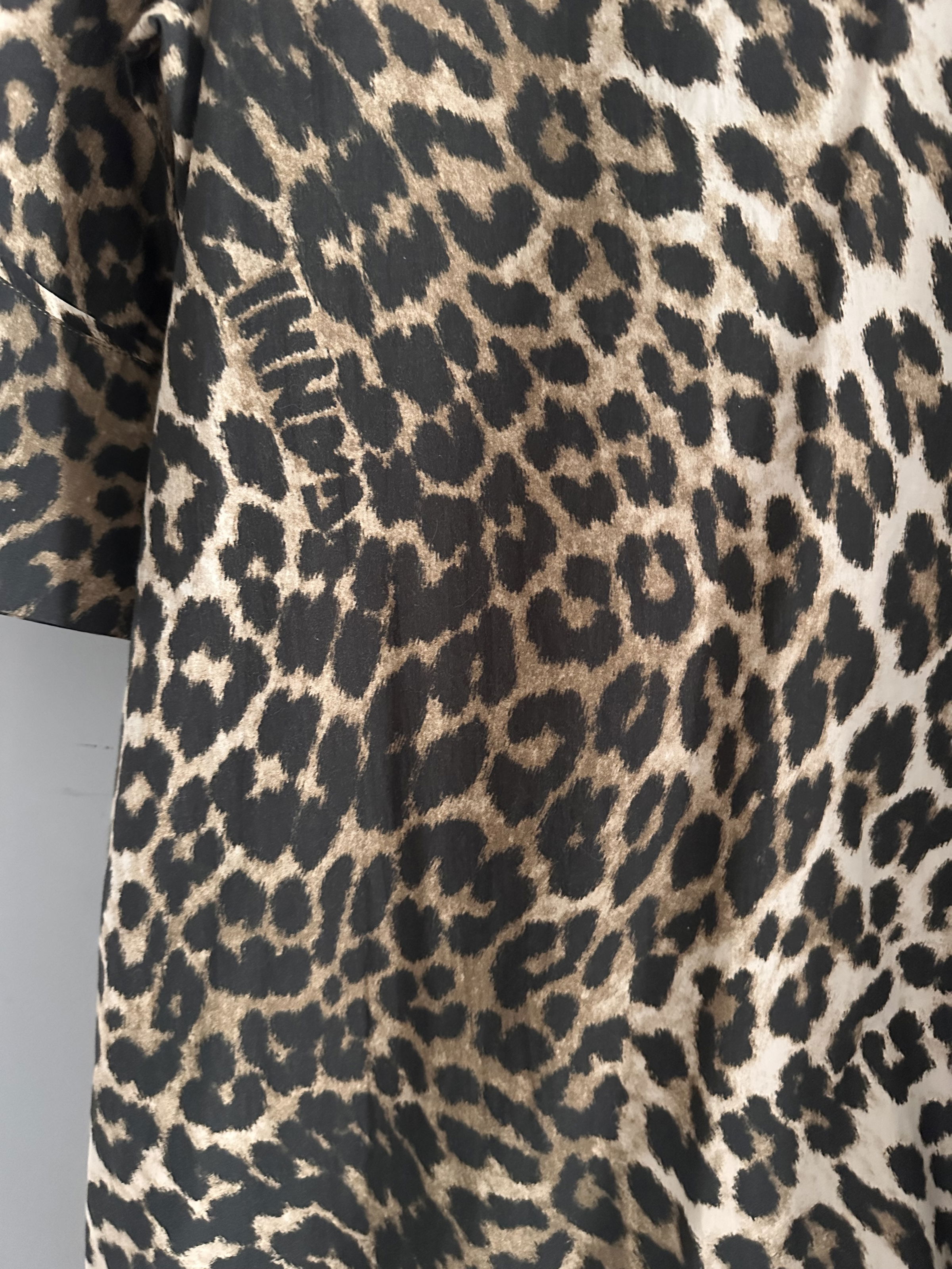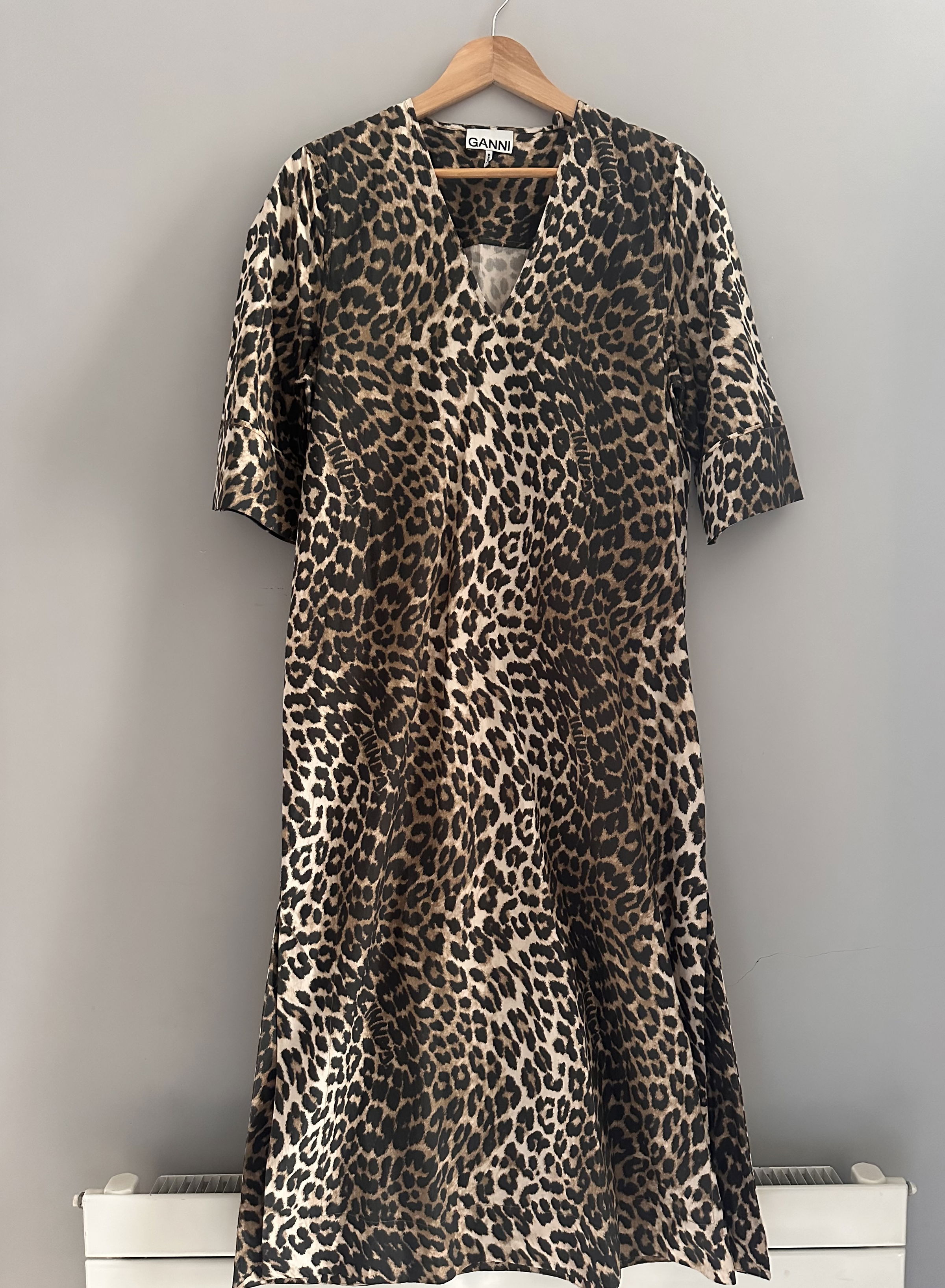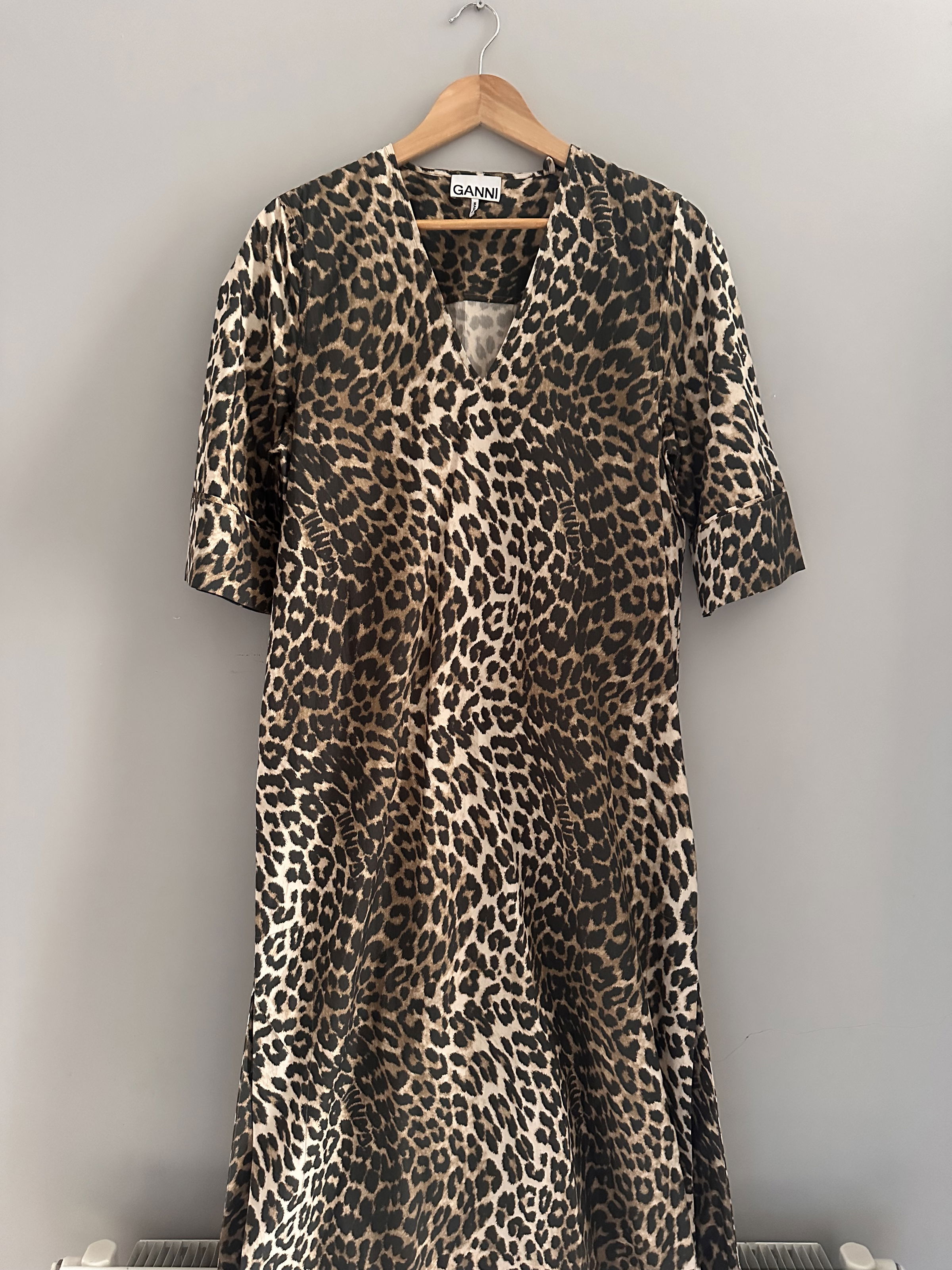 Ganni leopard print wide cotton dress V-neck, mid sleeves, side splits, relaxed fit. Organic cotton .RRP £245 EU36 UK8. Pit to pit: 20 inches length: 48 inches. Amazing condition, worn once on holiday. Cannot get hold of this anymore .Wide, casual, relaxed fit.