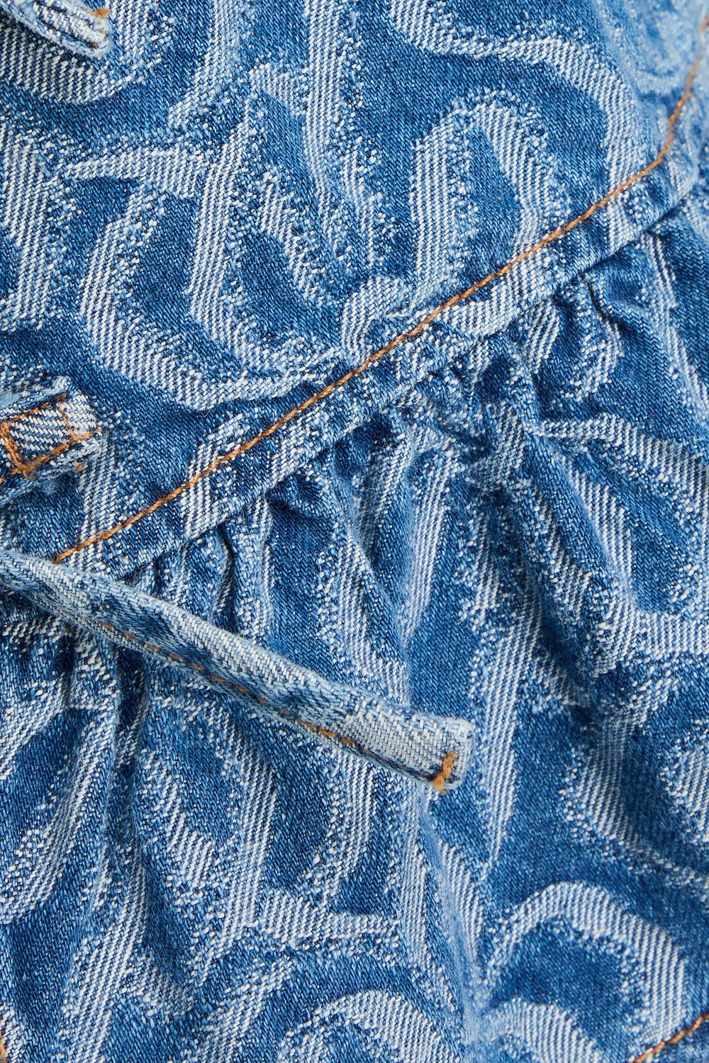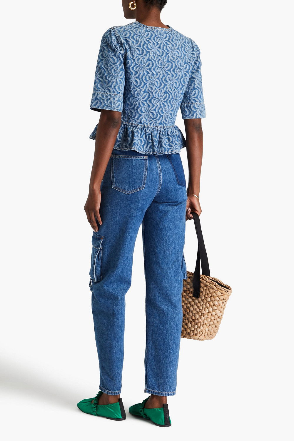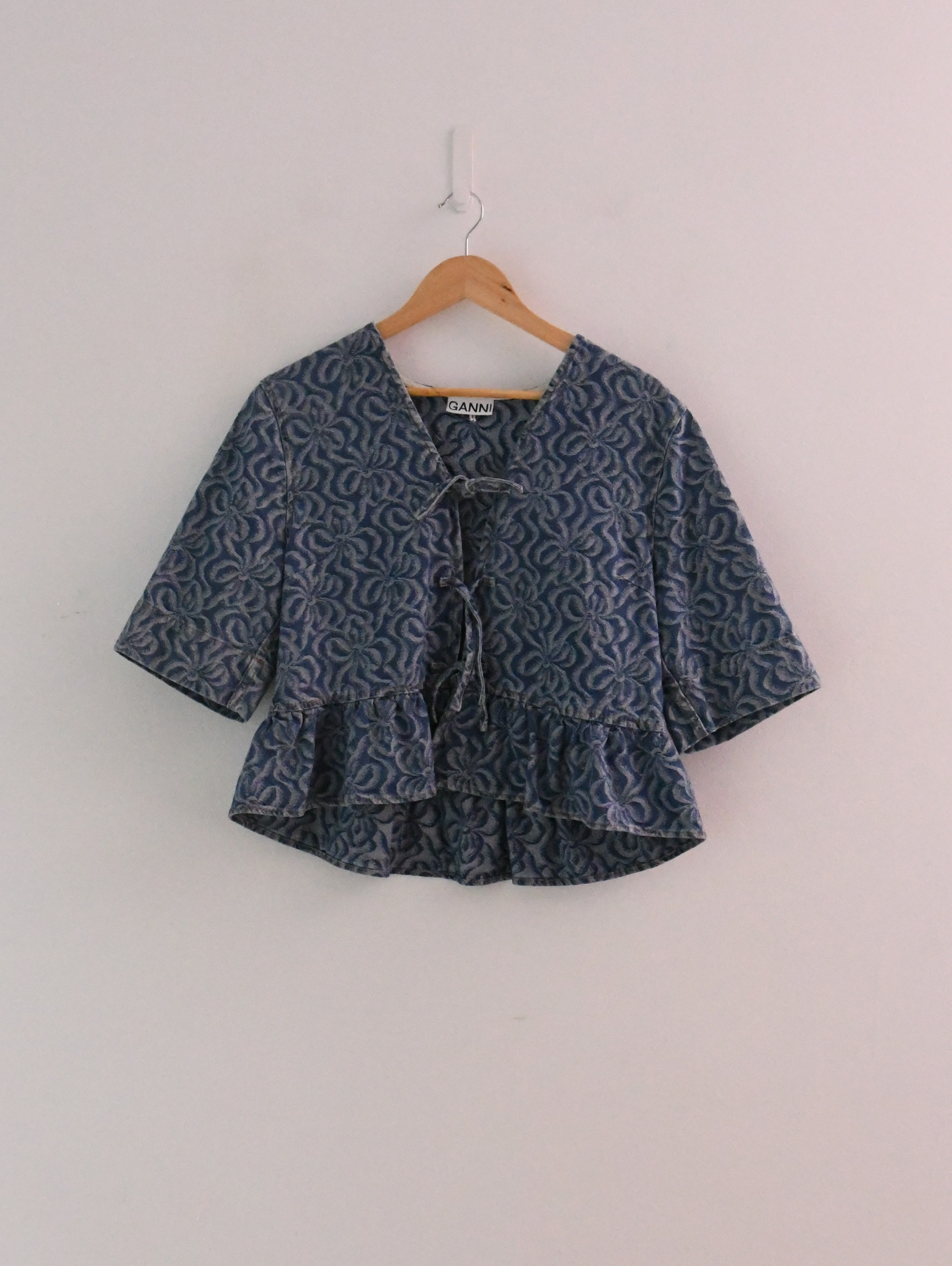 GANNI denim blouse Textured floral jacquard, crew-neck, keyholes through front, pleated peplum hem, contrast stitching. Tie fastenings through front. ( See my other items for matching jeans)