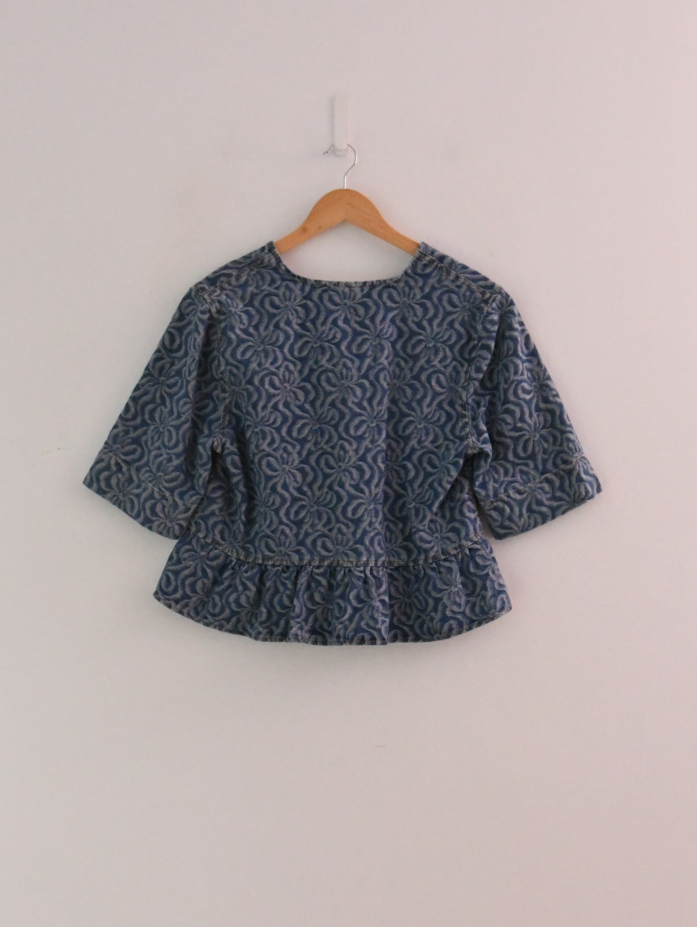 Description: Top, Denim, Jacquard, Peplum, Ties at front, Mid-weight, non-stretchy fabric, Machine wash, Imported Materials: 100% Organic Cotton Product Code: 46376663162835833