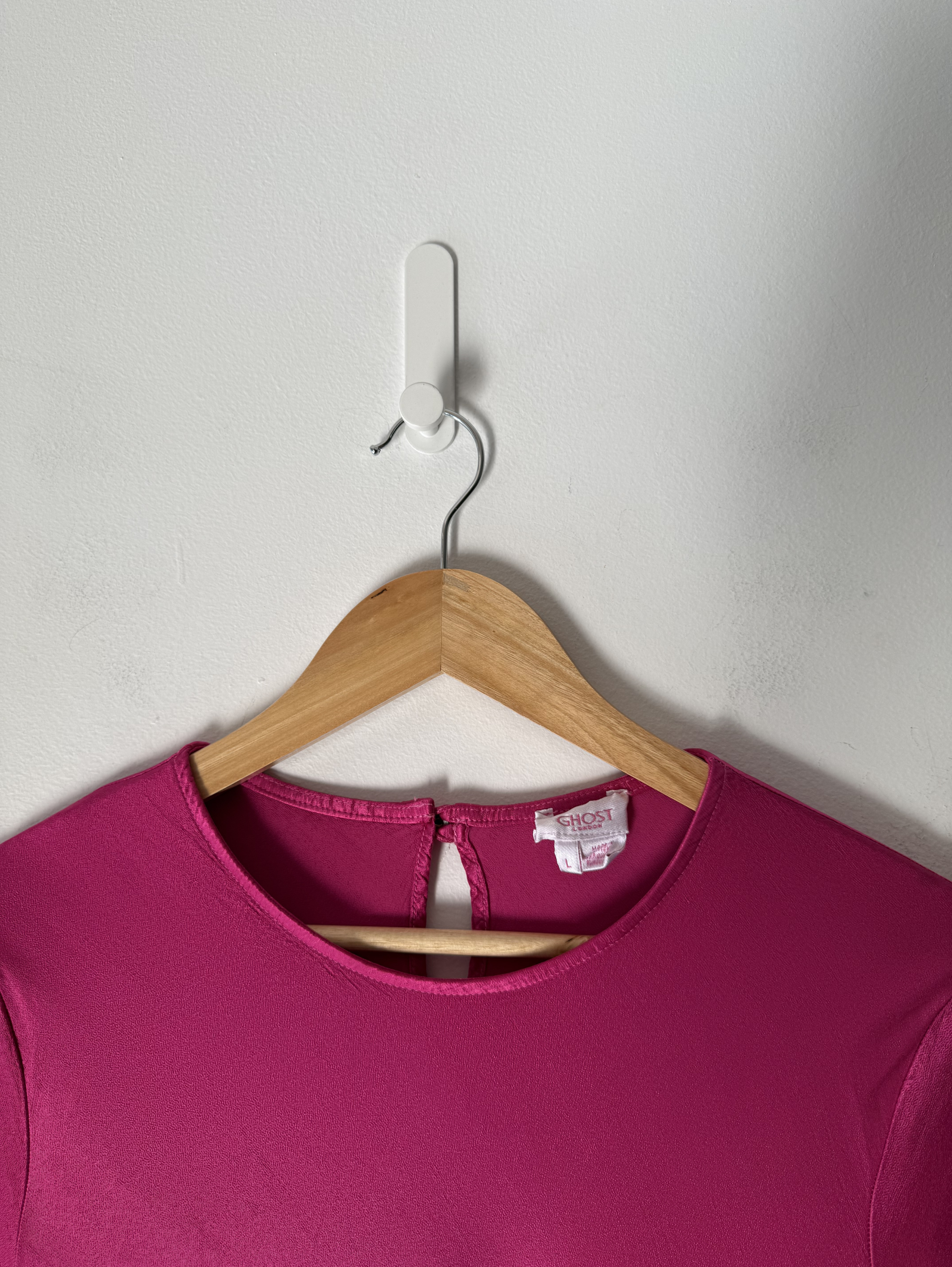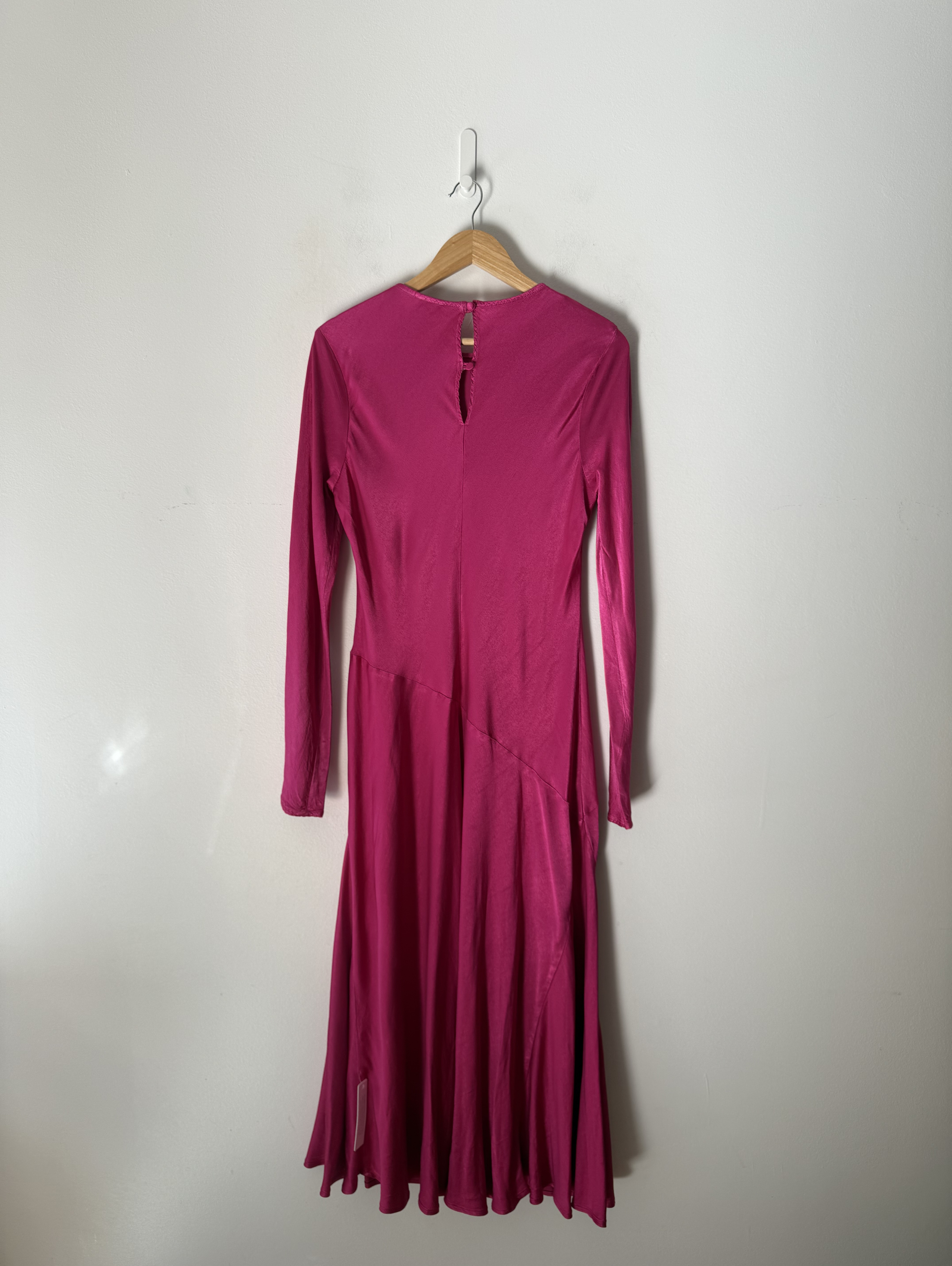 Lois Fuchsia Satin Long Sleeve Midi Dress with round neck.