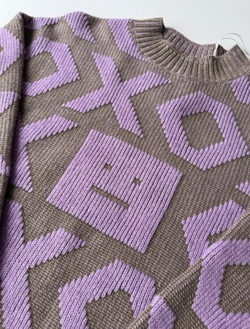 Face crewneck sweater. Seamlessly blending scandi chic with contemporary boldness, it’s decorated with a two-tone XOXO animated knit across the body. 66% wool 34% cotton. Dry Clean only