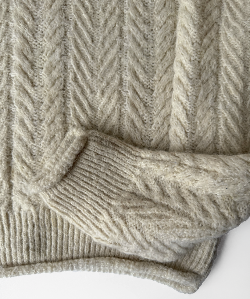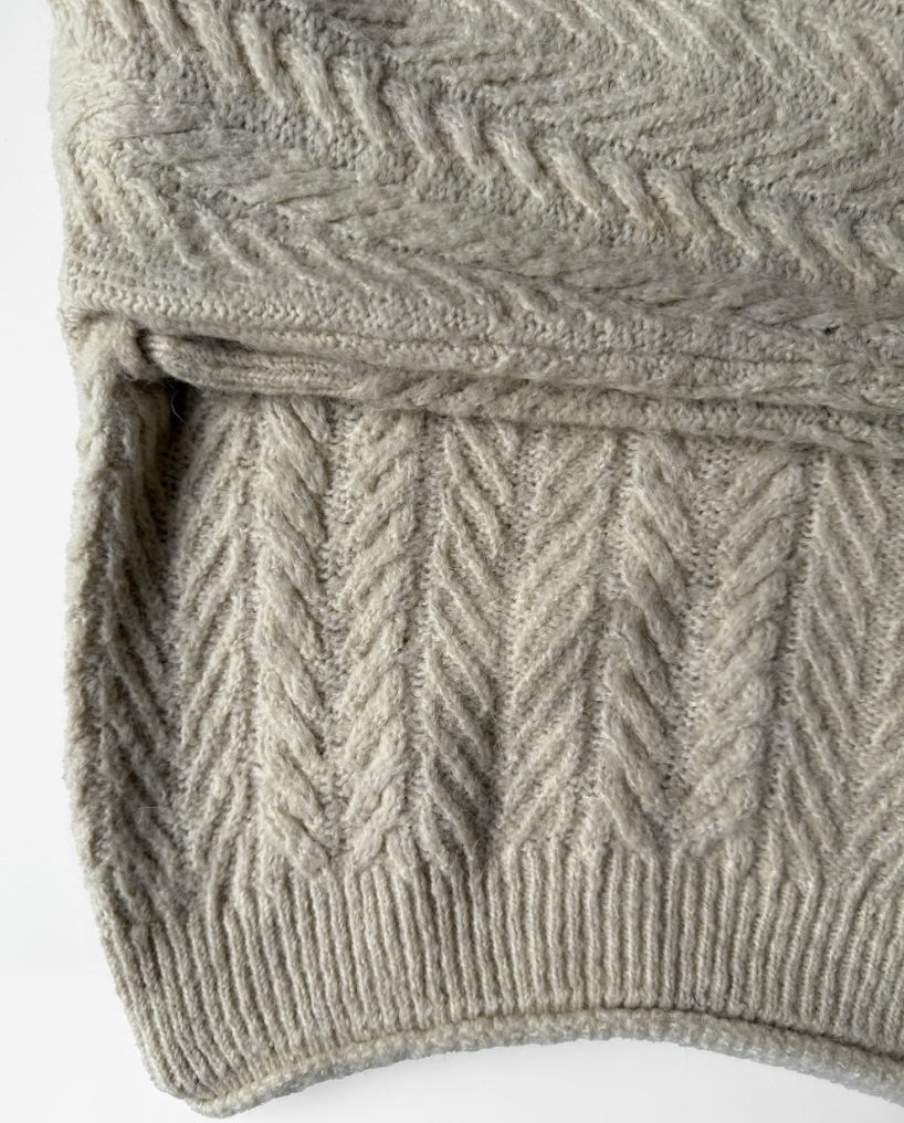 Knitted fabric, herringbone design, straight design, high collar, long sleeve, shoulder pads.