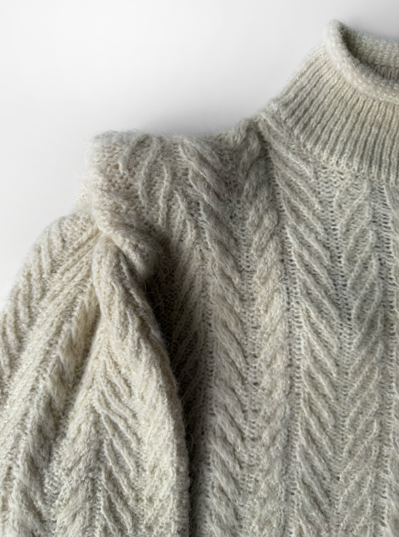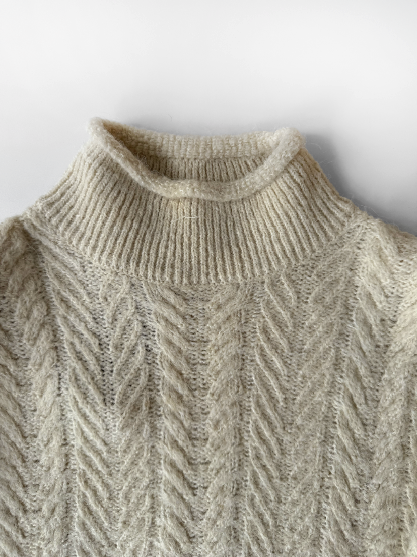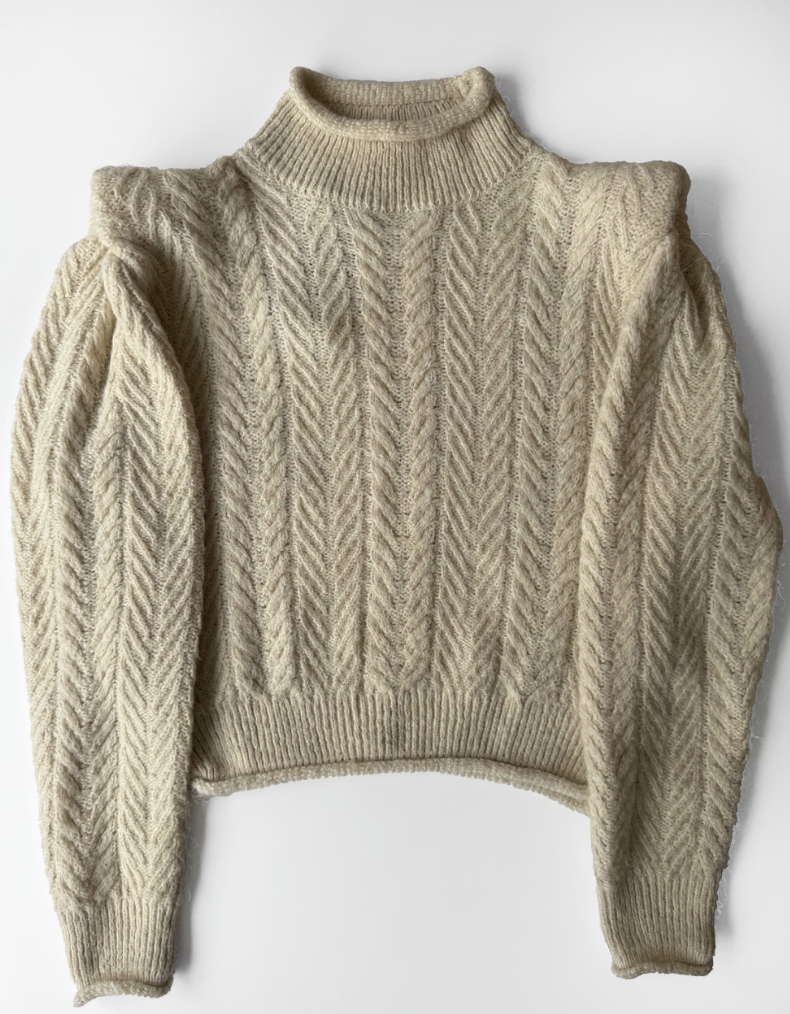 Cream high-neck jumper in perfect, never worn condition with structured shoulder pads. Composition: 57% acrylic, 21% polyester, 12% alpaca, 10% polyamide.