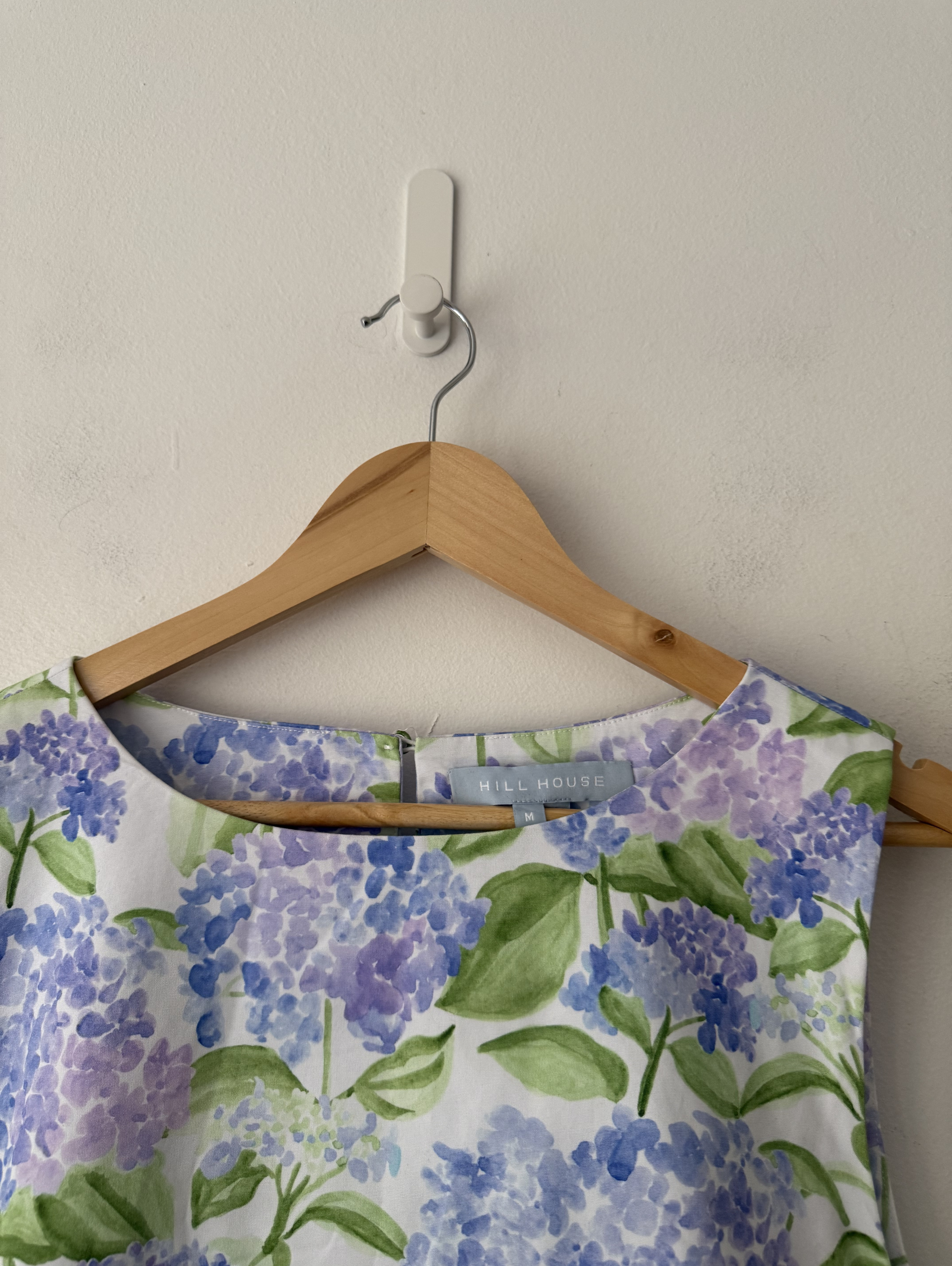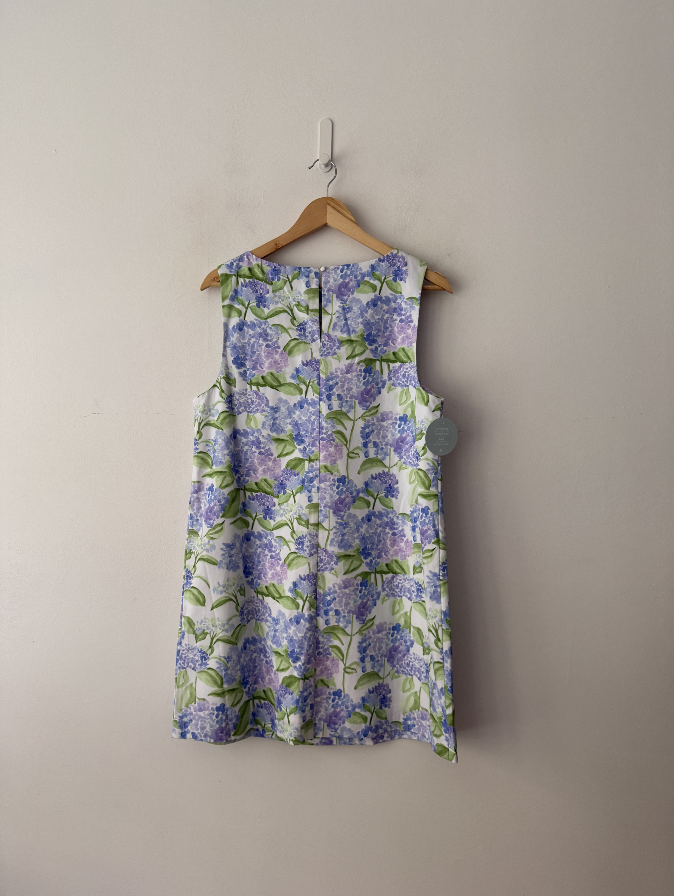 The Charlie A line, sleeveless cotton dress with blue hydrangea print.