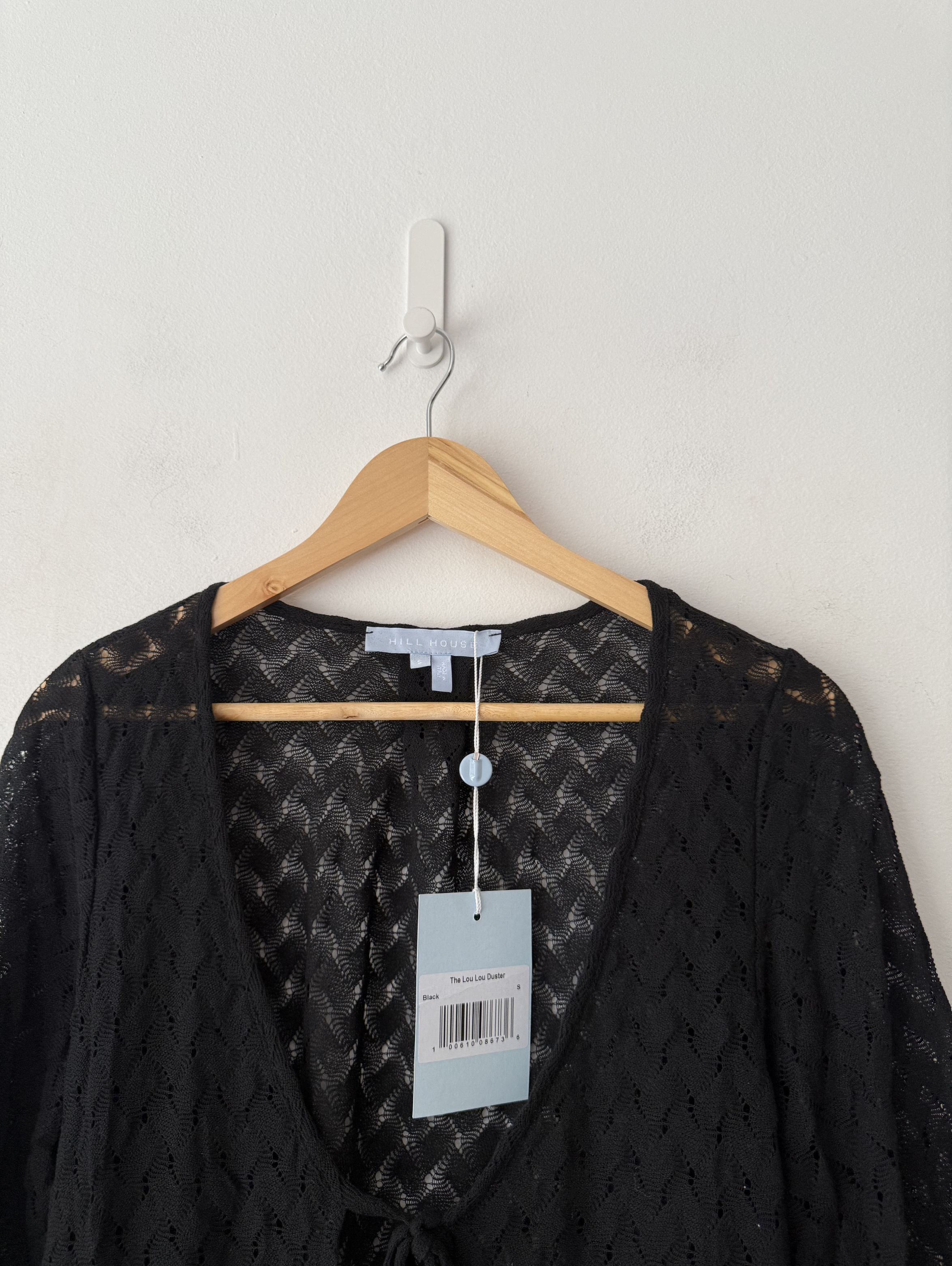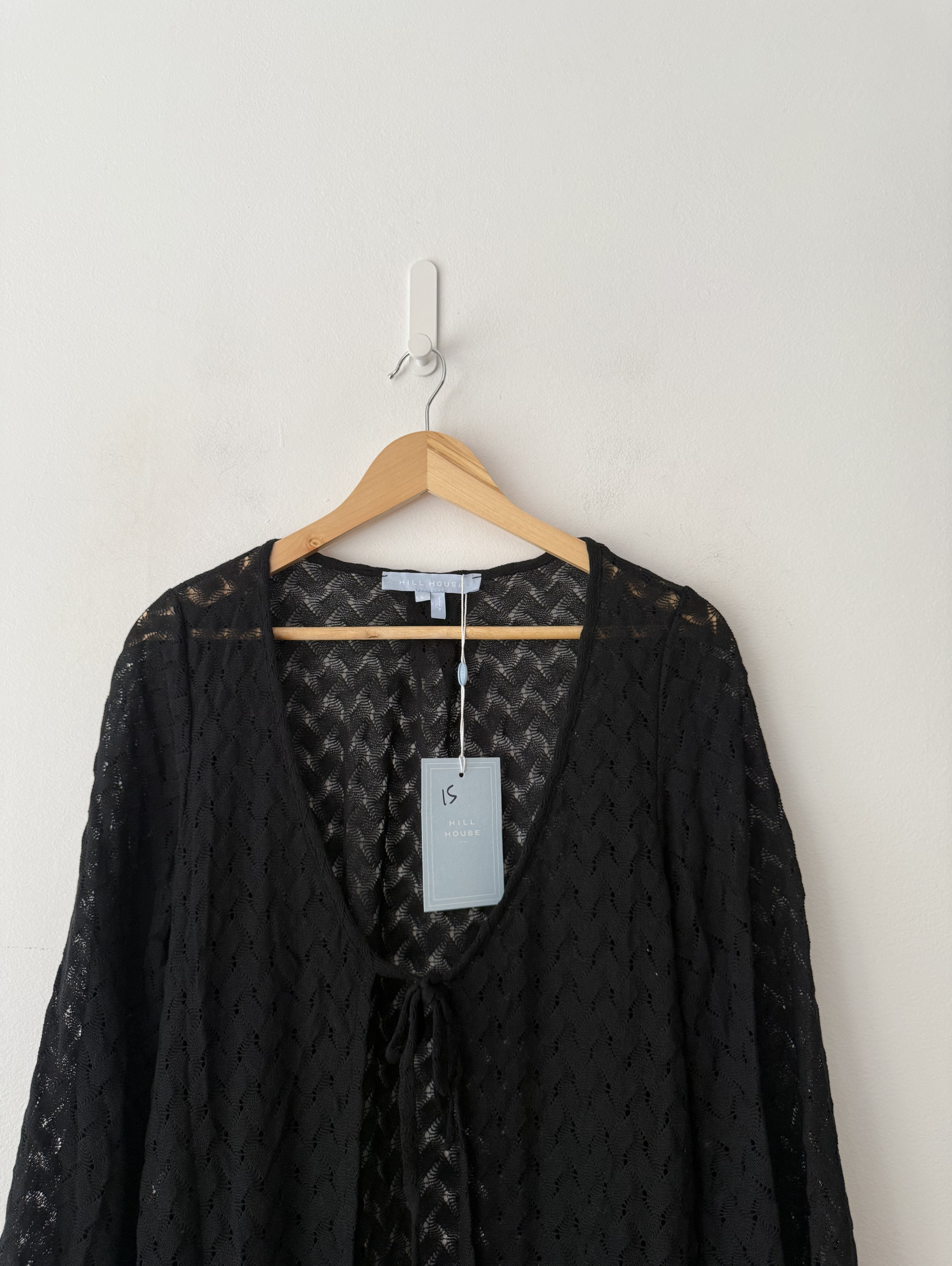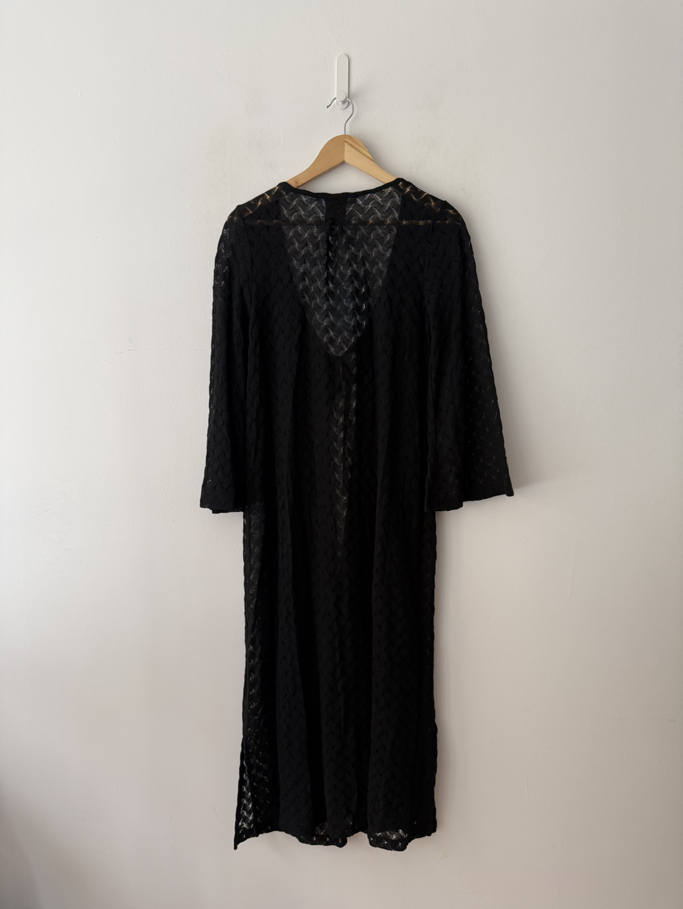 The Lou Lou is a long jacket with a subtle puff shoulders, bell sleeve, tie closure and back slit