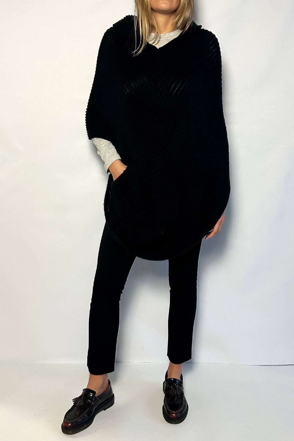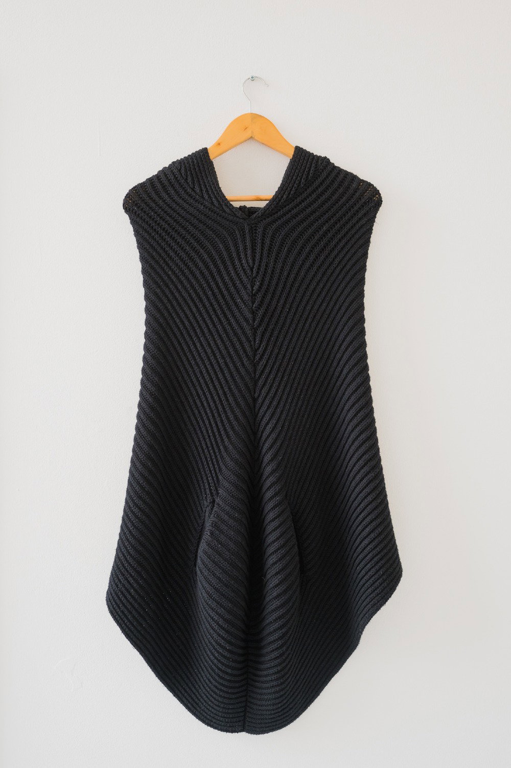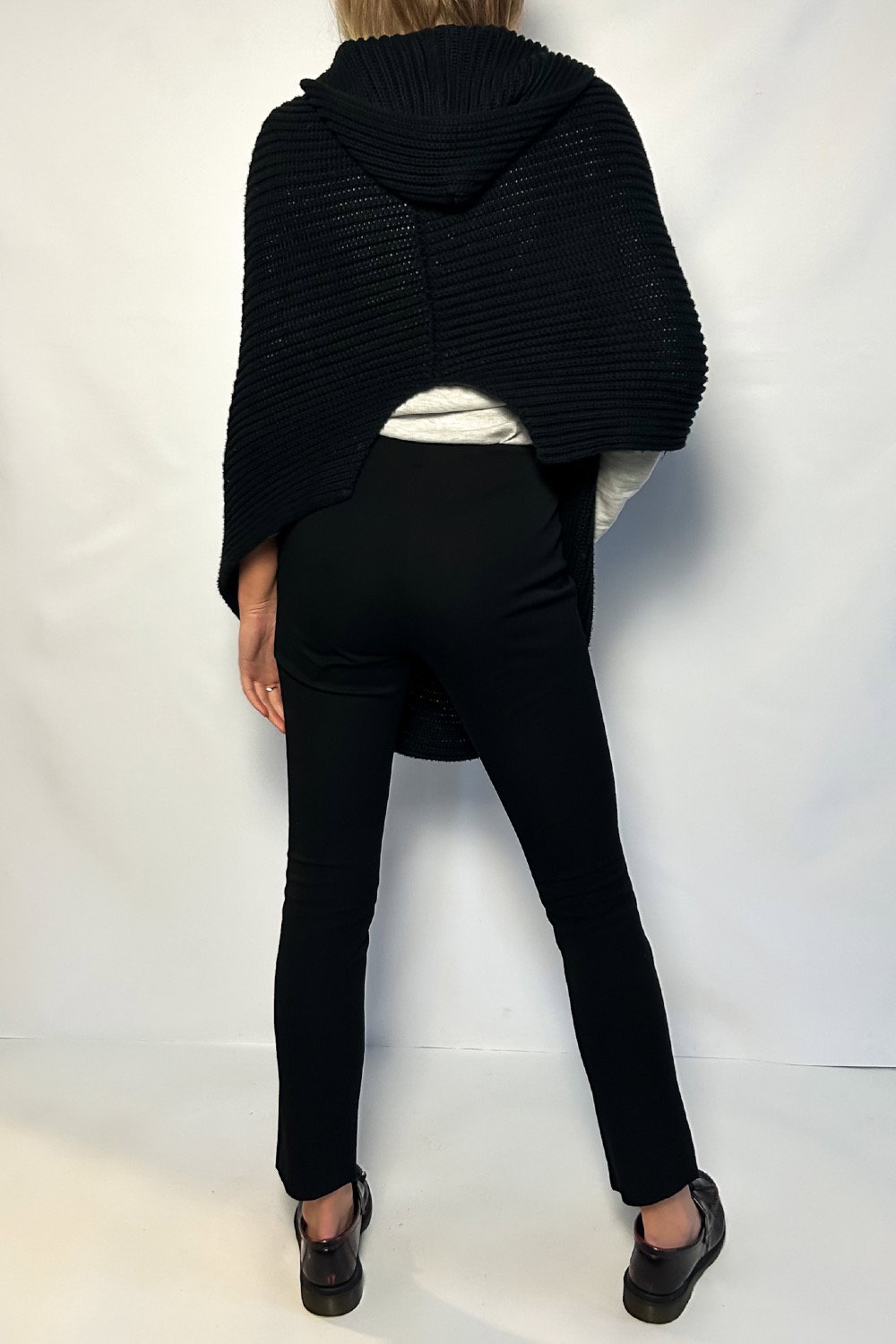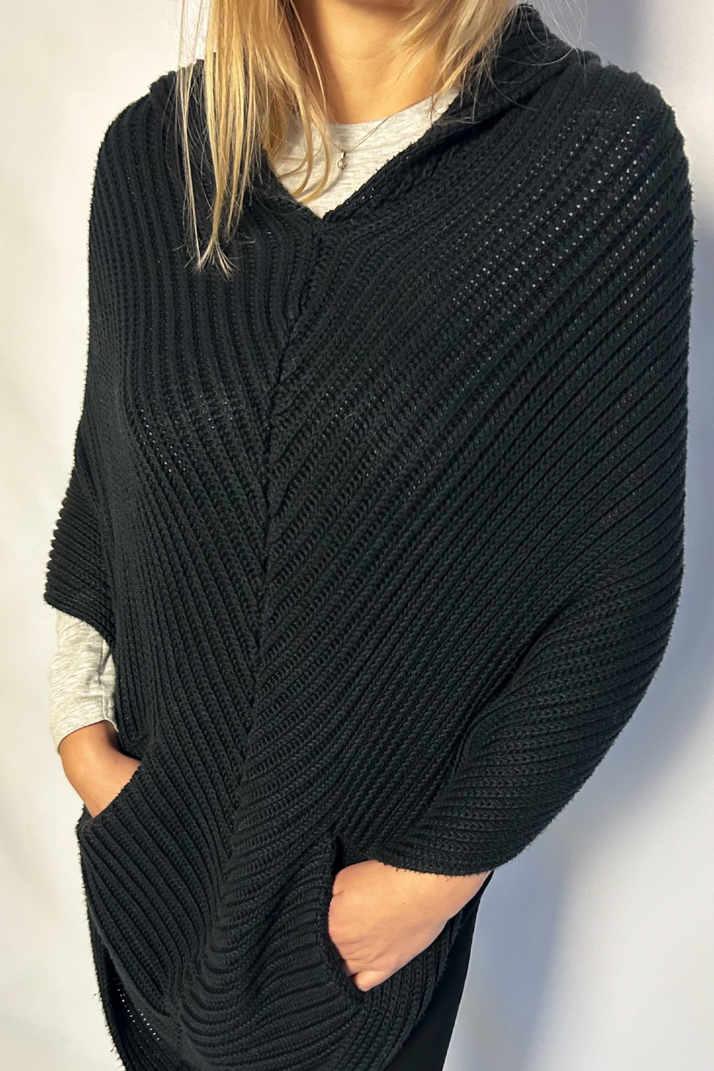This knitted poncho has a hood with two front waist opens and an open back...an elevated version of a knitted cardigan!