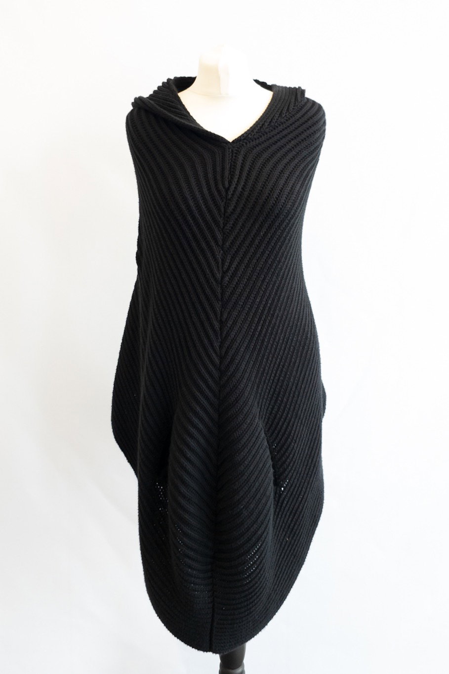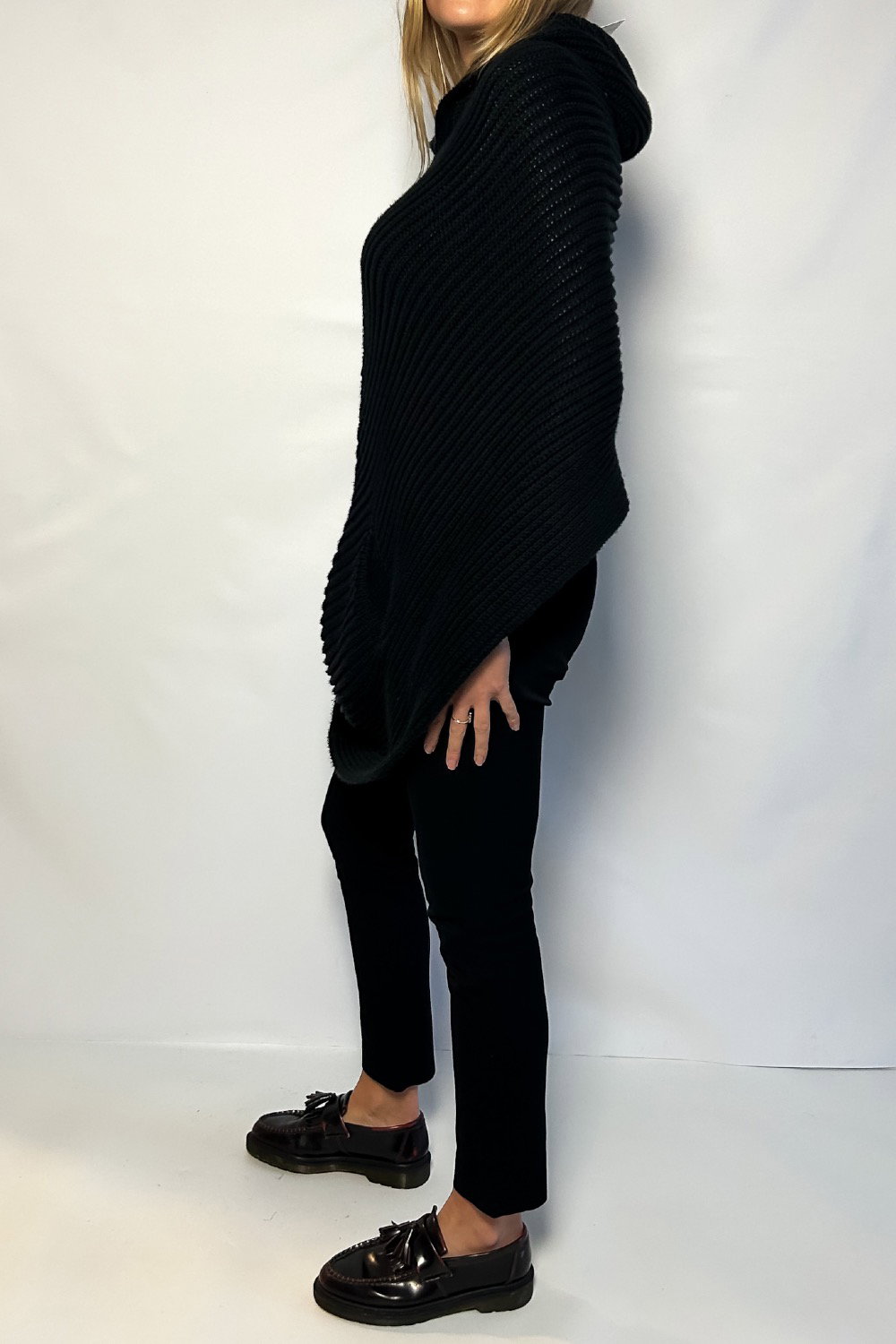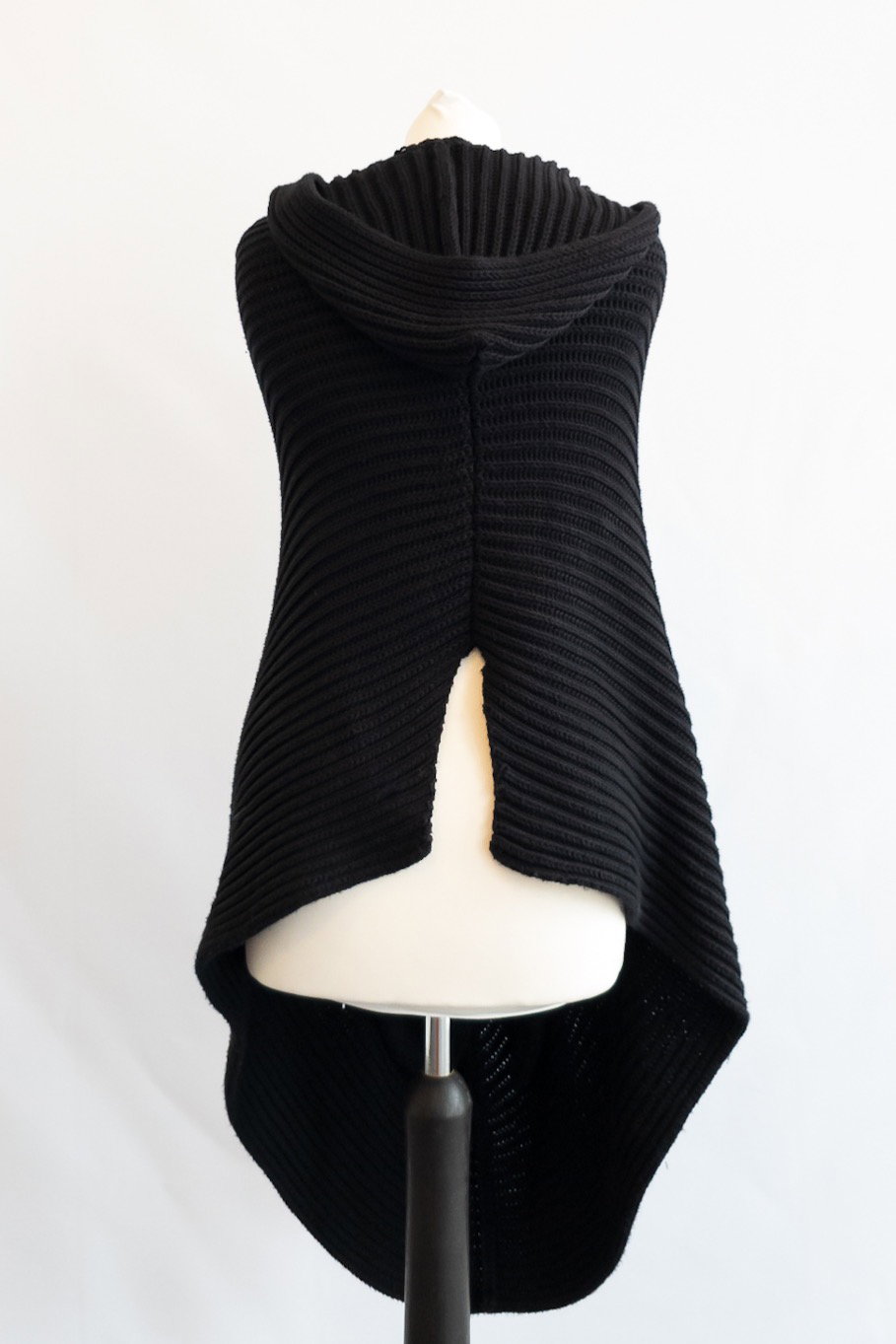 This knitted poncho has a hood with two front waist opens and an open back...an elevated version of a knitted cardigan!