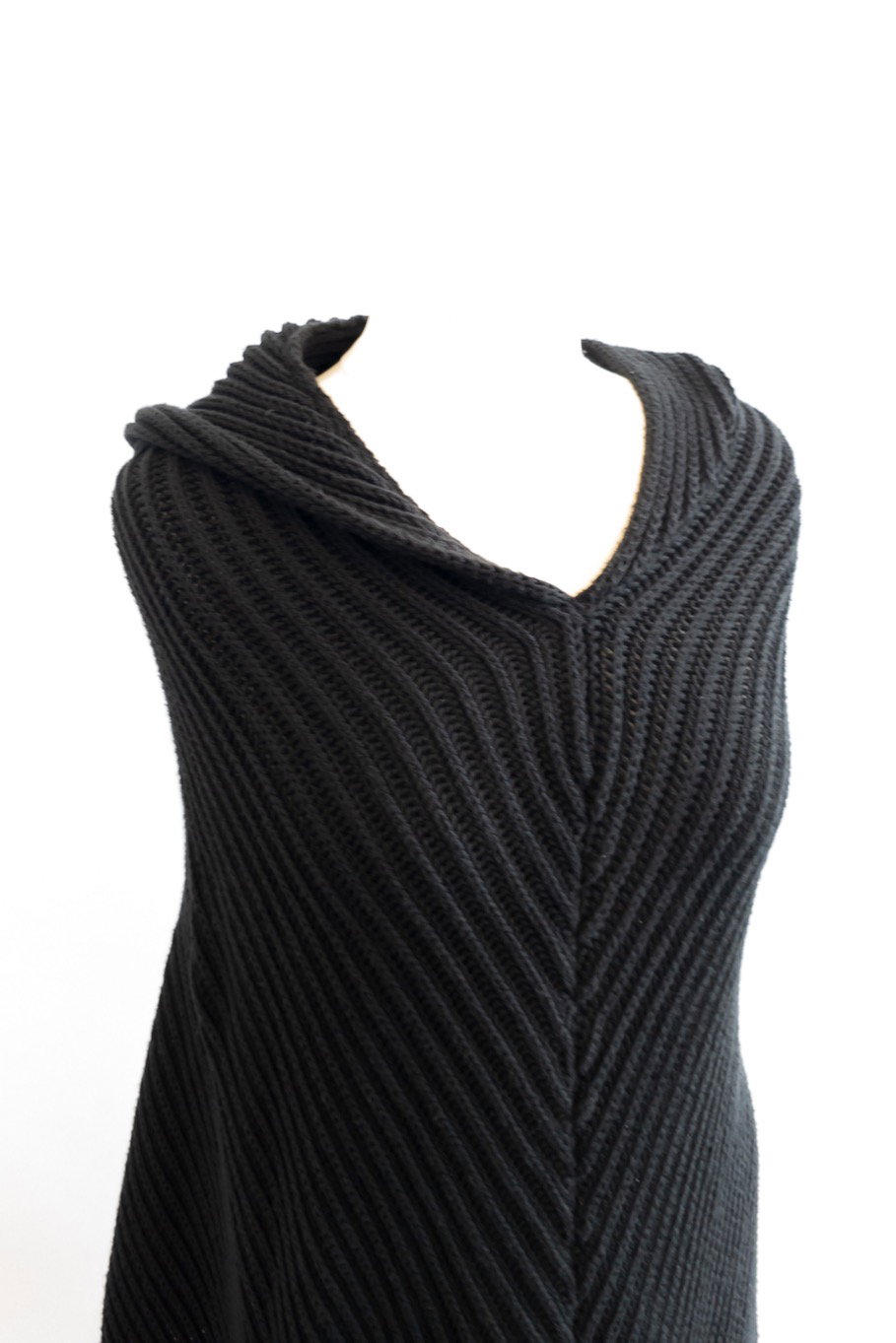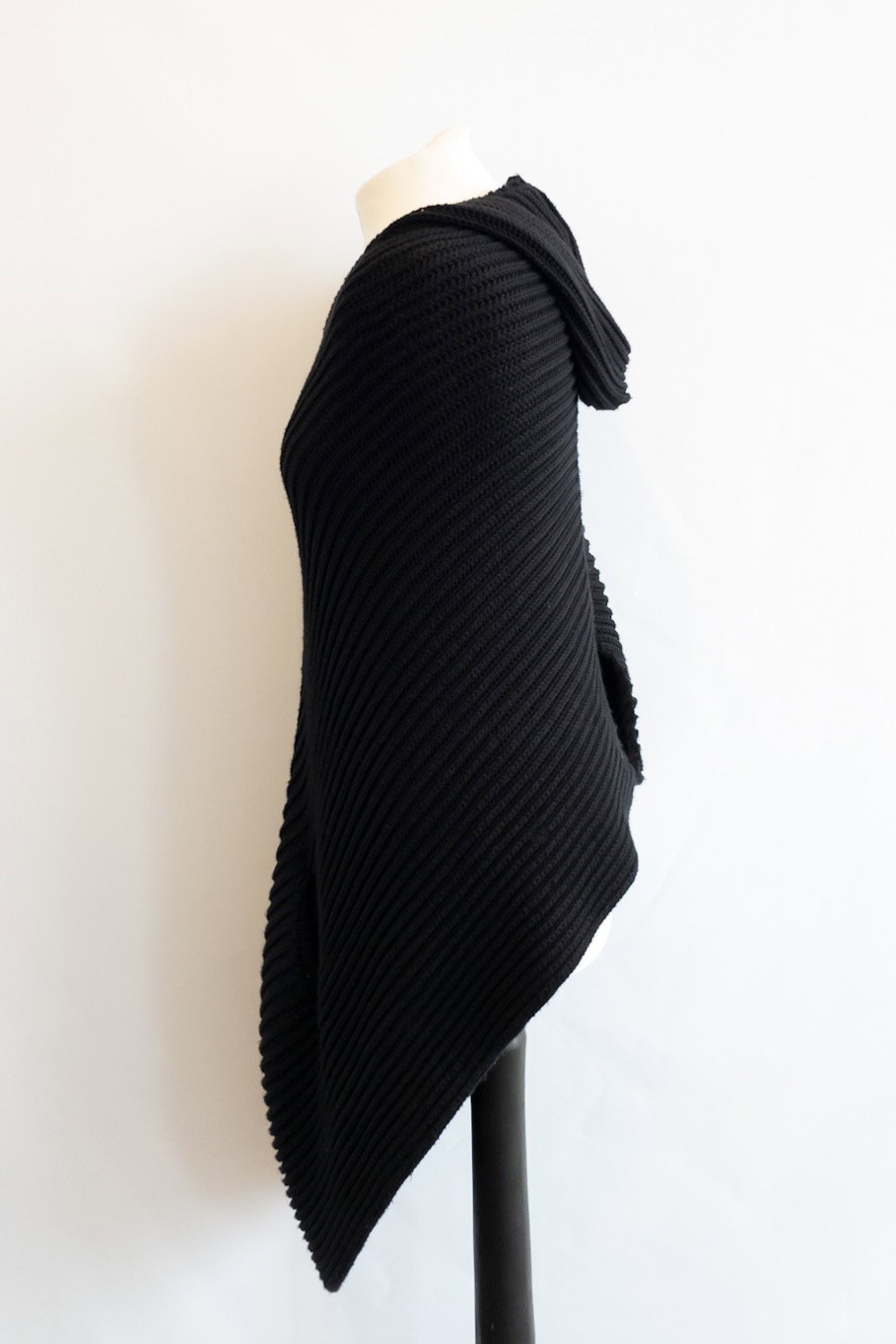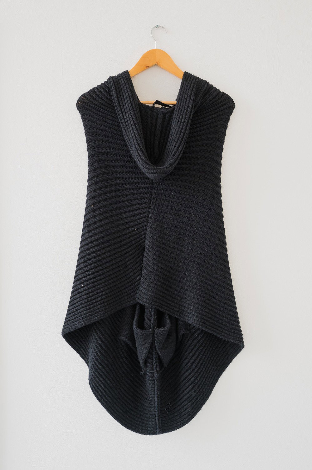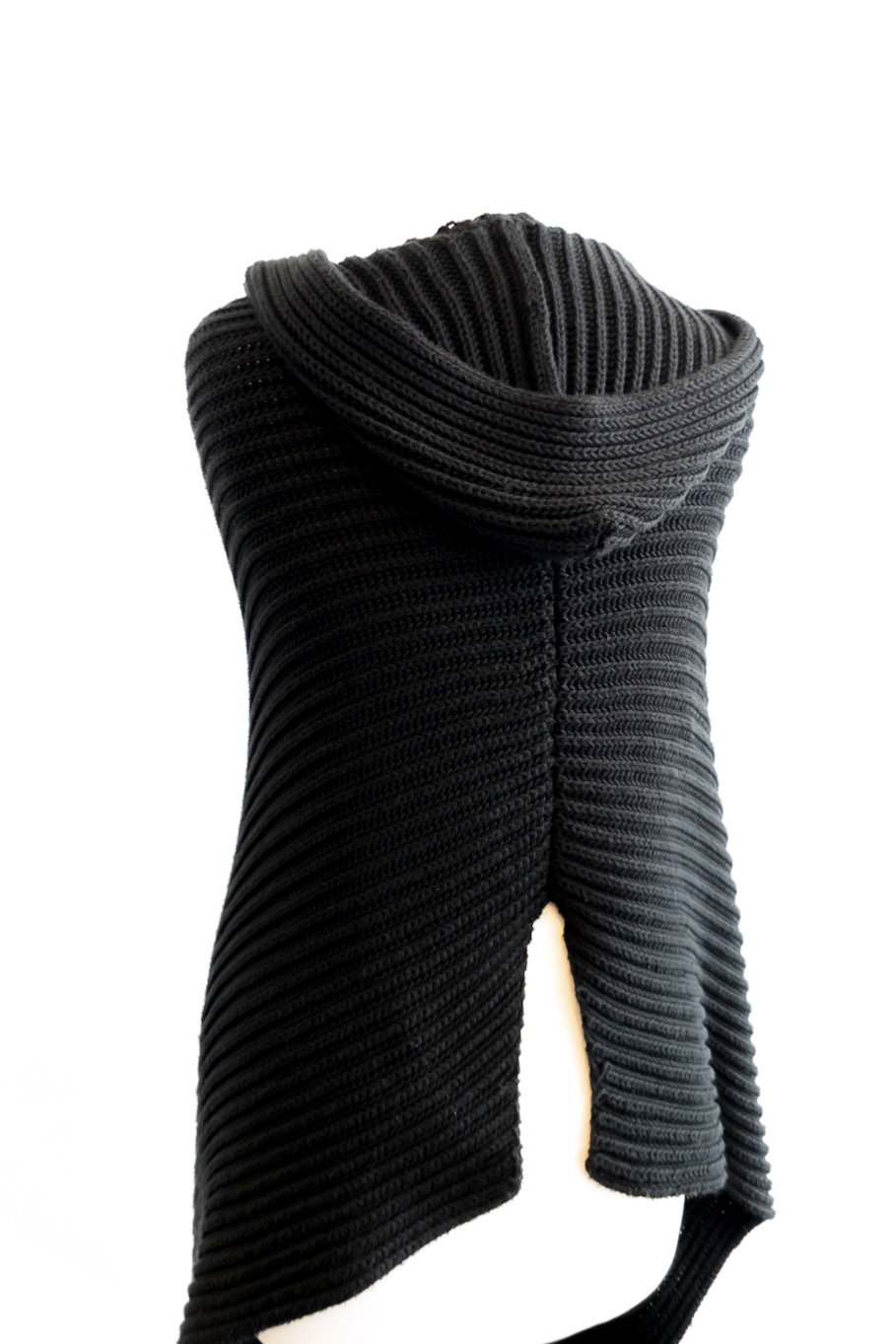 This knitted poncho has a hood with two front waist opens and an open back...an elevated version of a knitted cardigan!