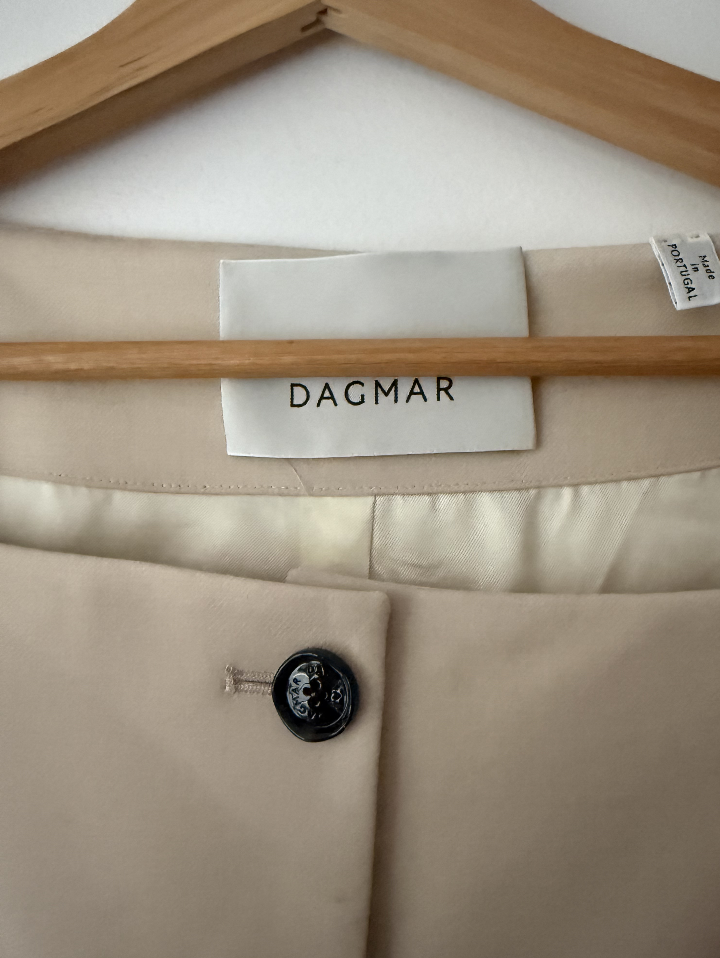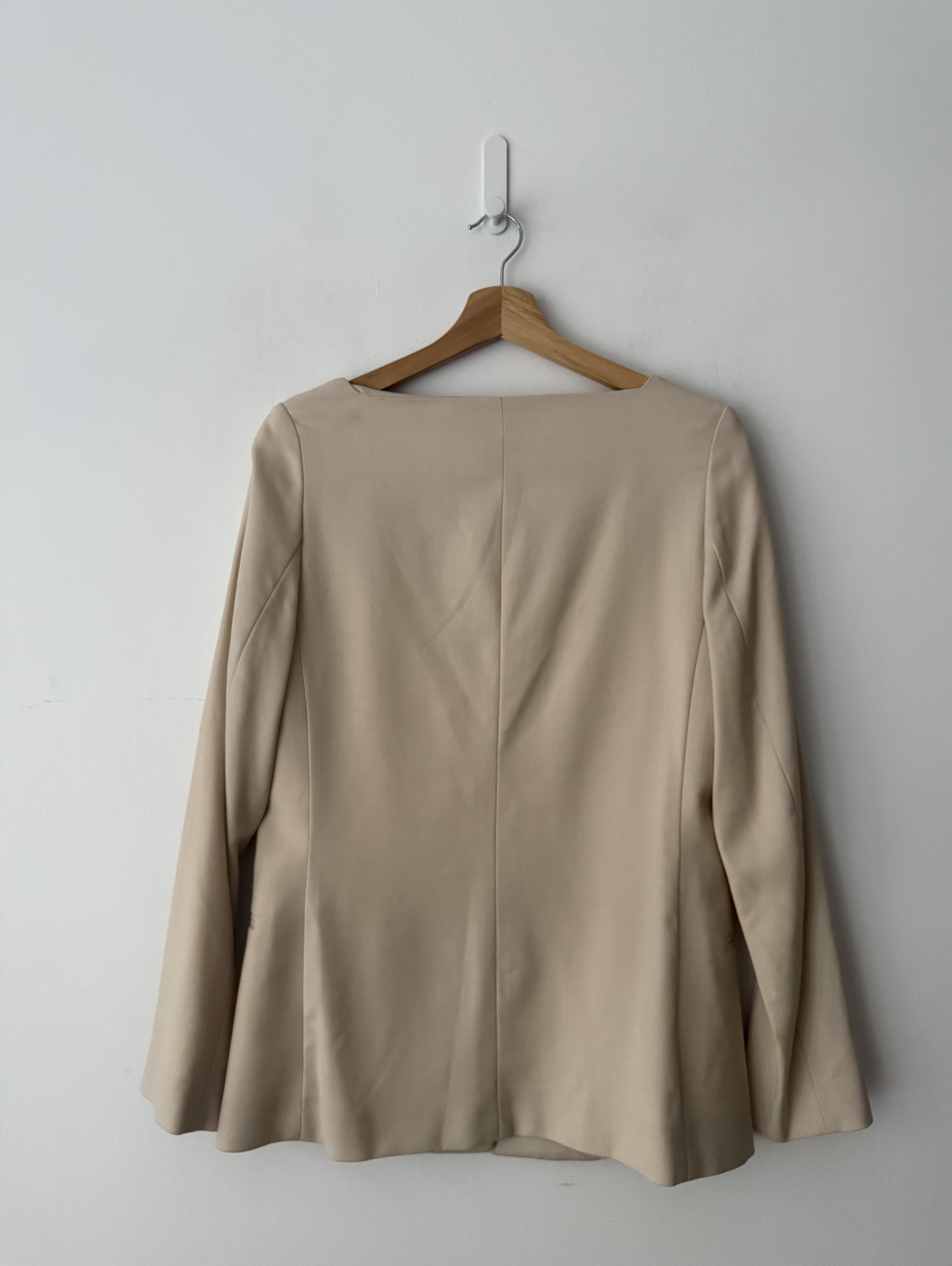 Collarless blazer in lightweight wool suiting with a fitted frame, square neckline, bespoke black buttons, and softly tailored shoulders. Fully lined.