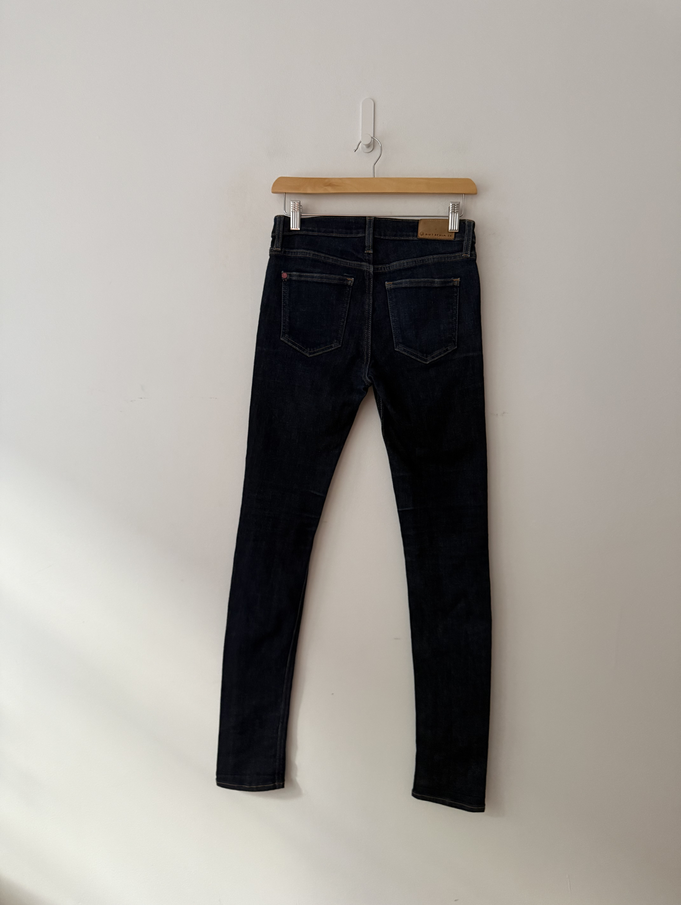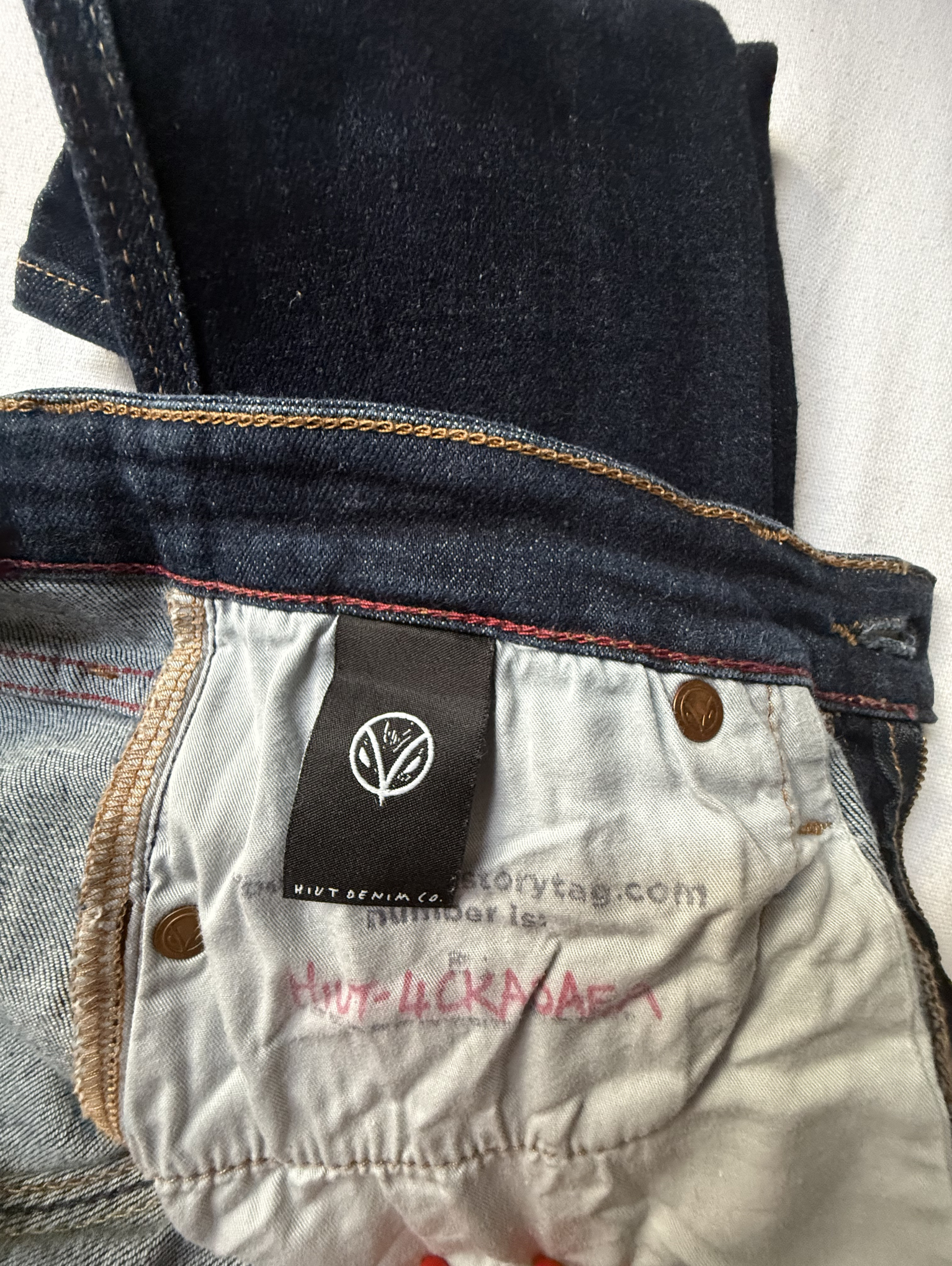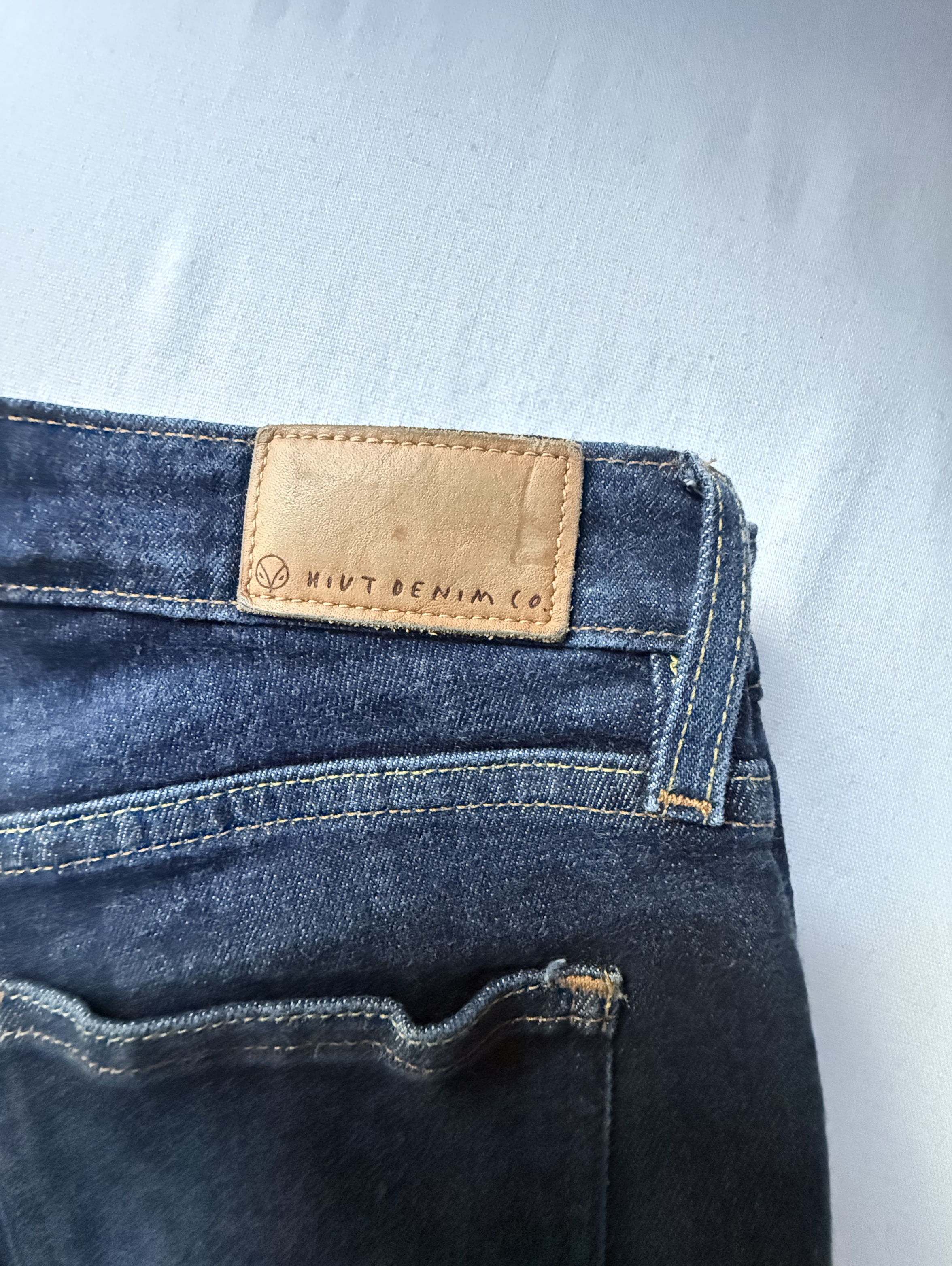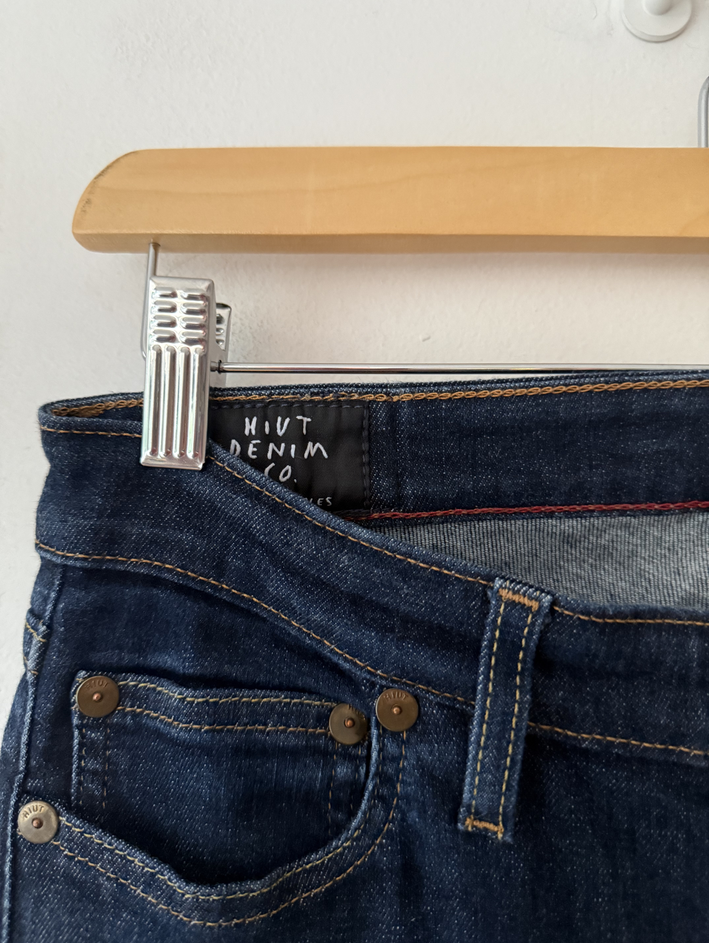 Button fly. Hiut Denim branded leather patch. Fastened with copper rivets on pockets. Tough ecru twill pocket lining. Signature red owl rivet on left back pocket.