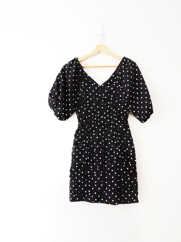 Black and white polka dot ruched mini dress in excellent, pre-worn condition with gold button details. Composition: 98% cotton 2% elastane.