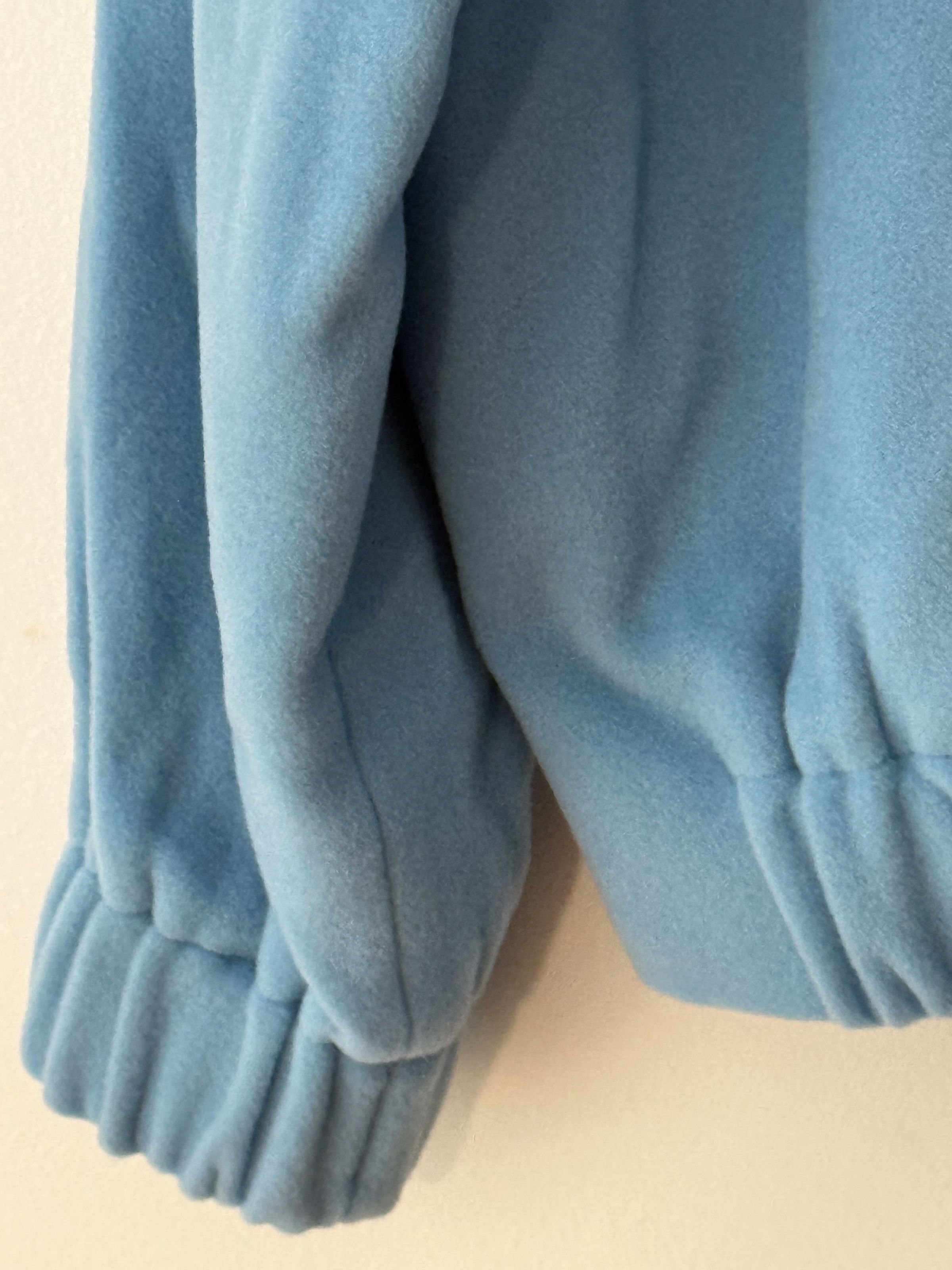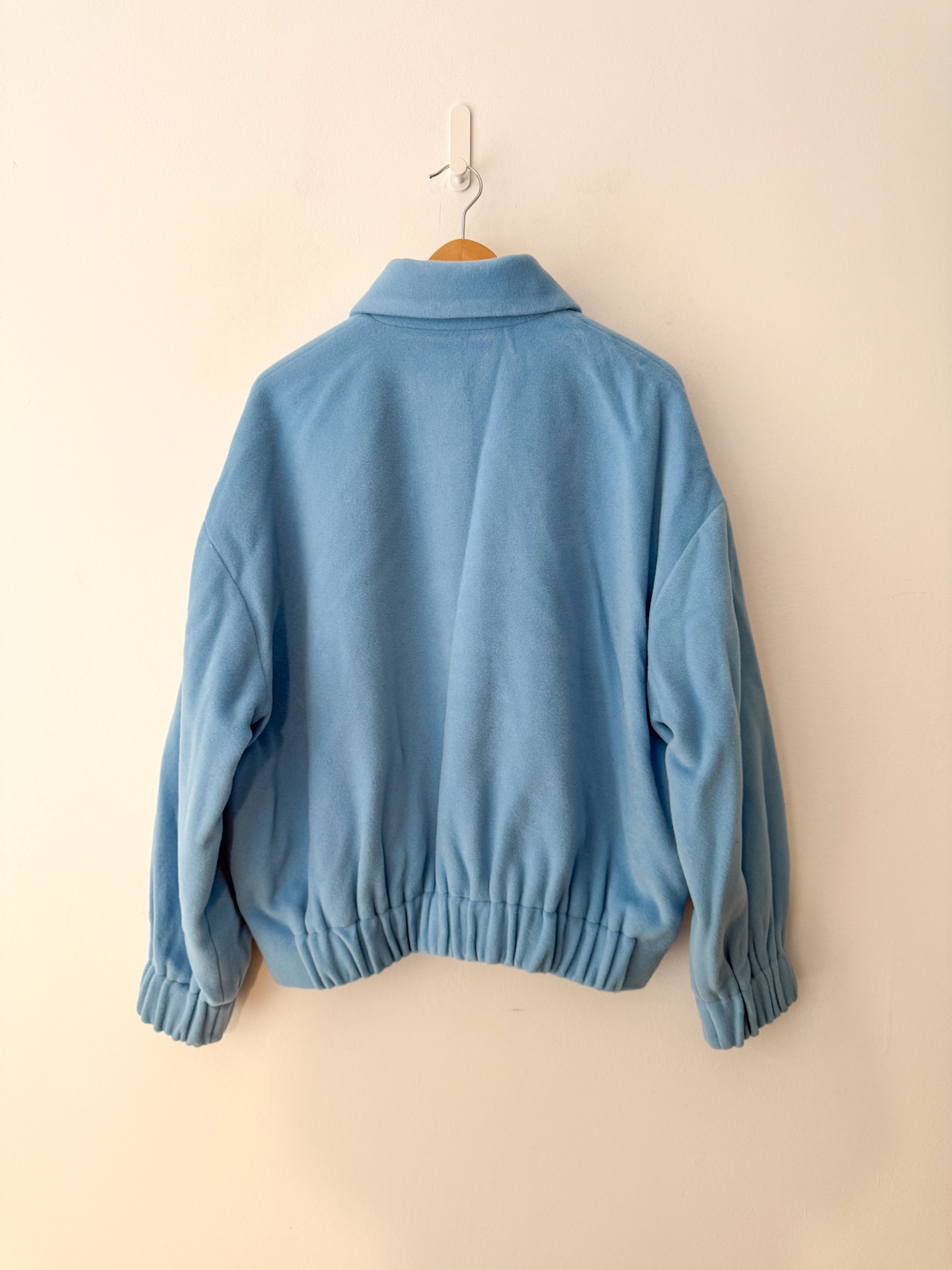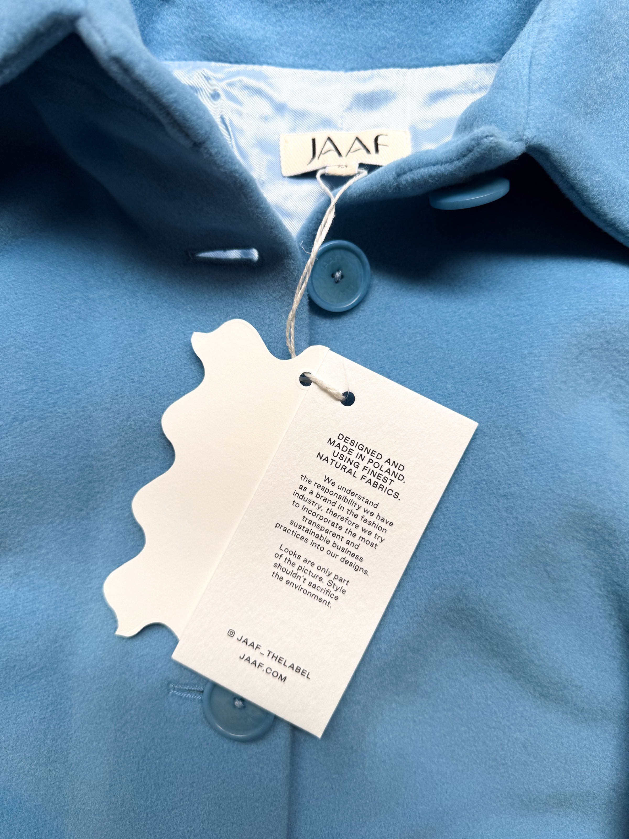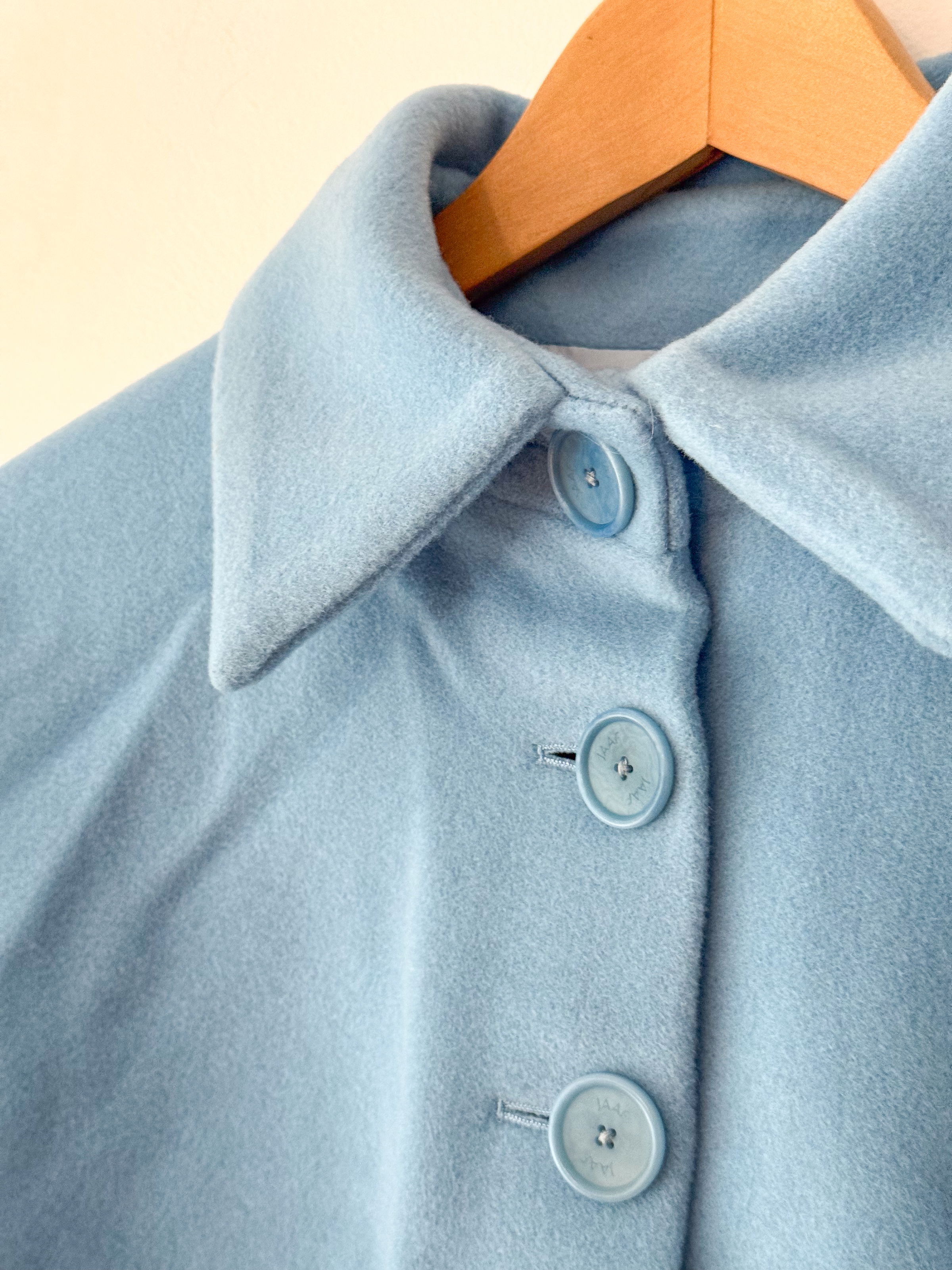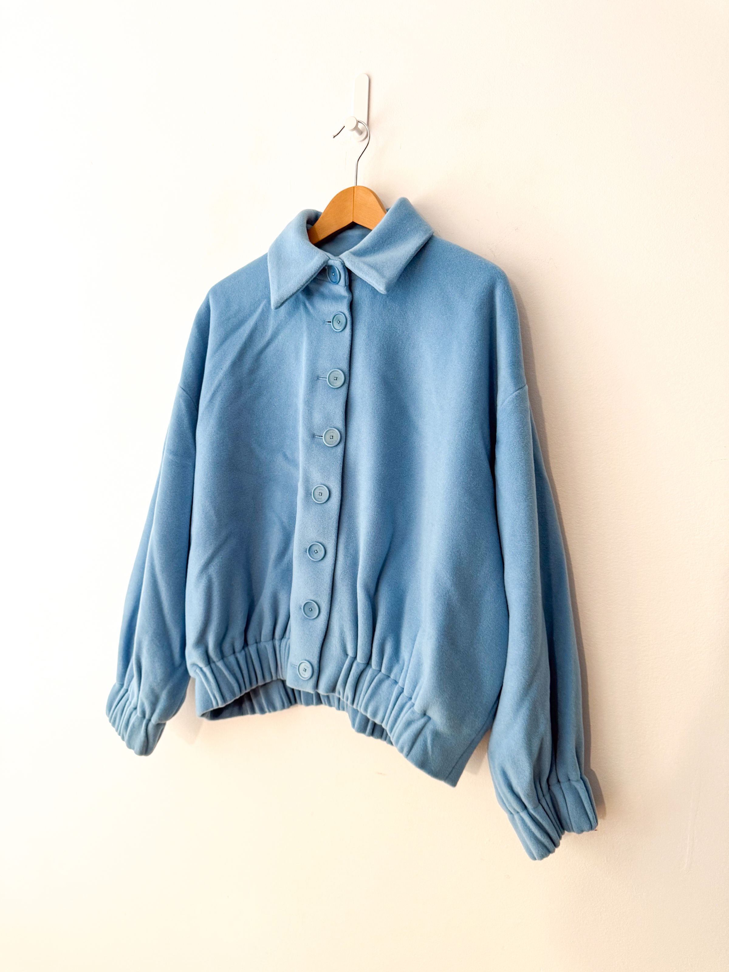 Add a pop of color to your outerwear collection with this light blue jacket. Crafted from a soft, cozy fabric, this jacket is designed with a relaxed, slightly cropped silhouette that makes it perfect for layering. The jacket features a classic collar, button-down front, and elasticated cuff.