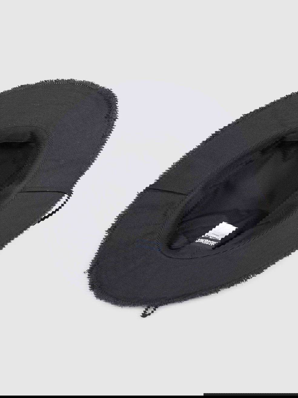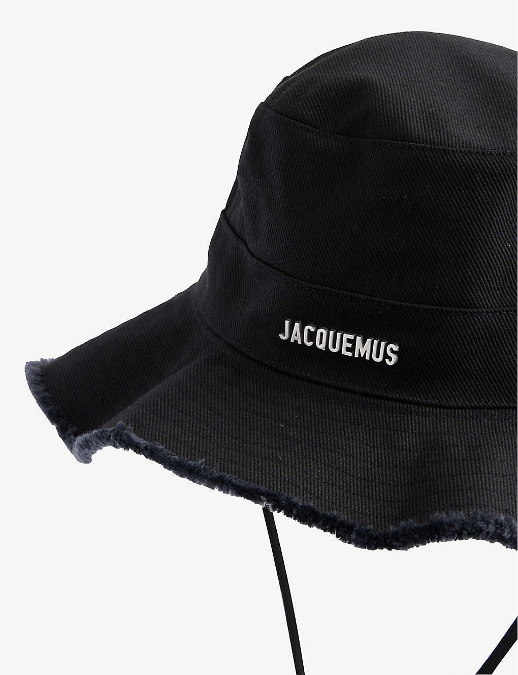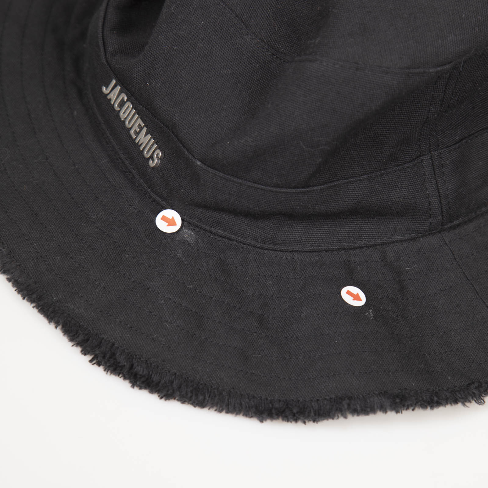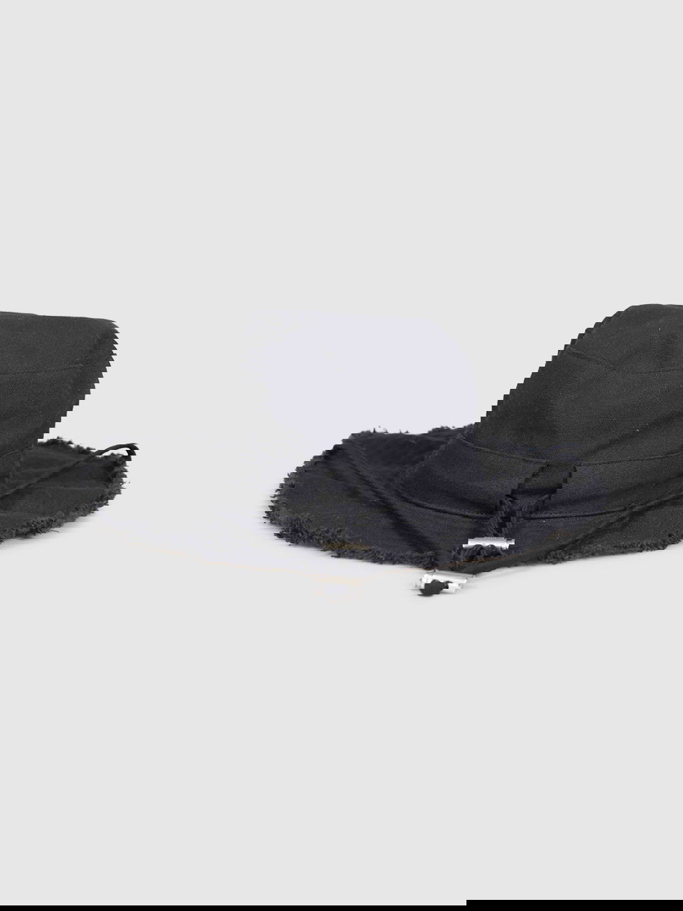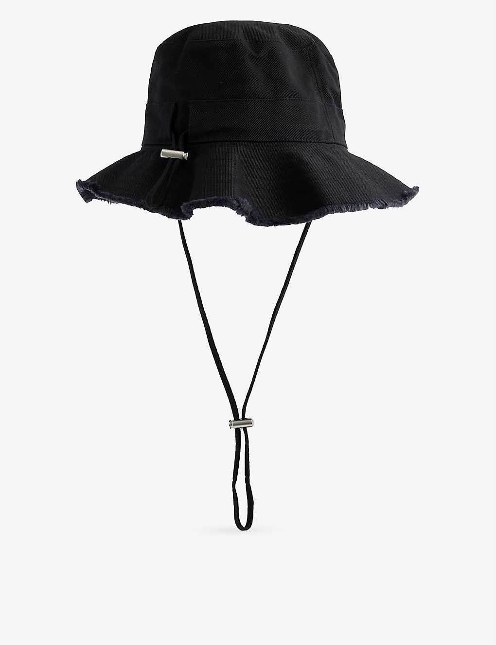 Black cotton sun hat in excellent, pre-worn condition. See images for signs of wear. Front logo, drawstring strap, raw edge. Composition: 100% cotton. Measurements: circumferences: 60cm, brim: 8cm, height: 8cm.