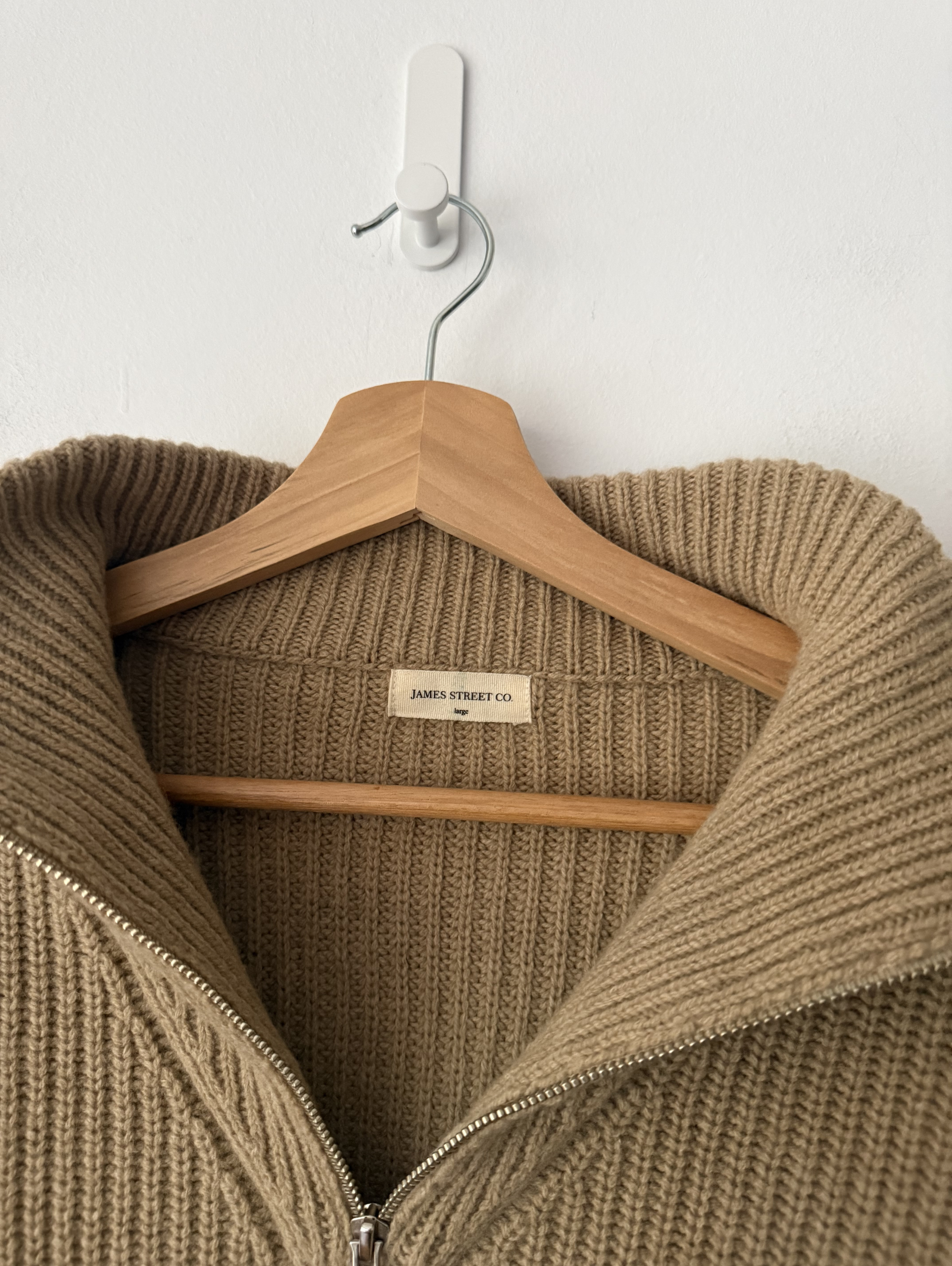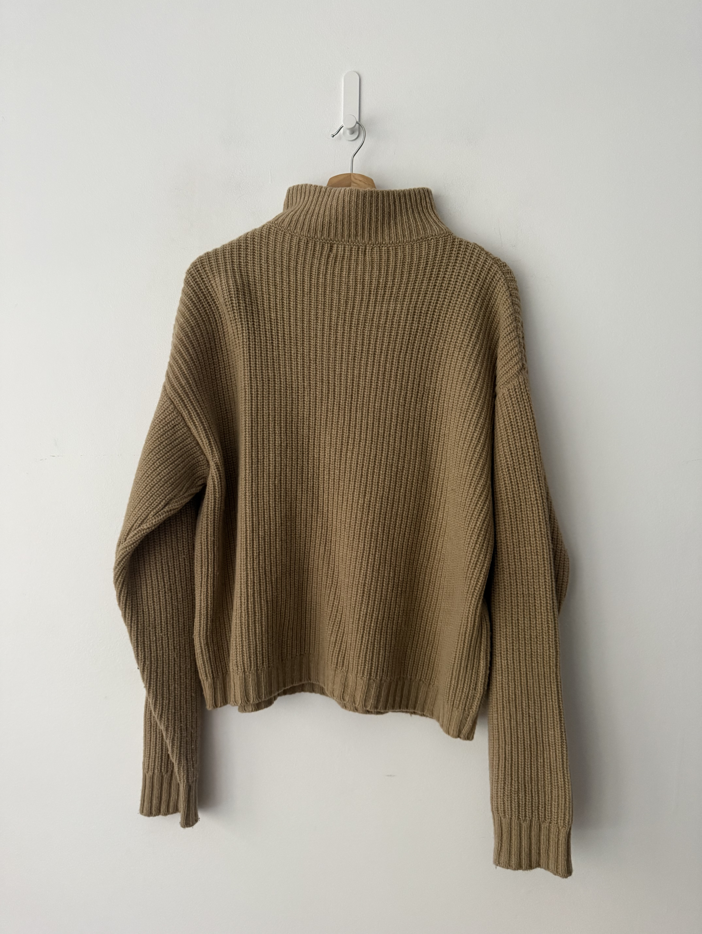 Chunky, oversized knit featuring a prominent half-zip "troyer" neckline and a wide-ribbed texture throughout.