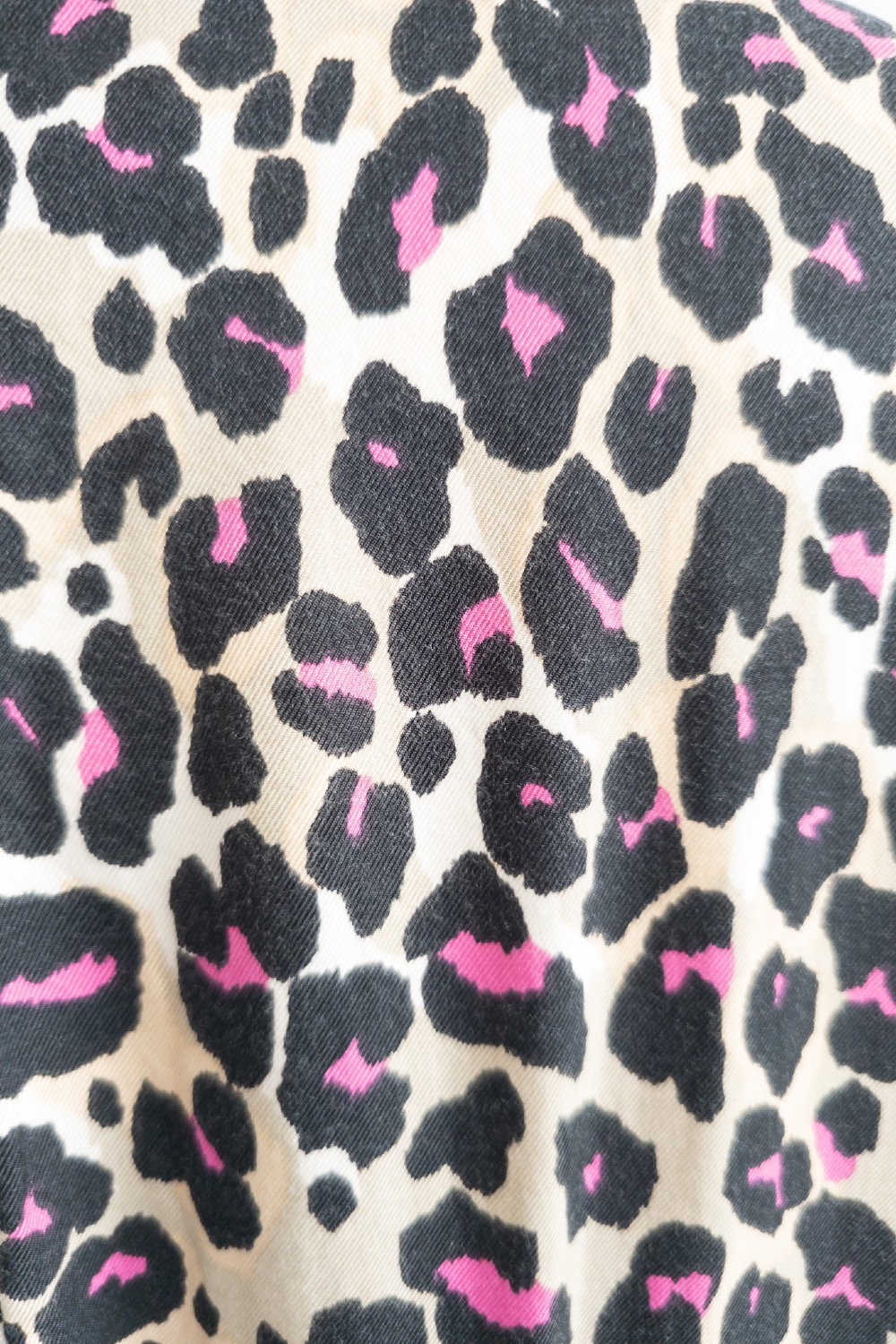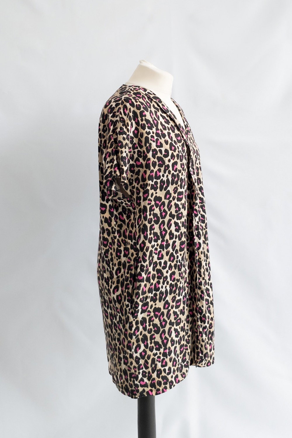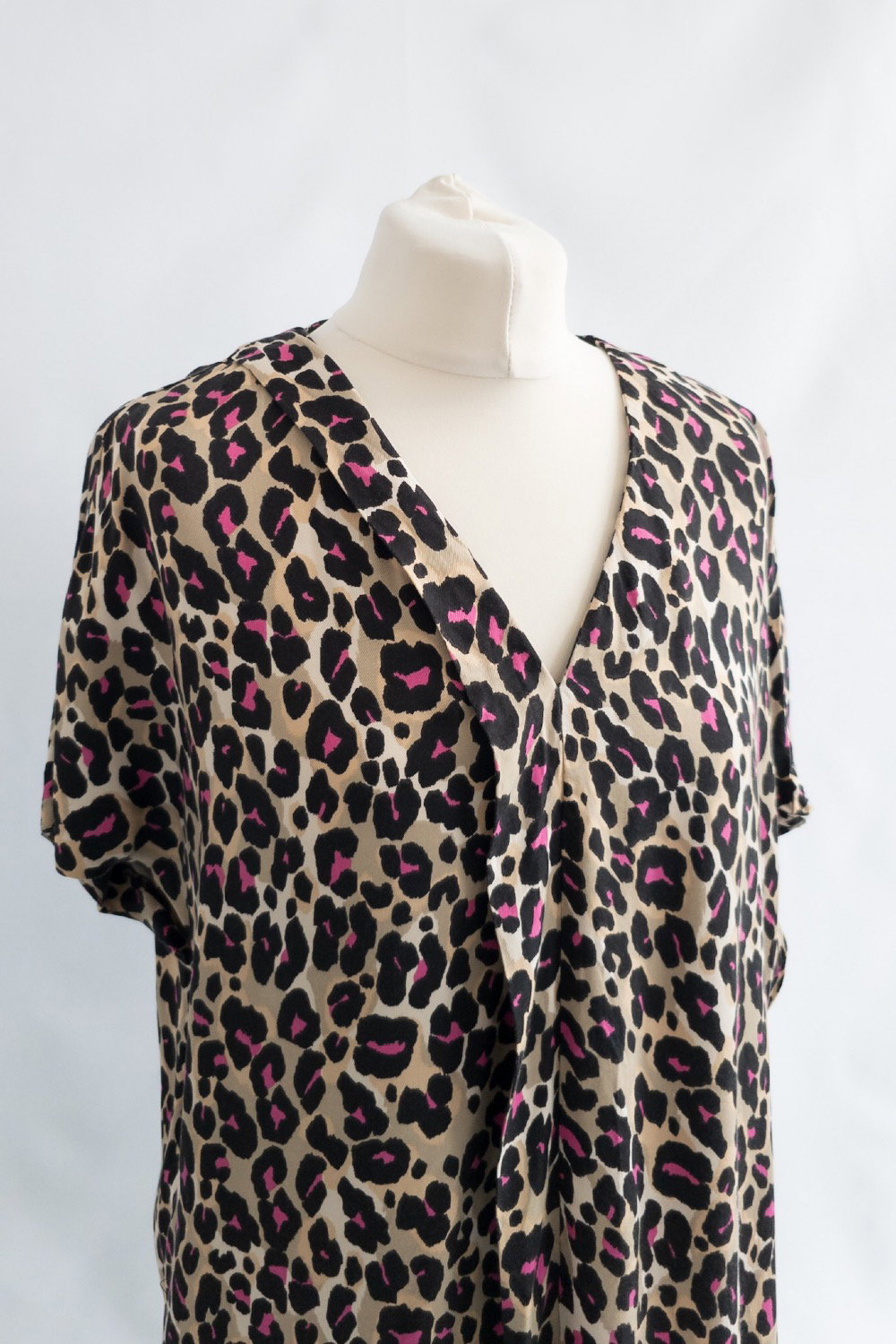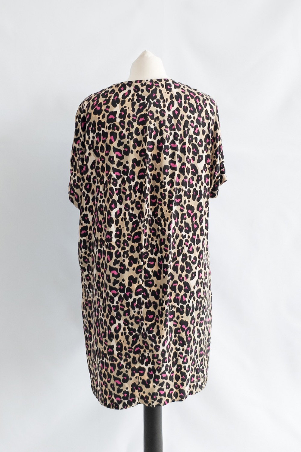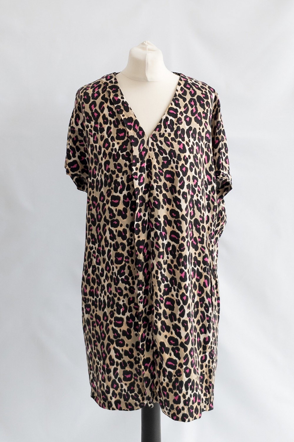 Animal print dress with pink specks, a v-line detailing on the neck Label size: UK 10