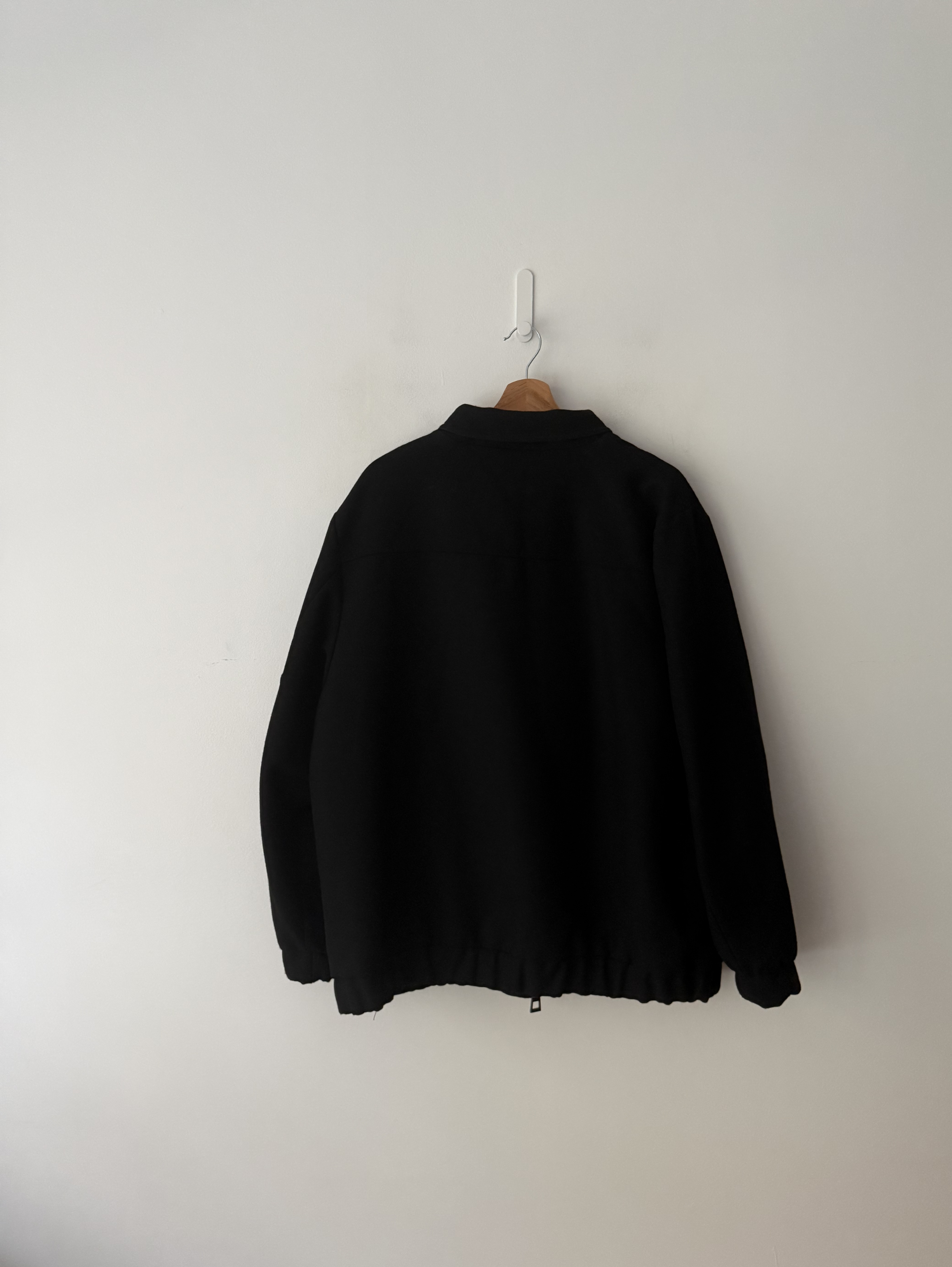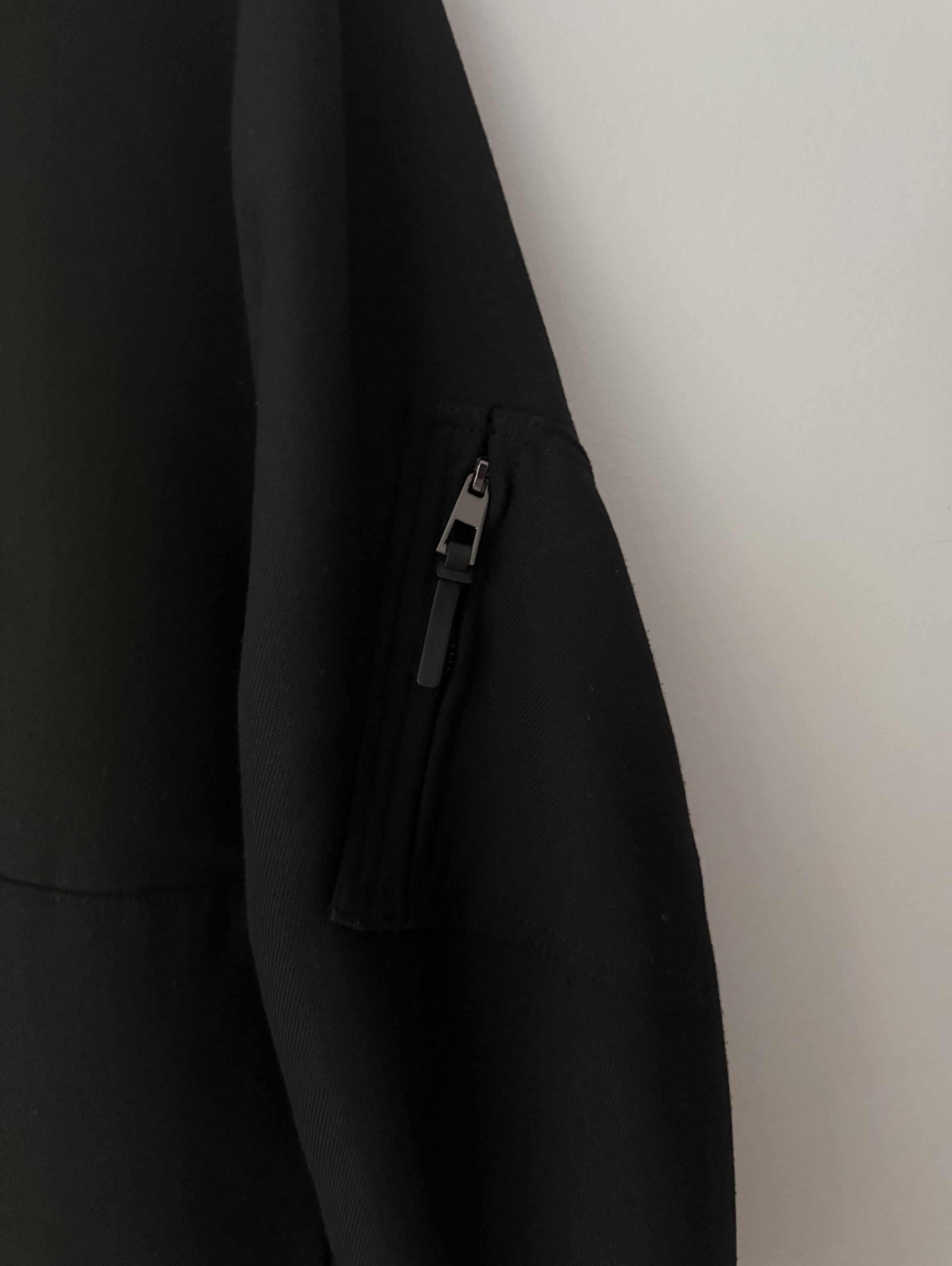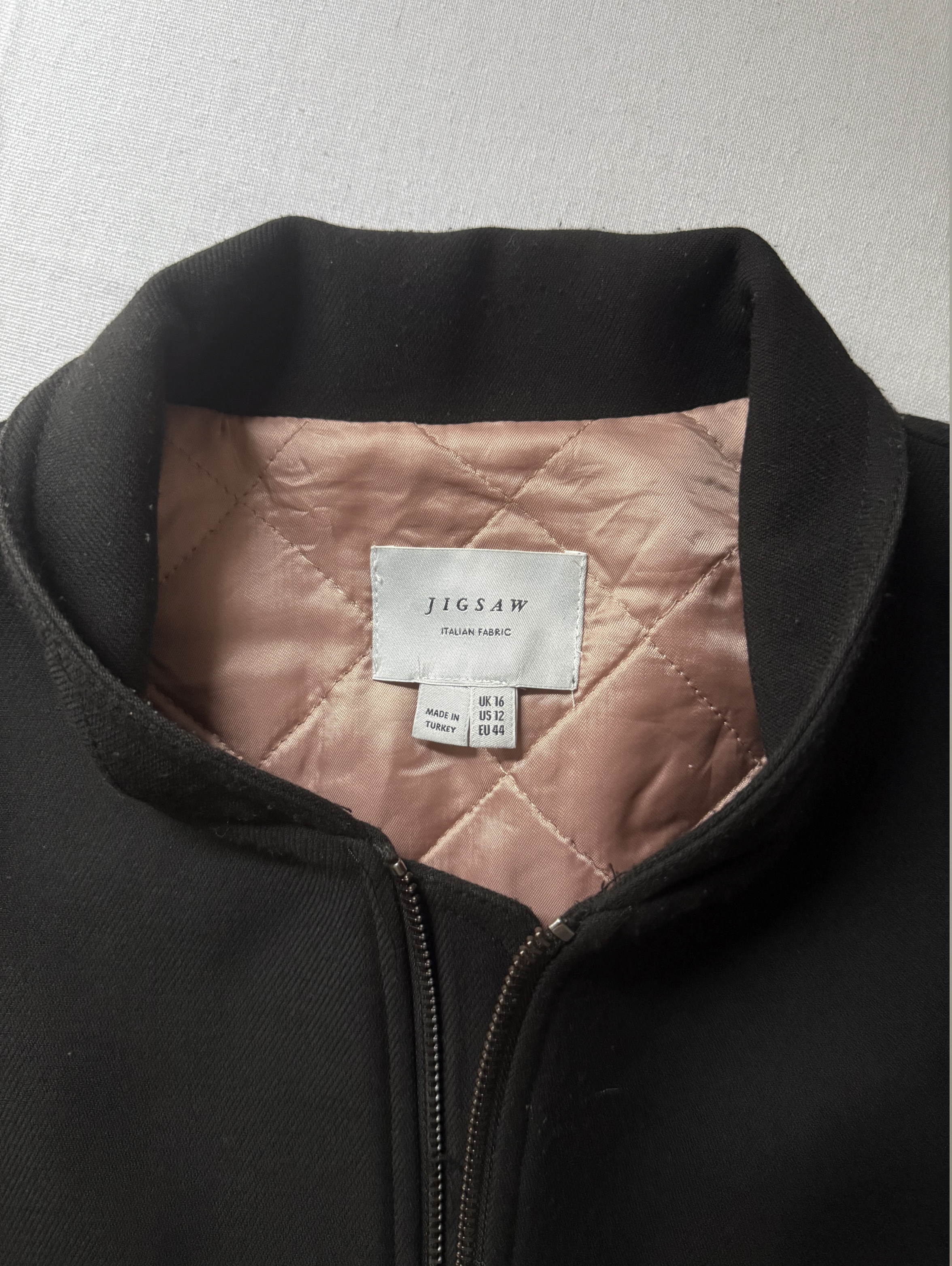 Black bomber jacket with a pale pink padded interior and side arm zip pocket.