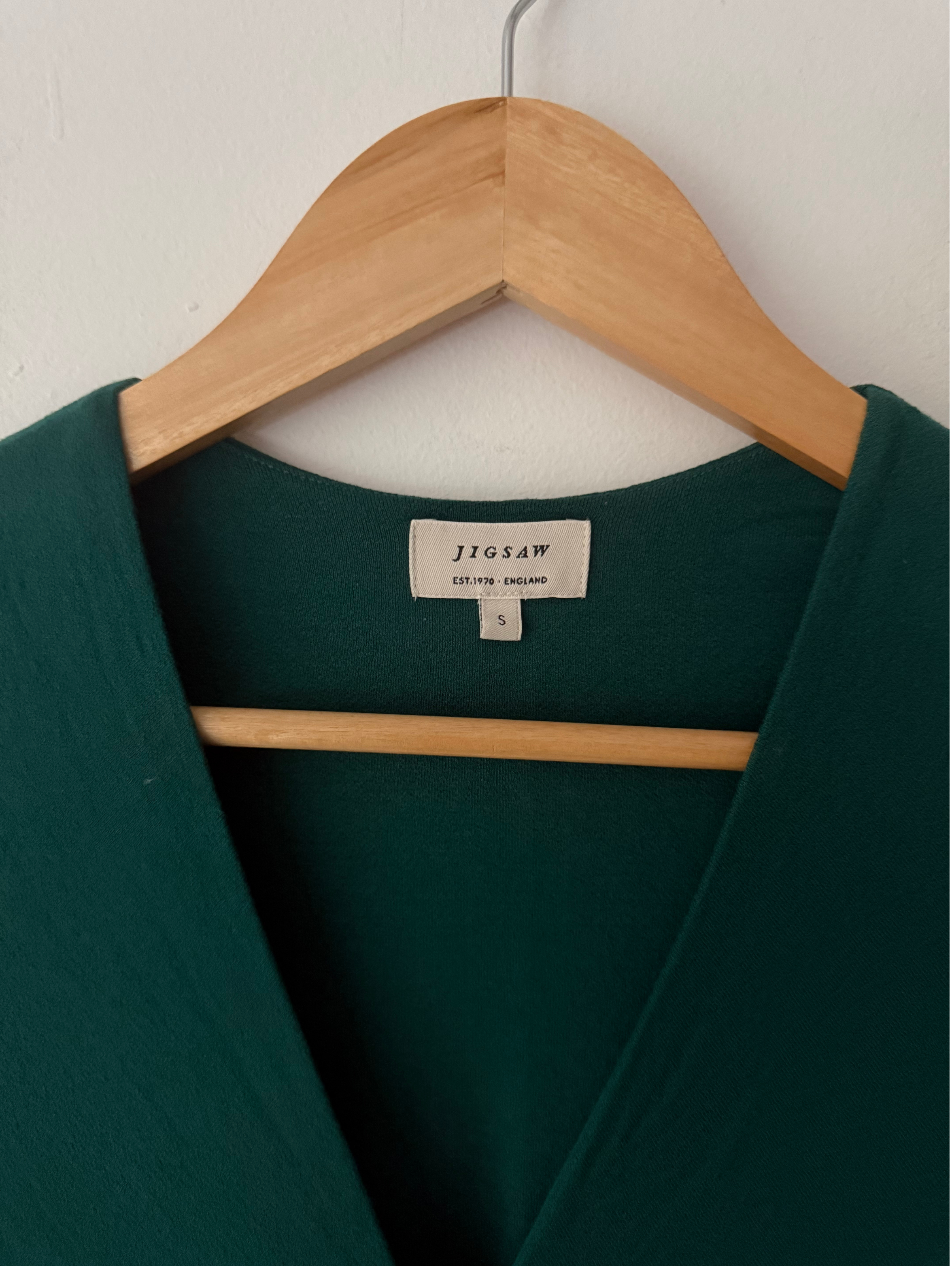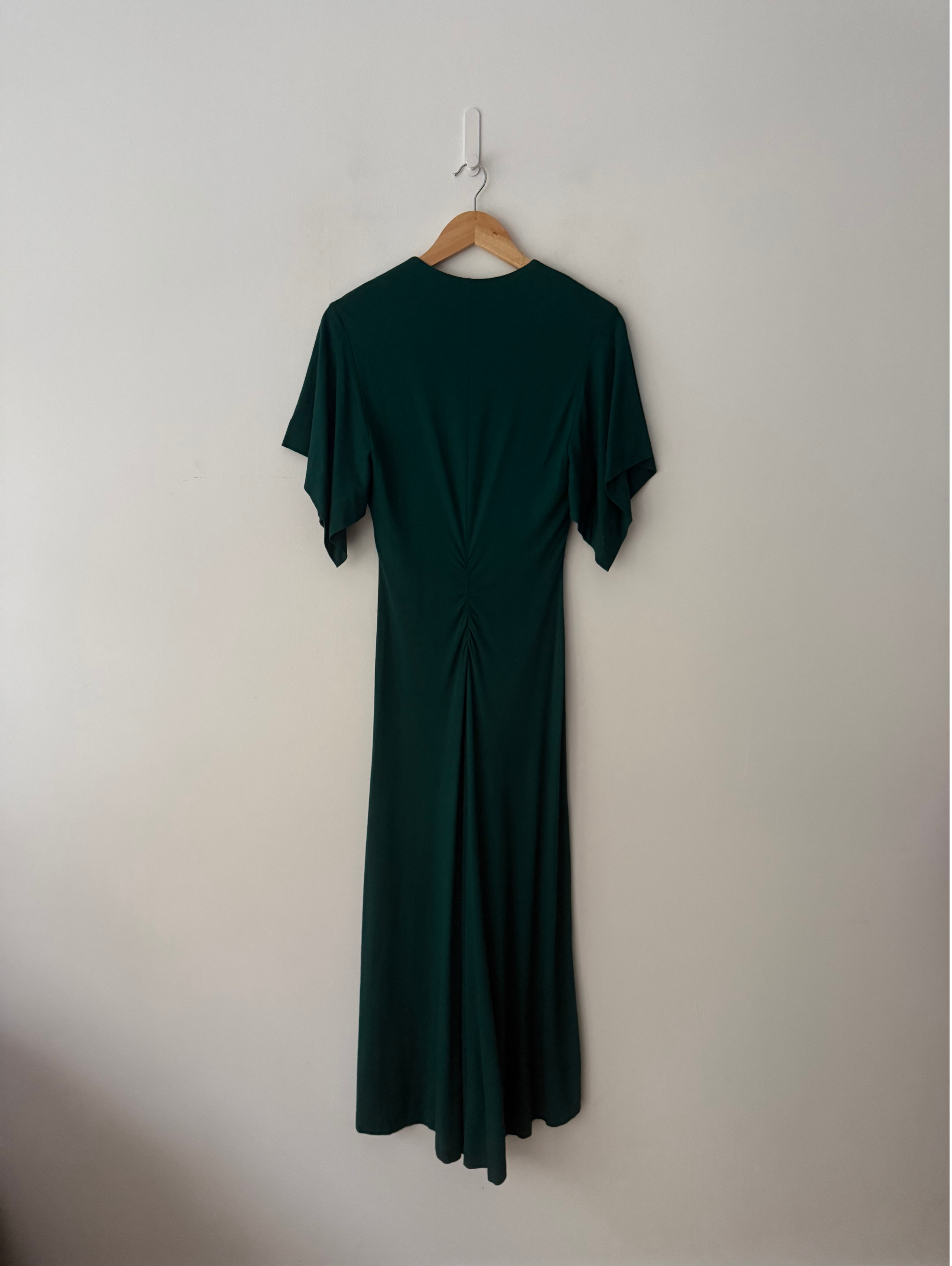 This midi dress is ready to grace your next event in a rich, emerald jewel tone. Soft jersey fabric hugs and flatters the body in all the right places, while ruched detail to the centre of the bodice and flutter sleeves frame this piece, whether worn in the day with flats or dressed up with heeled.