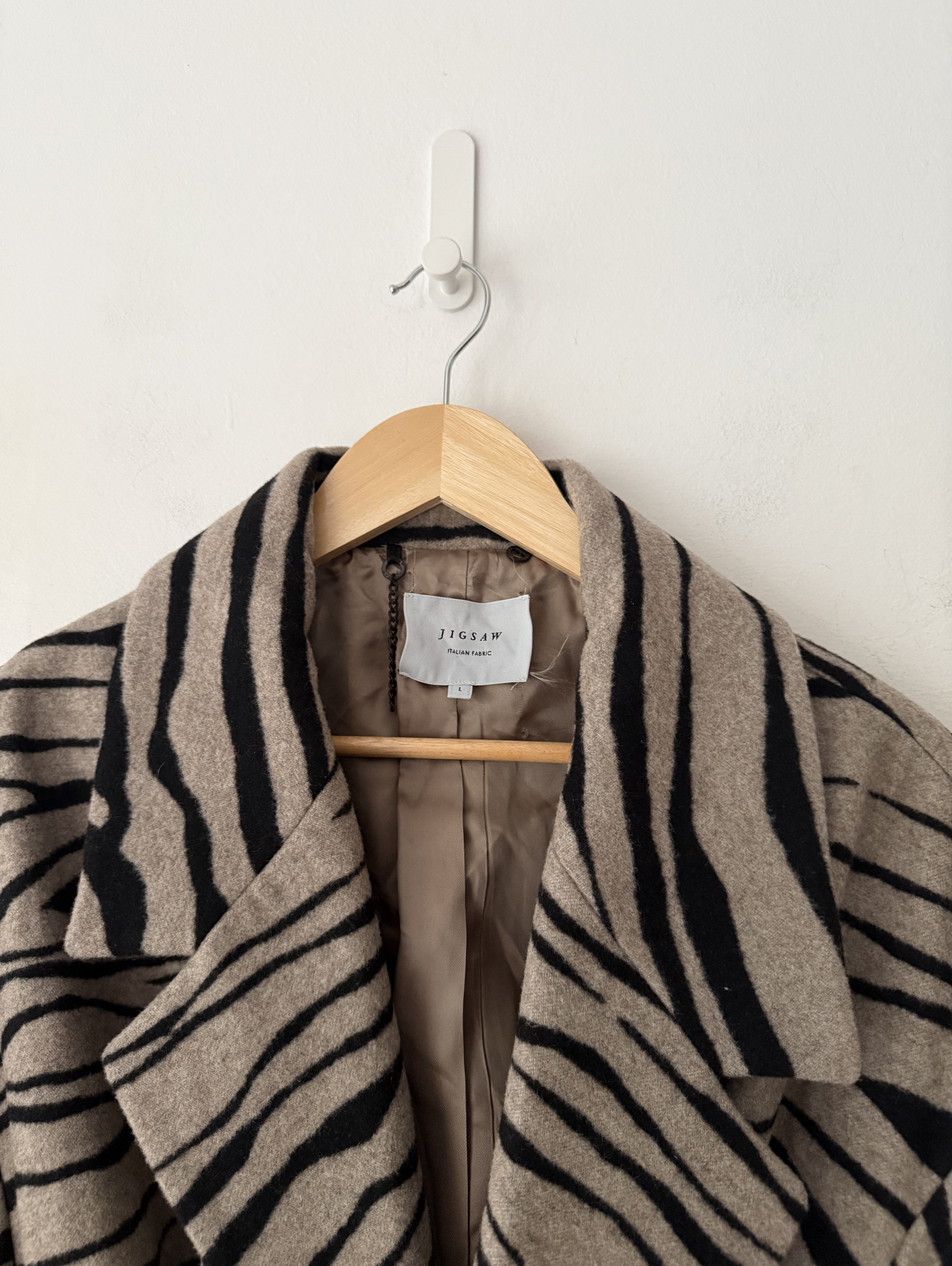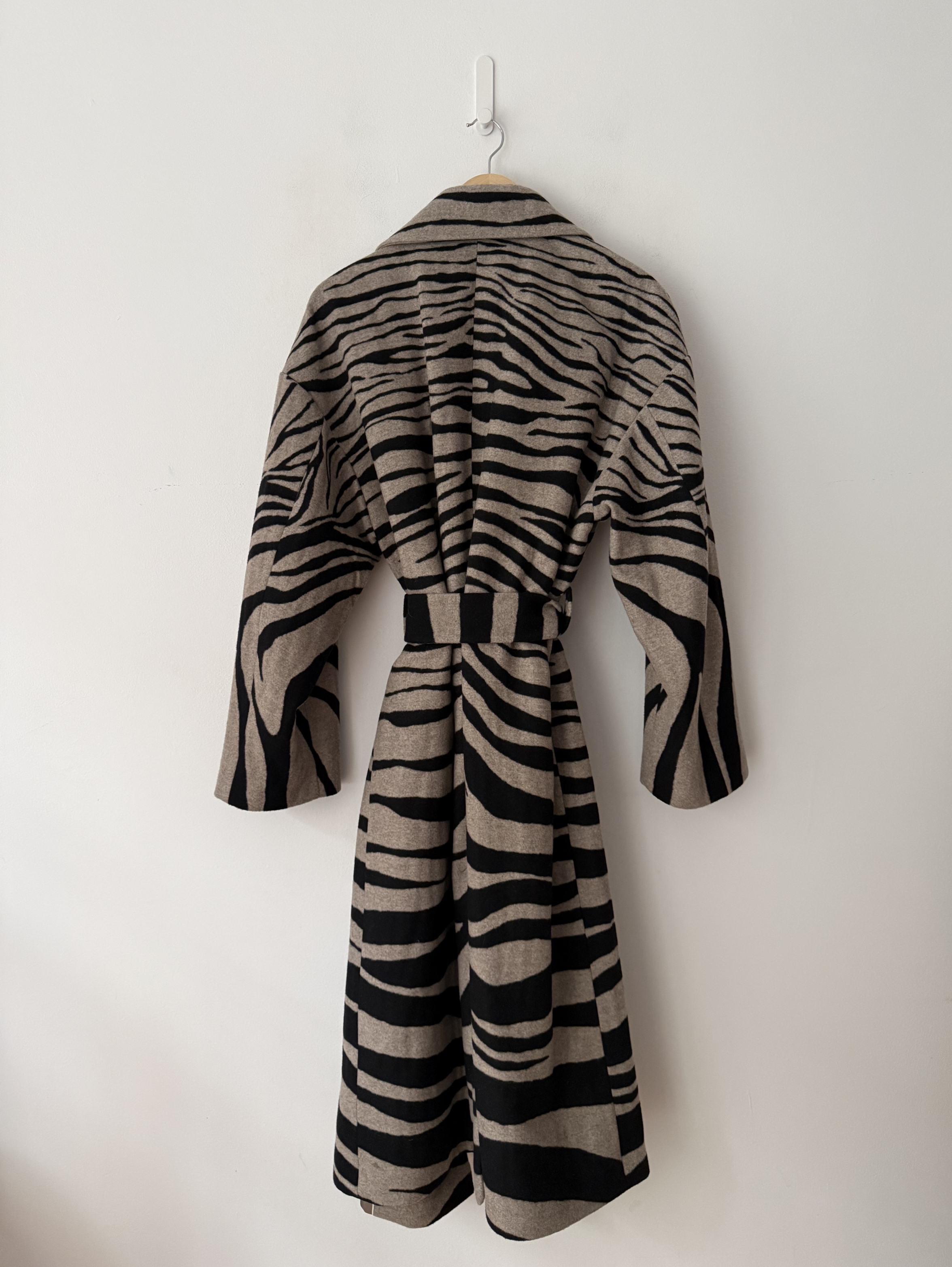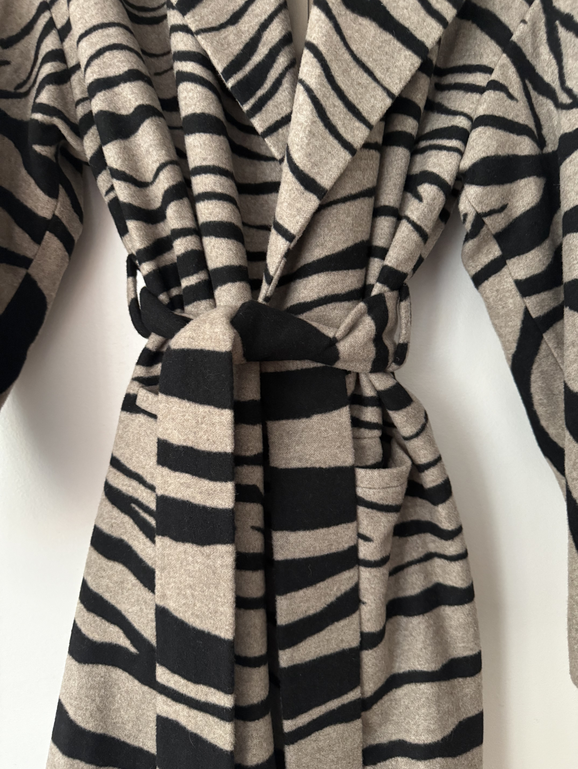 Zebra Print Wrap Coat. Two front pockets. Dry Clean Only.
