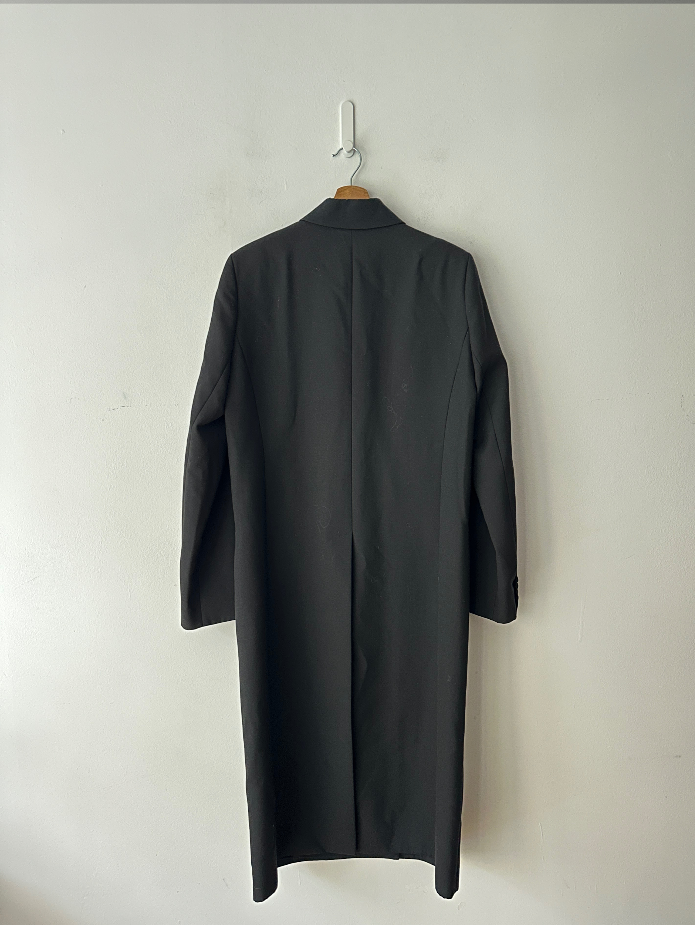 Double-breasted, menswear-inspired long coat with covered buttons.
