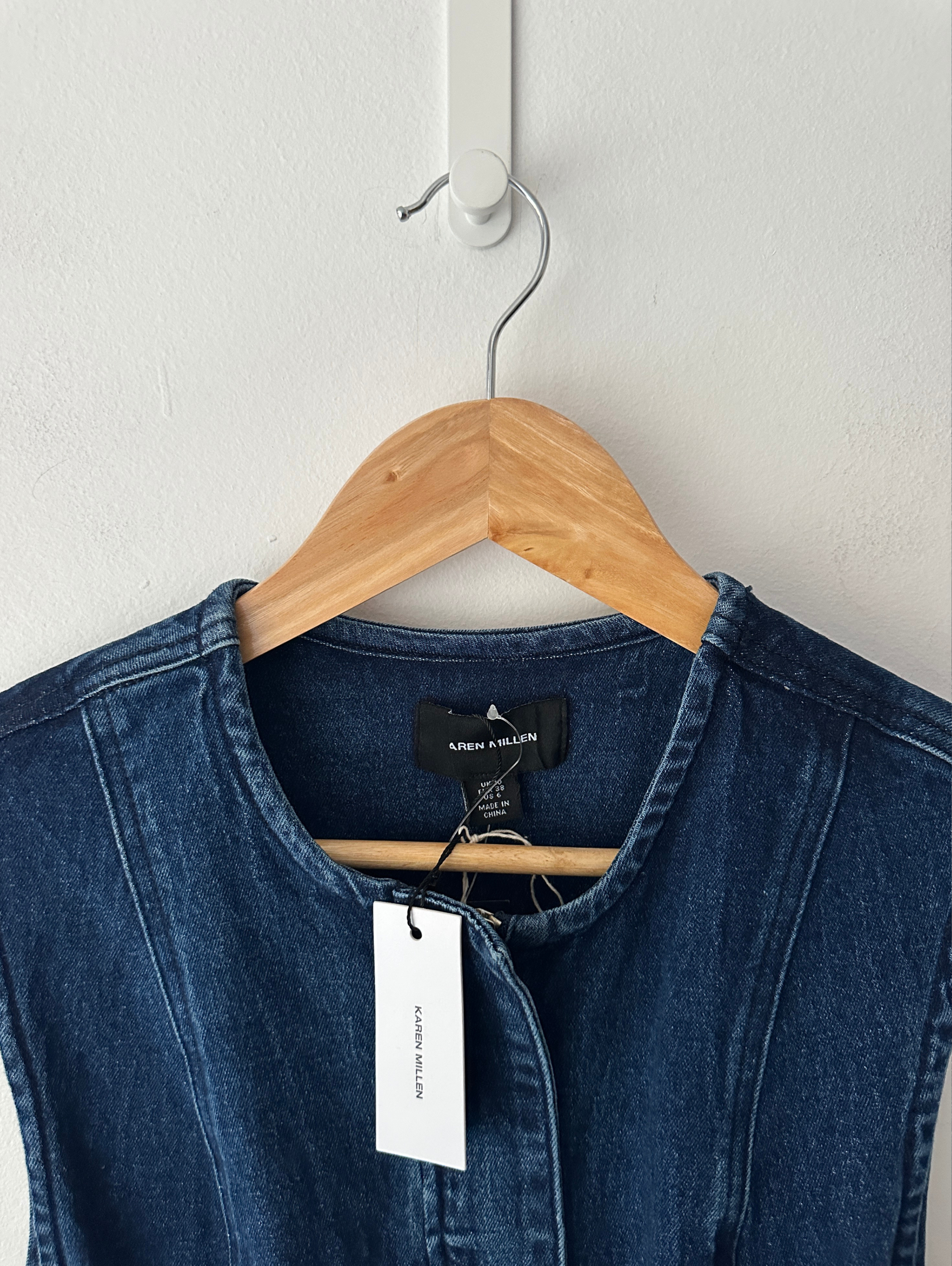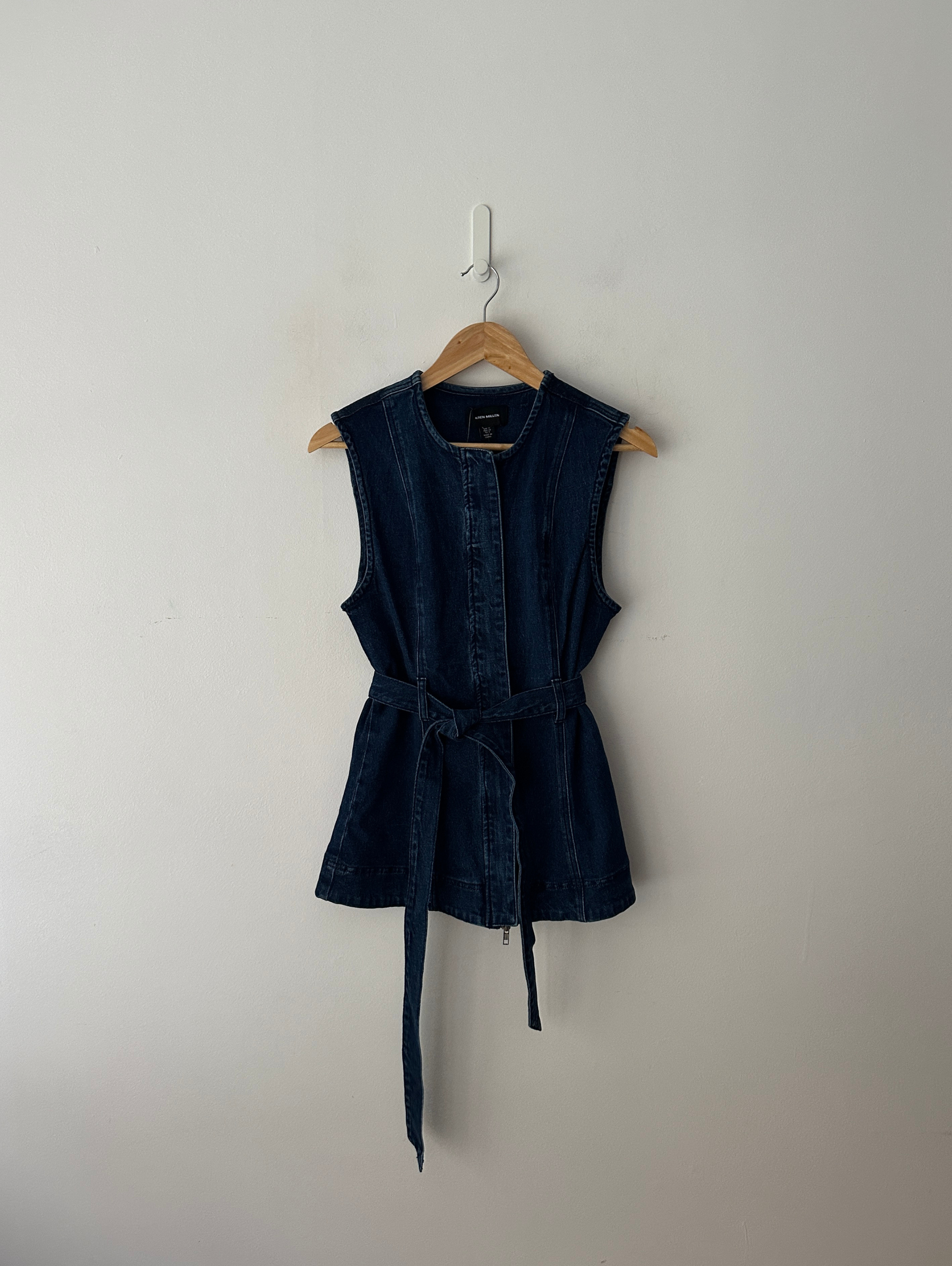 This Karen Millen sleeveless denim jacket redefines casual sophistication with its clean lines and thoughtful design. The belted waist creates a feminine silhouette that flatters curves, while the structured seaming adds architectural interest to this contemporary piece.
