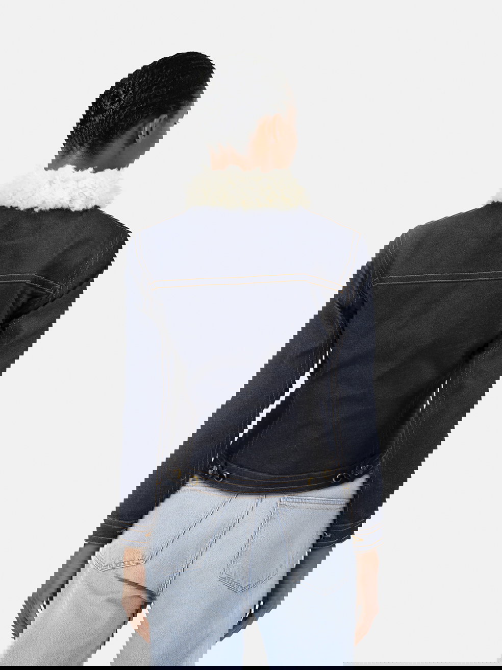 Blue denim and faux-shearling denim jacket in excellent, pre-worn condition. Composition: 98% cotton, 2% polyurethane. Dry clean only. Measurements: shoulder 41cm, sleeve length 51cm, bust 46cm, length 53cm.