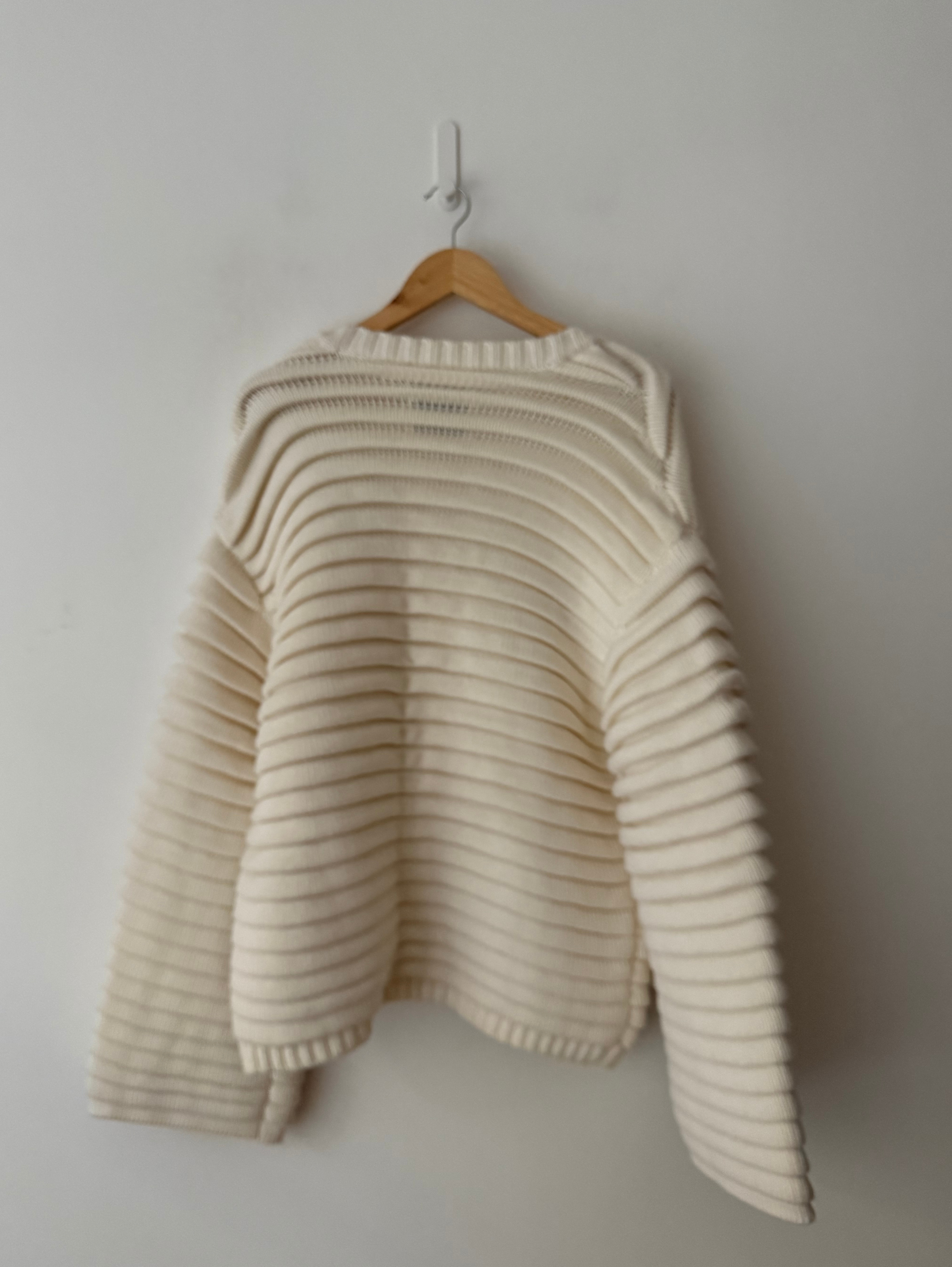 Cream, heavy rib knit, oversized jumper with wide cuff sleeves in excellent, pre-worn condition. Deep v-neck. No composition label, but likely to be 100% merino wool.
