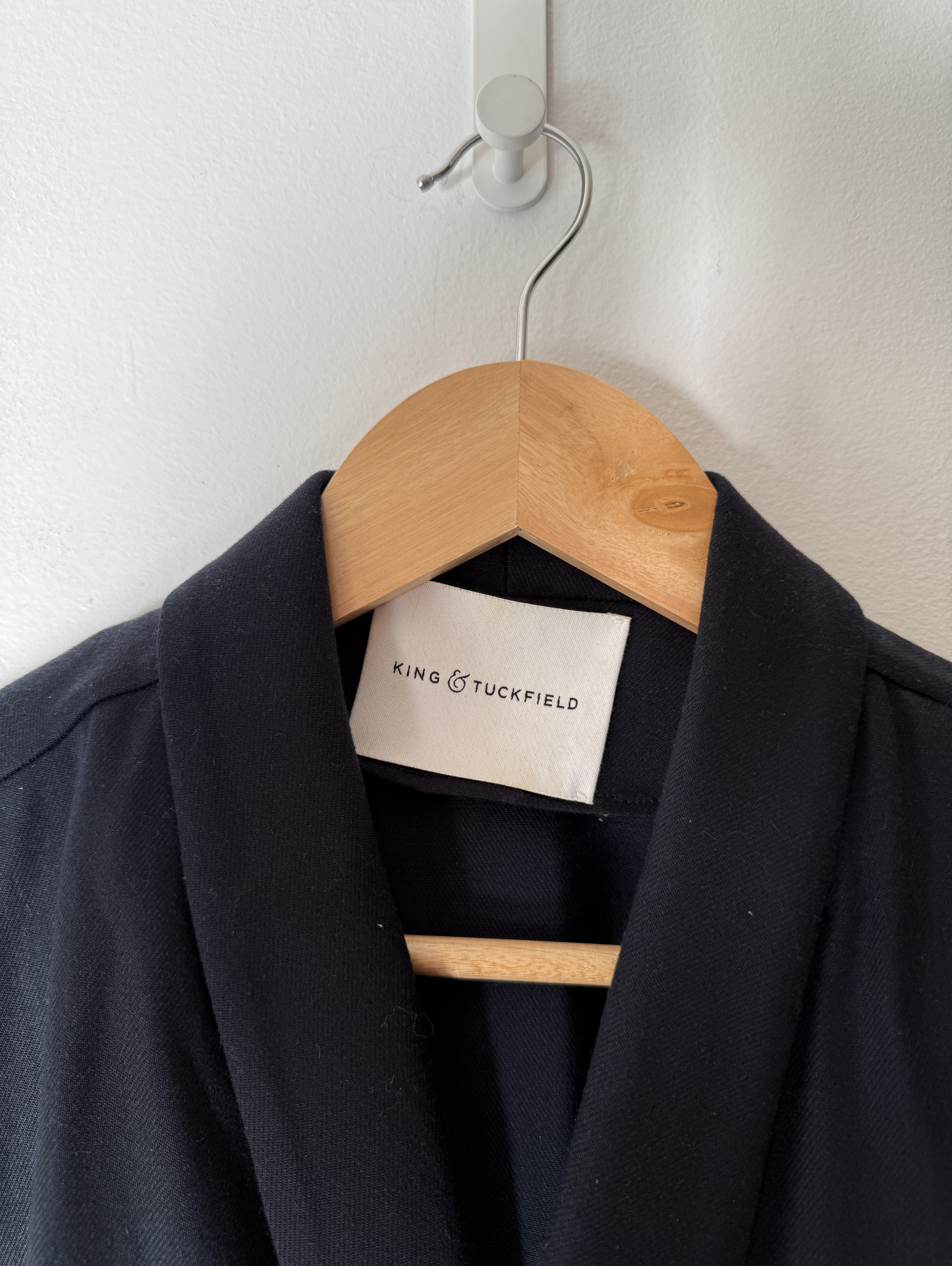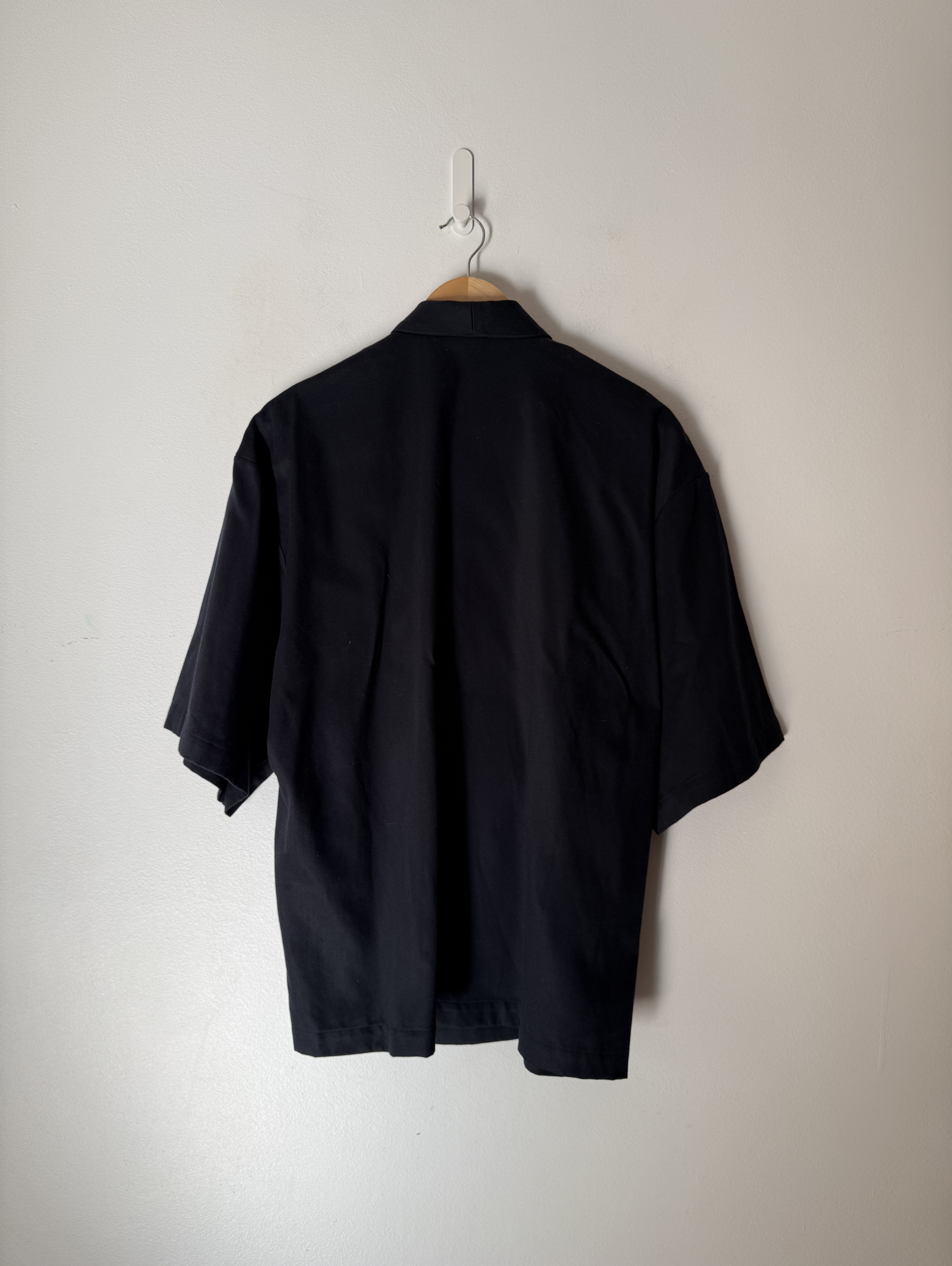 Black Shirt with Notch lapels, short, wide sleeves, wrap front with button fastening and a relaxed fit.