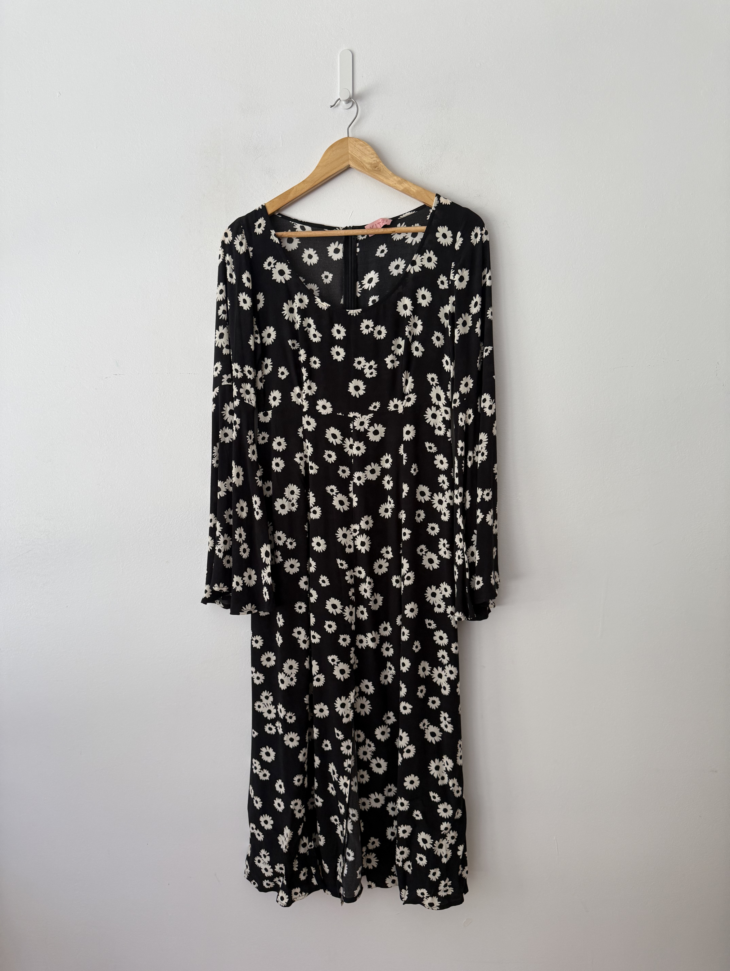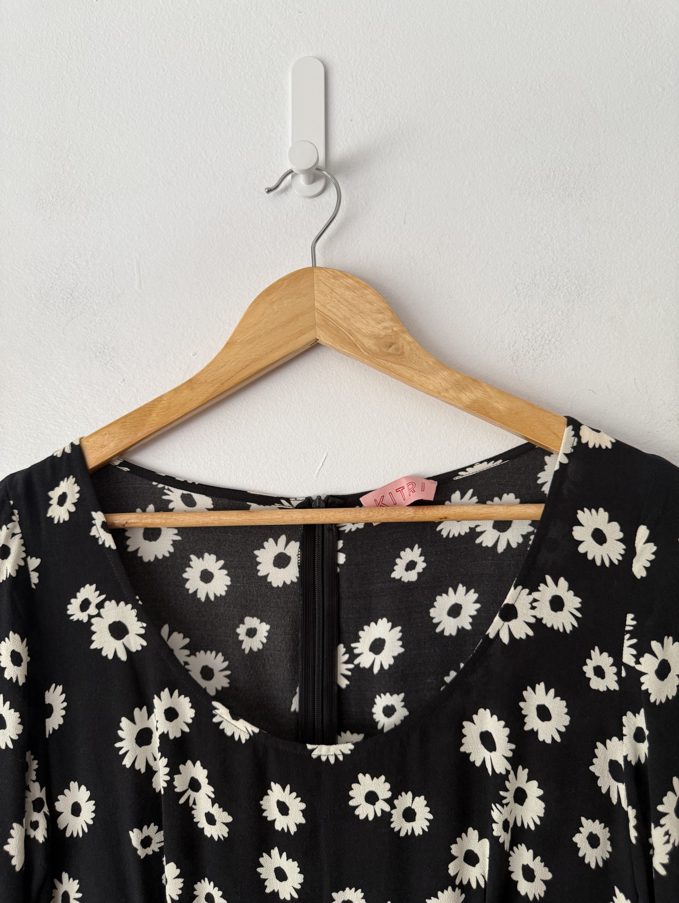 Black floral dress with 3/4 sleeves and a scoop neckline.