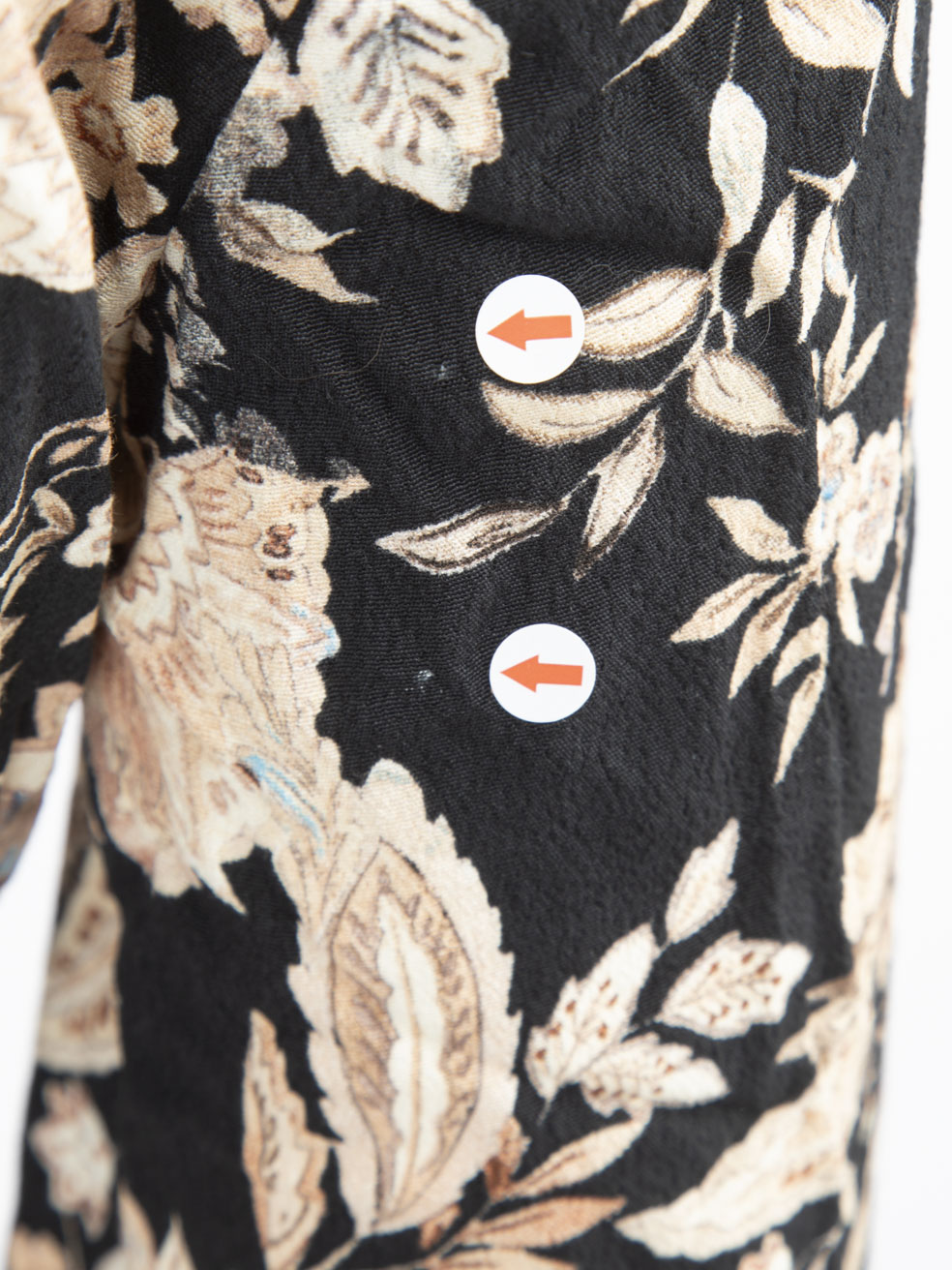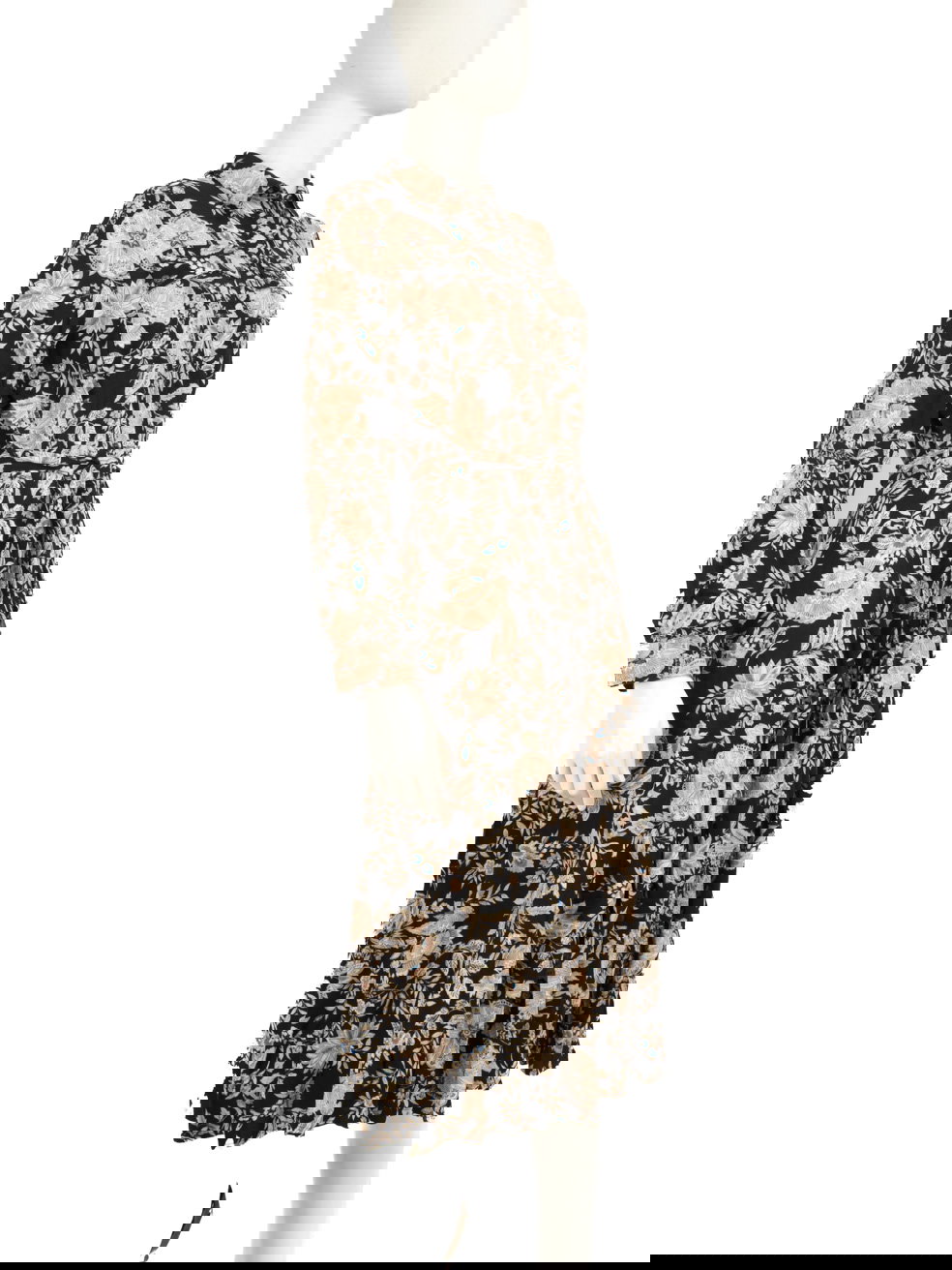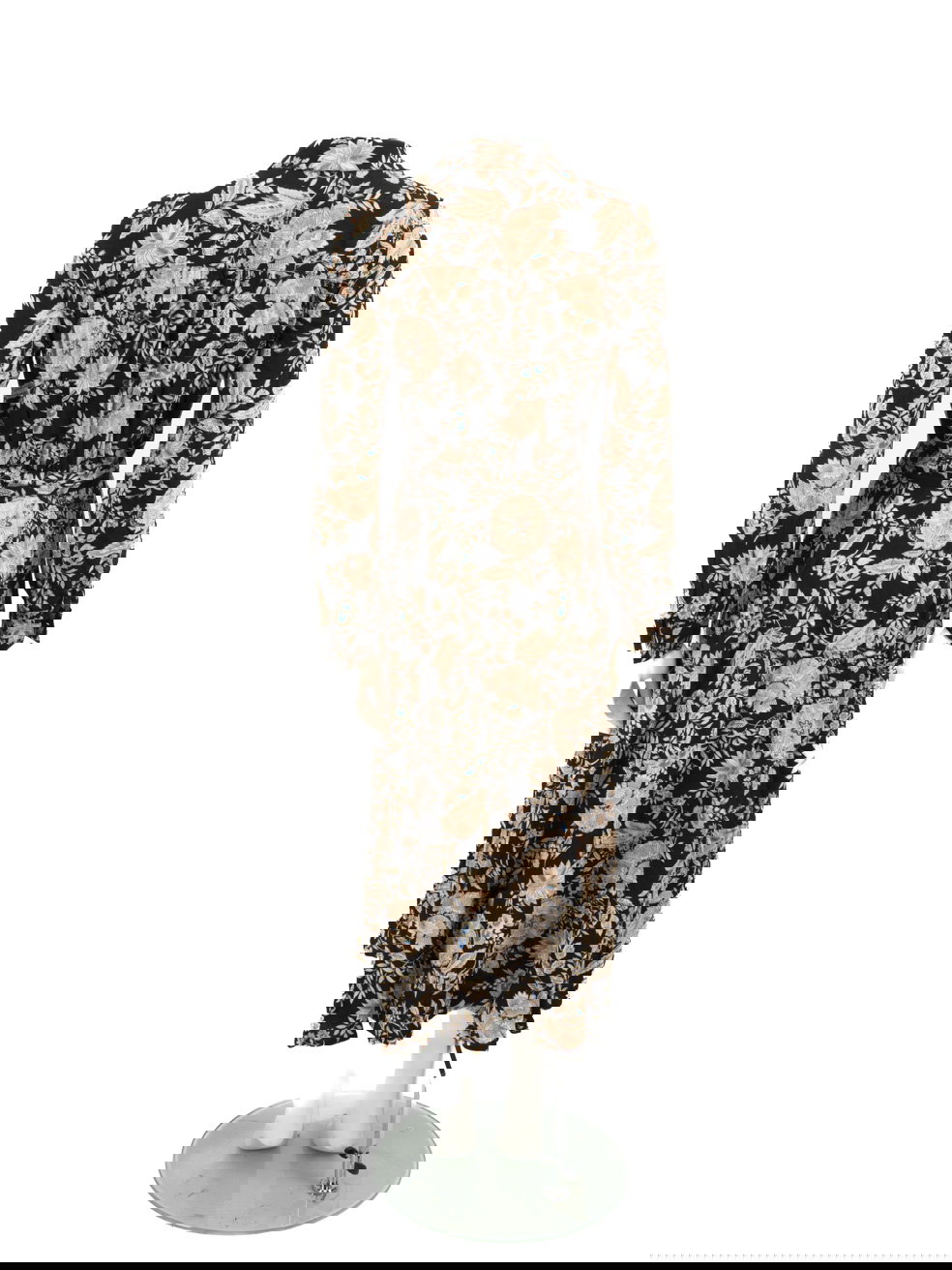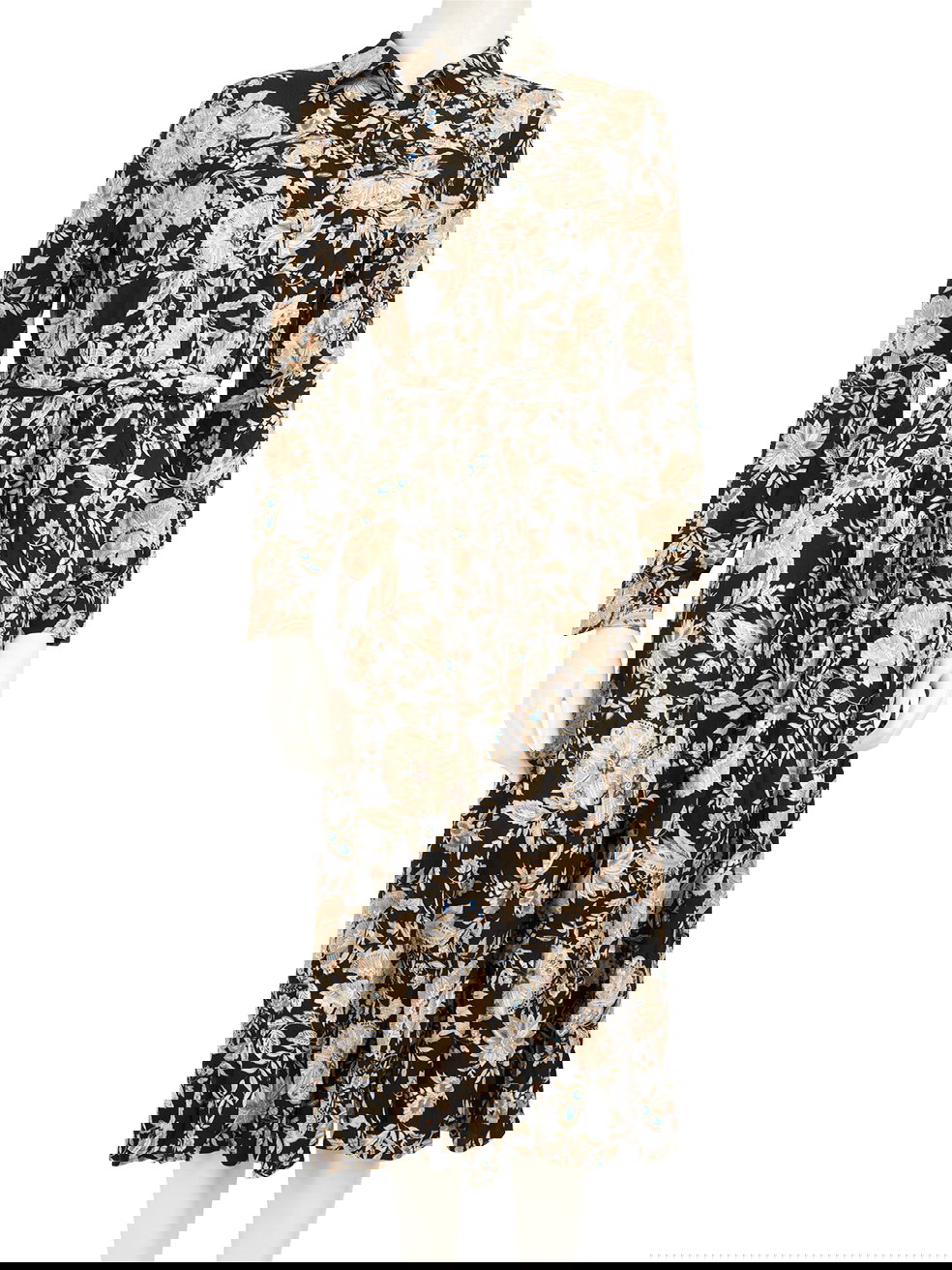 Floral print maxi dress in good, pre-worn condition with long sleeves, waist belt, button closure. Composition: 100% Viscose. Measurements: Shoulder: 35 cm, Sleeve Length: 62 cm, Bust: 45 cm, Waist: 37 cm, Hip: 60 cm, Length: 122 cm.
