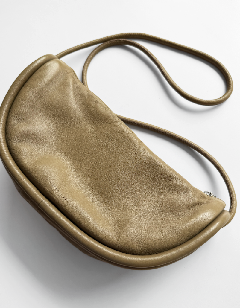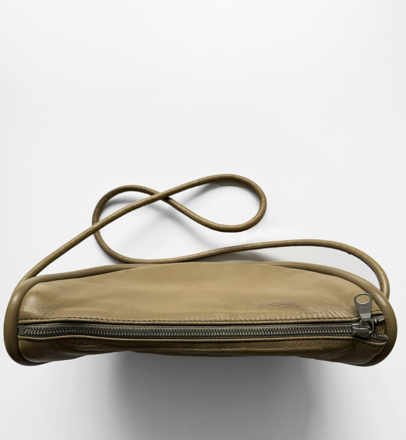 Made from smooth and soft leather, this bag is designed with a rounded shape, a tubular shoulder strap and exaggerated piping around the edges. The length of the strap can be adjusted as desired, making this a very versatile piece that can also be worn as a shoulder bag. Furnished with one interior pocket with zip.