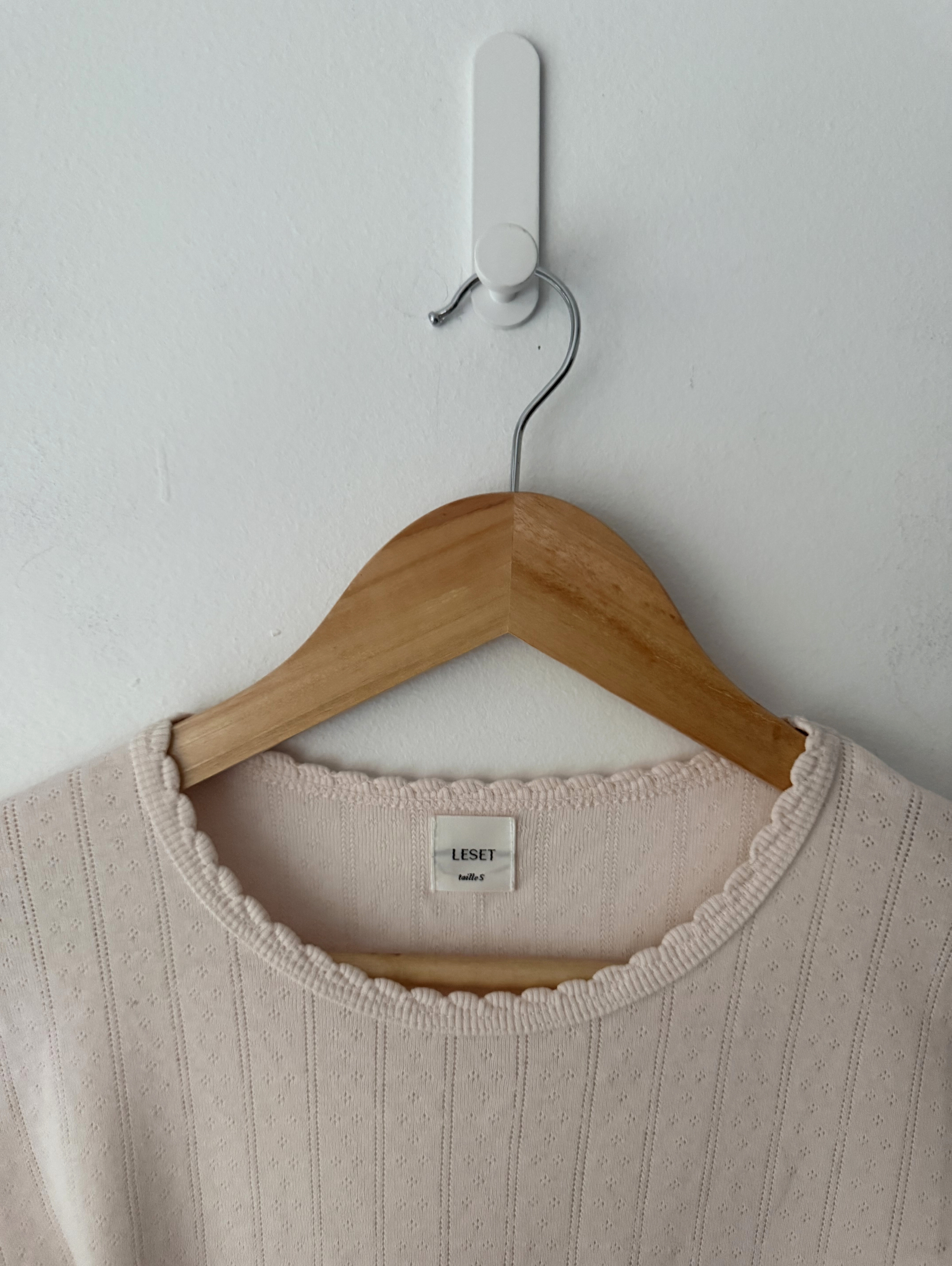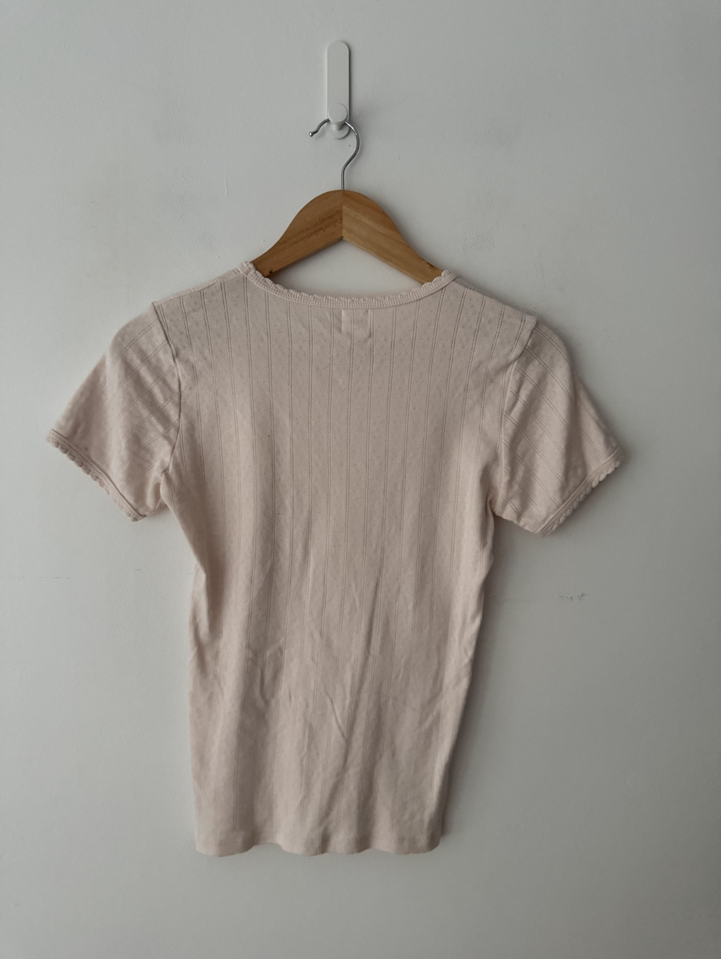 Pink pointelle slim-fit T-shirt with a crew neckline and scalloped edges.