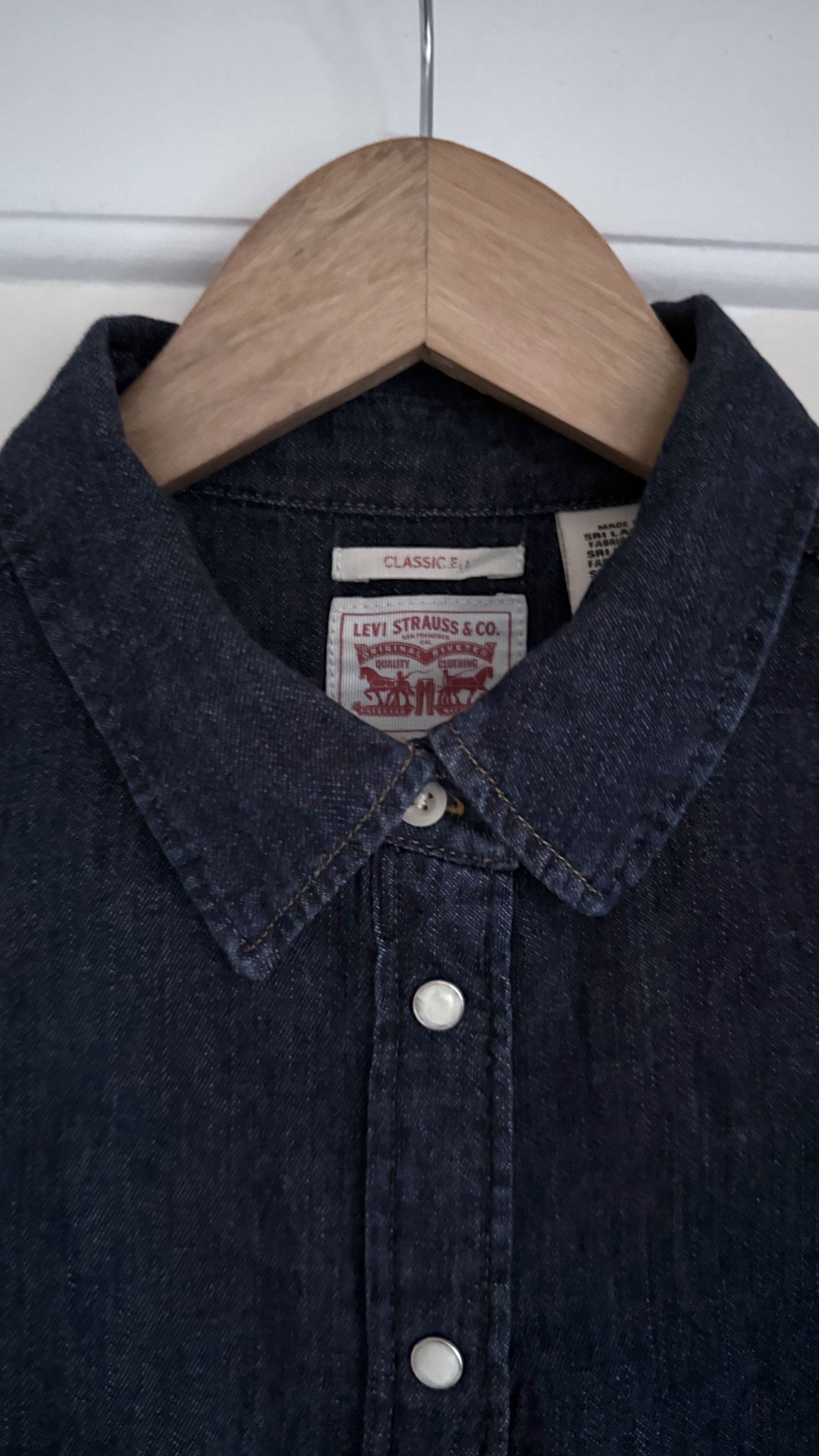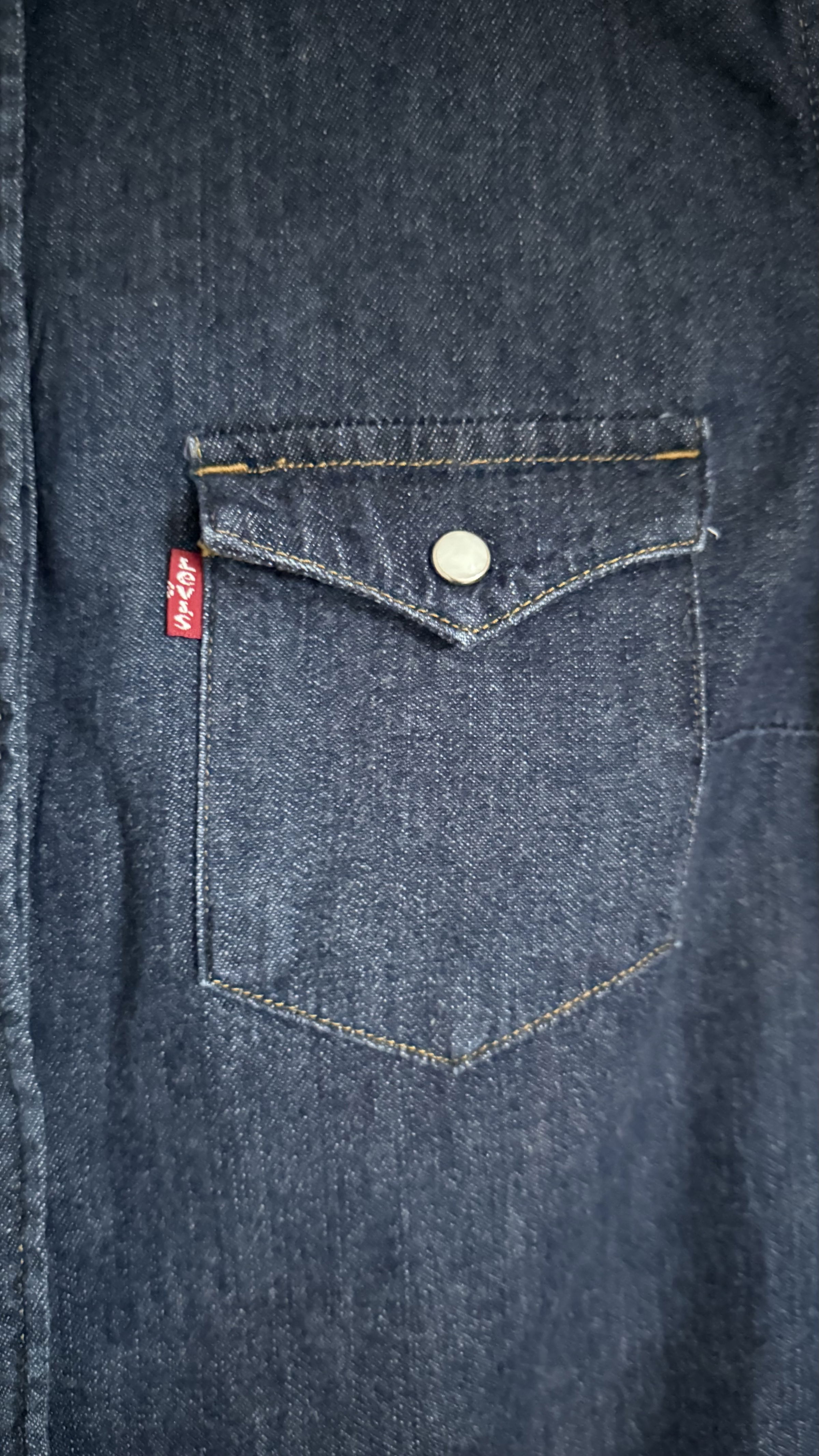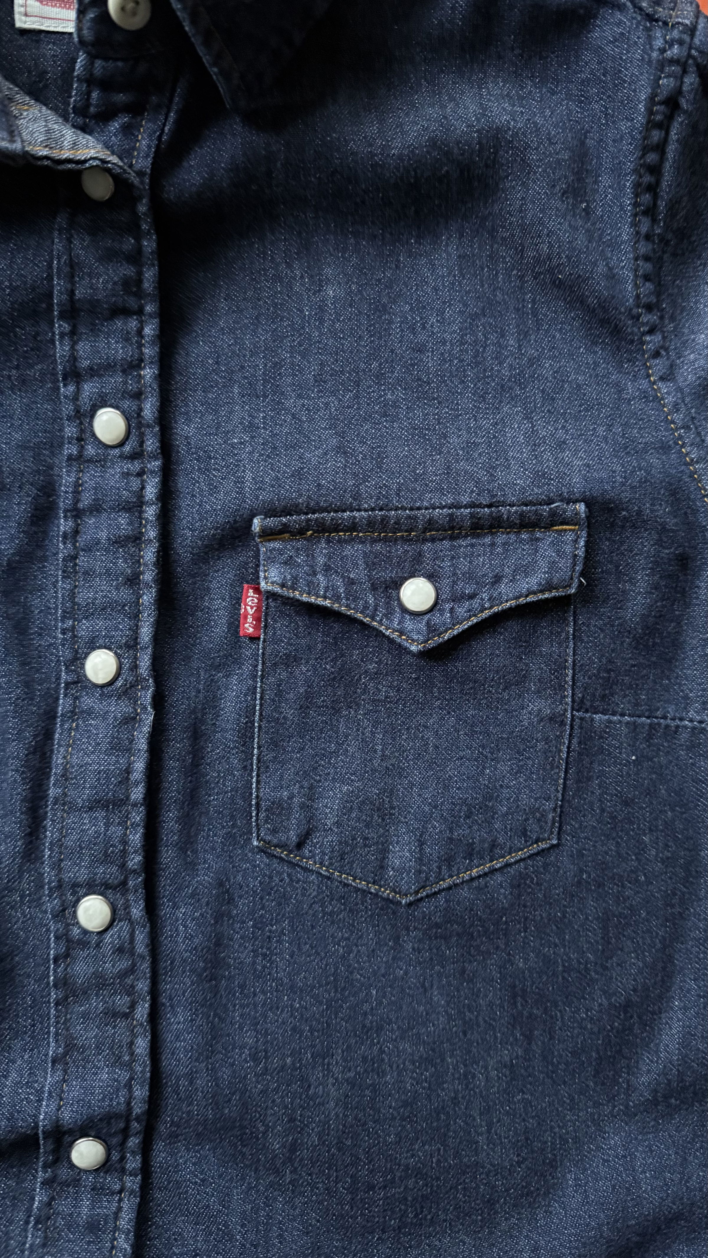 The iconic Levi’s denim shirt. Pearl buttons press stud buttons (apart from very top button) and front pockets. Excellent condition and washes well. The denim is soft and comfortable to wear.