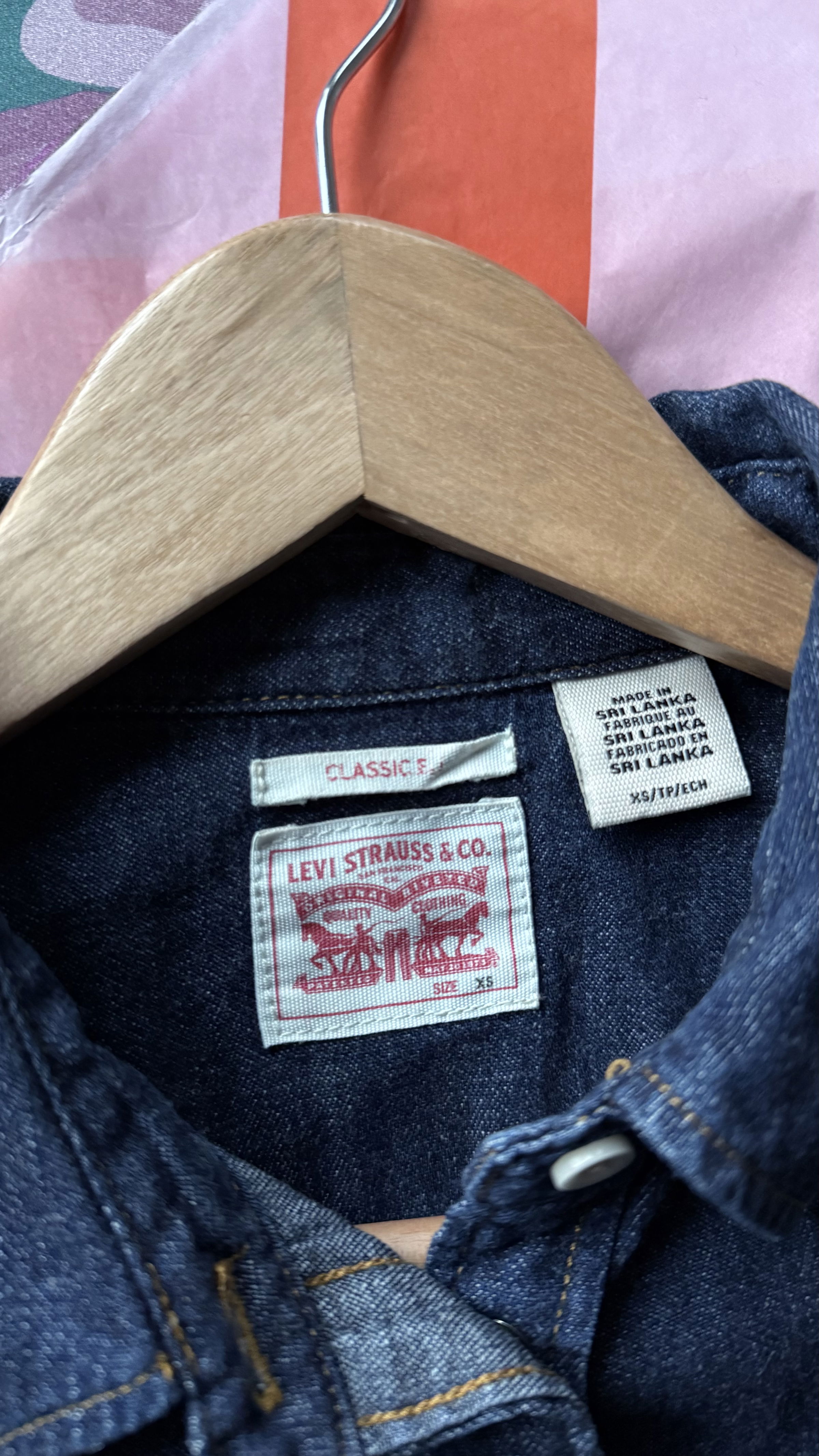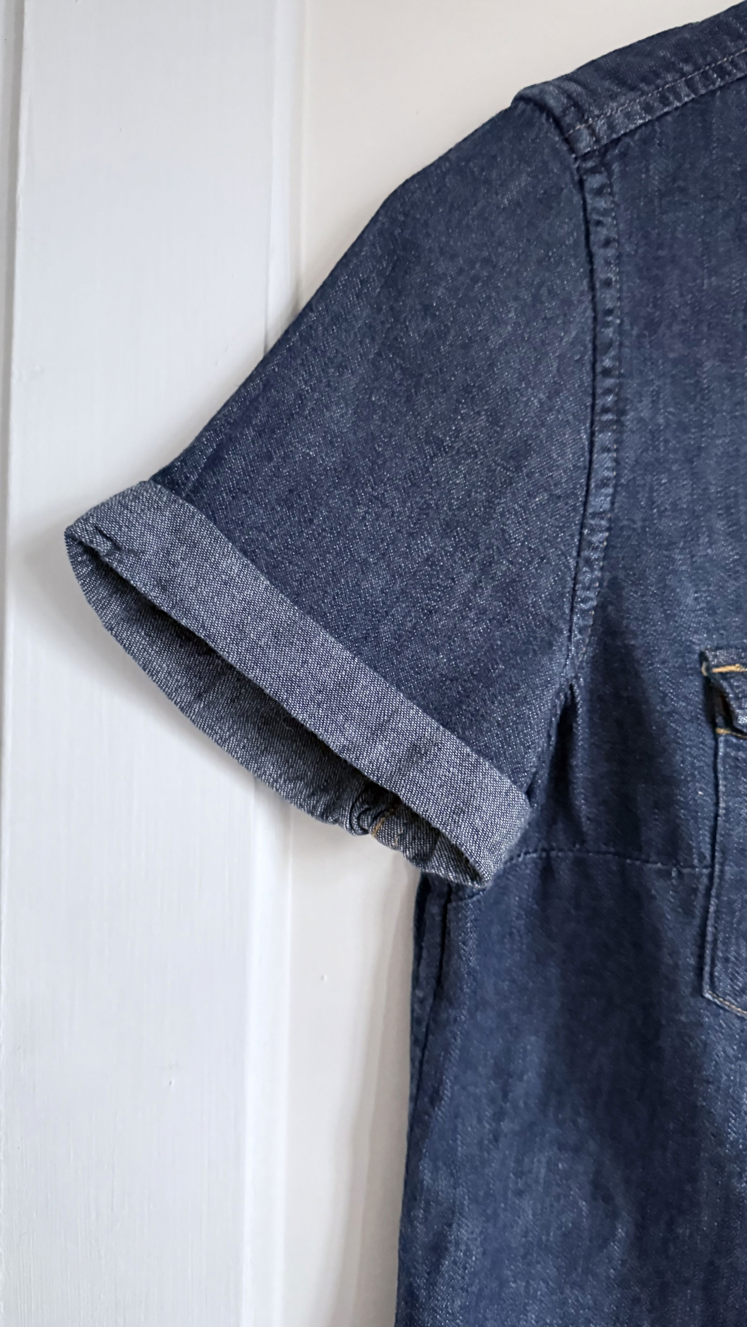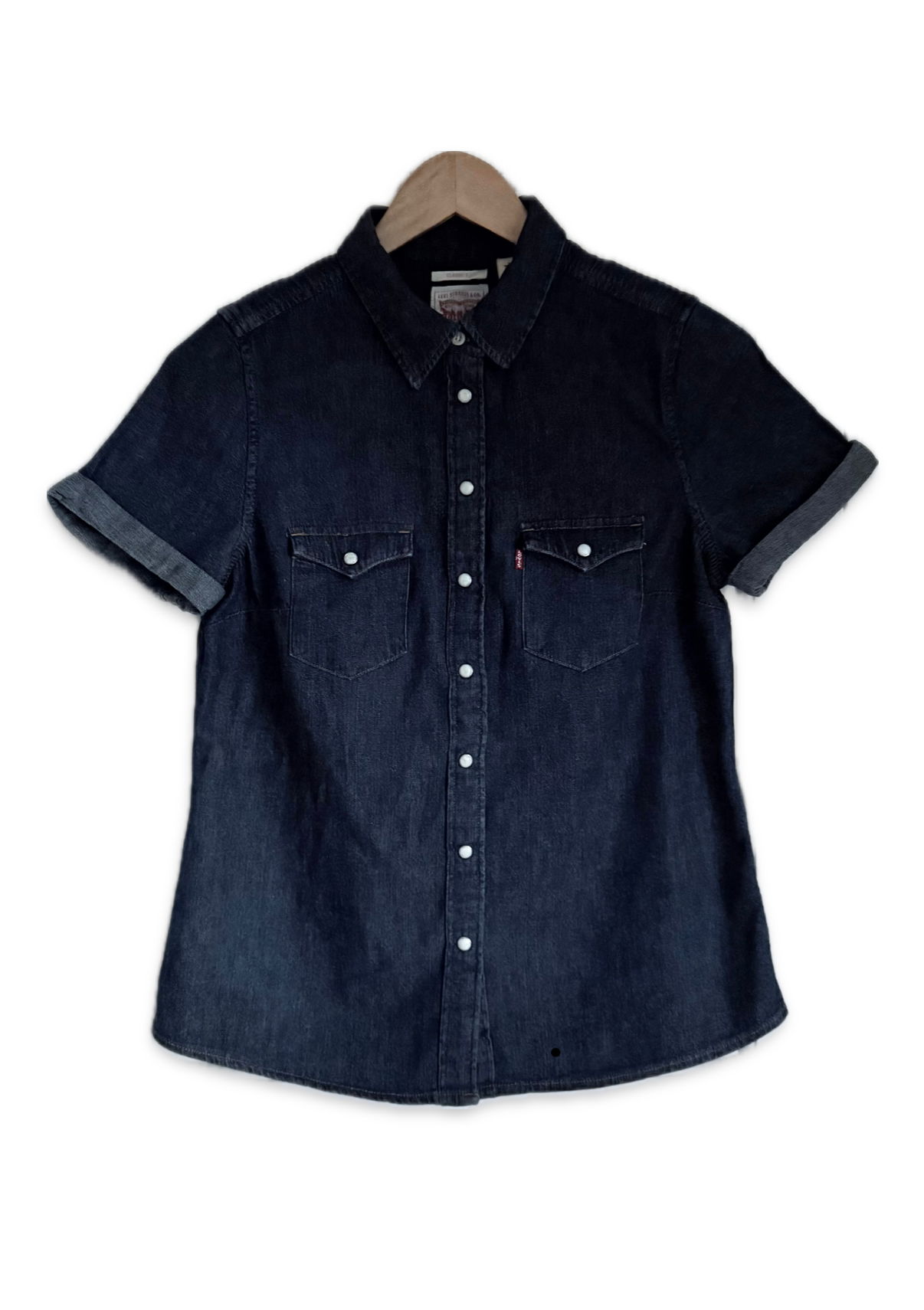The iconic Levi’s denim shirt. Pearl buttons press stud buttons (apart from very top button) and front pockets. Excellent condition and washes well. The denim is soft and comfortable to wear.