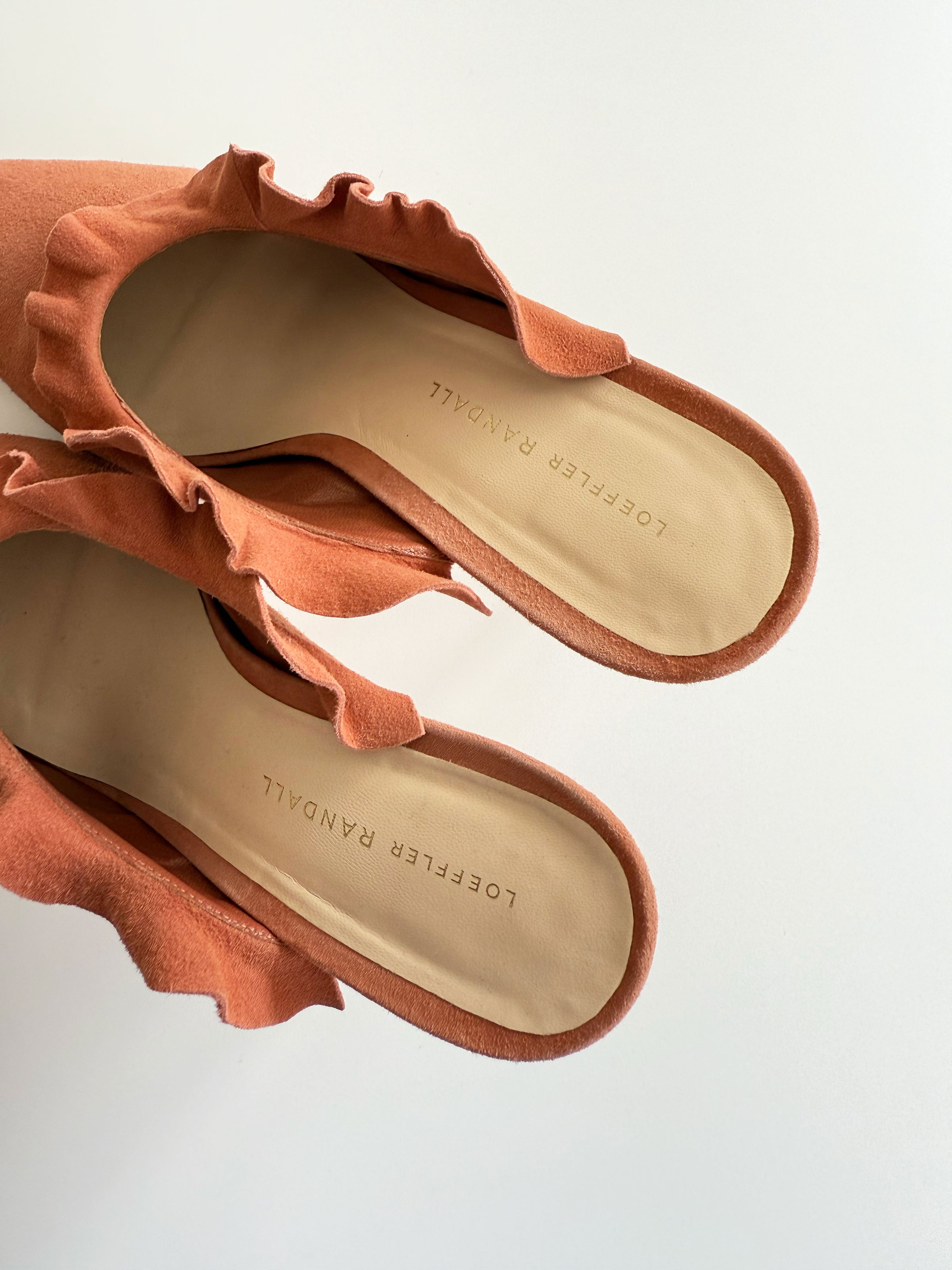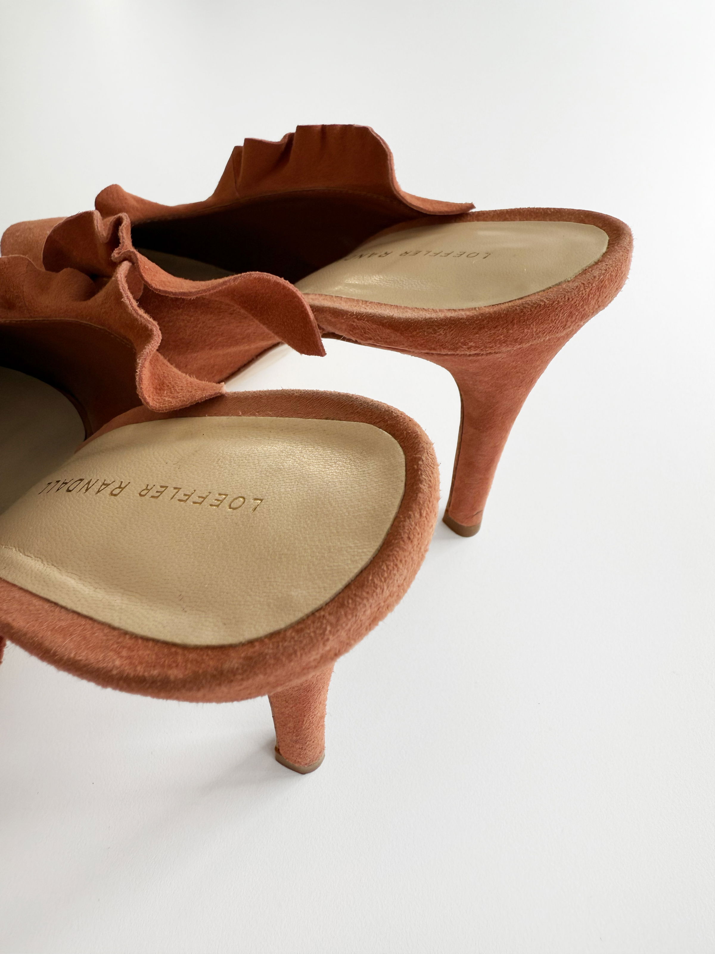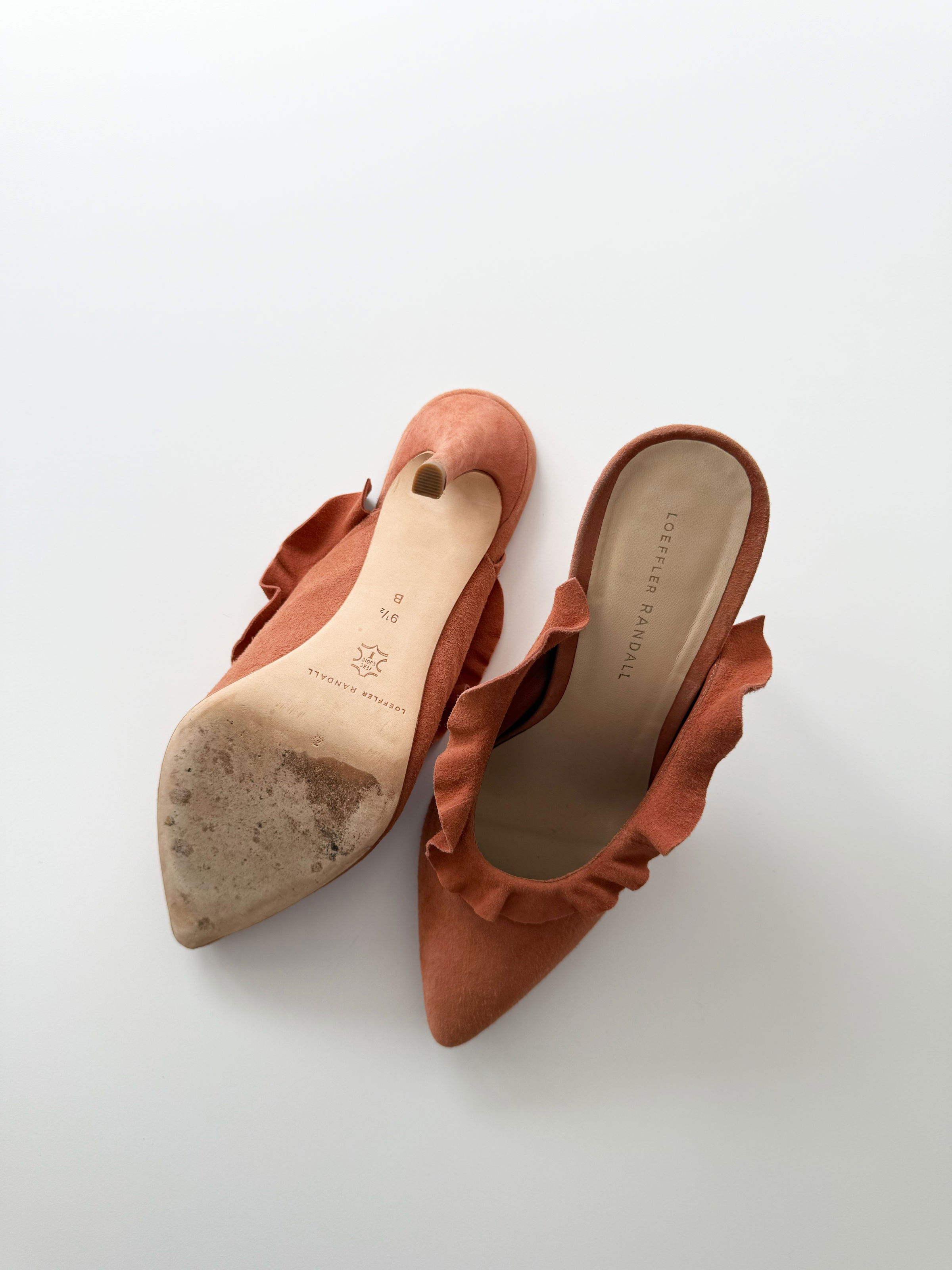 Dusty pink, suede ruffle high-heeled mules in excellent, pre-worn condition. Shoes come in their original box.