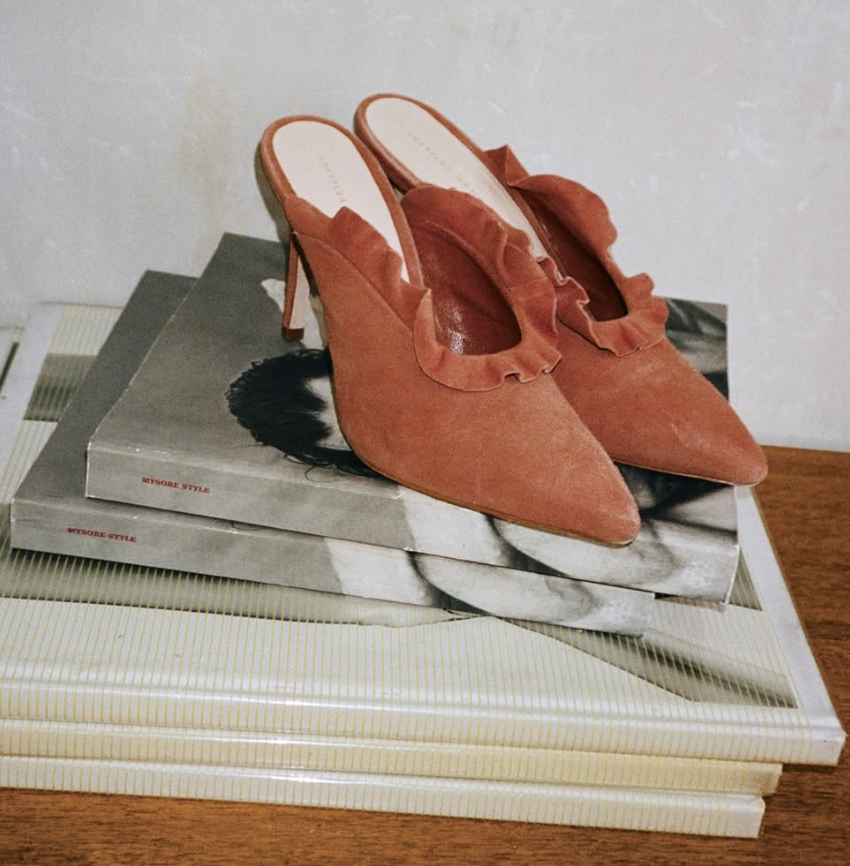Dusty pink, suede ruffle high-heeled mules in excellent, pre-worn condition. Shoes come in their original box.