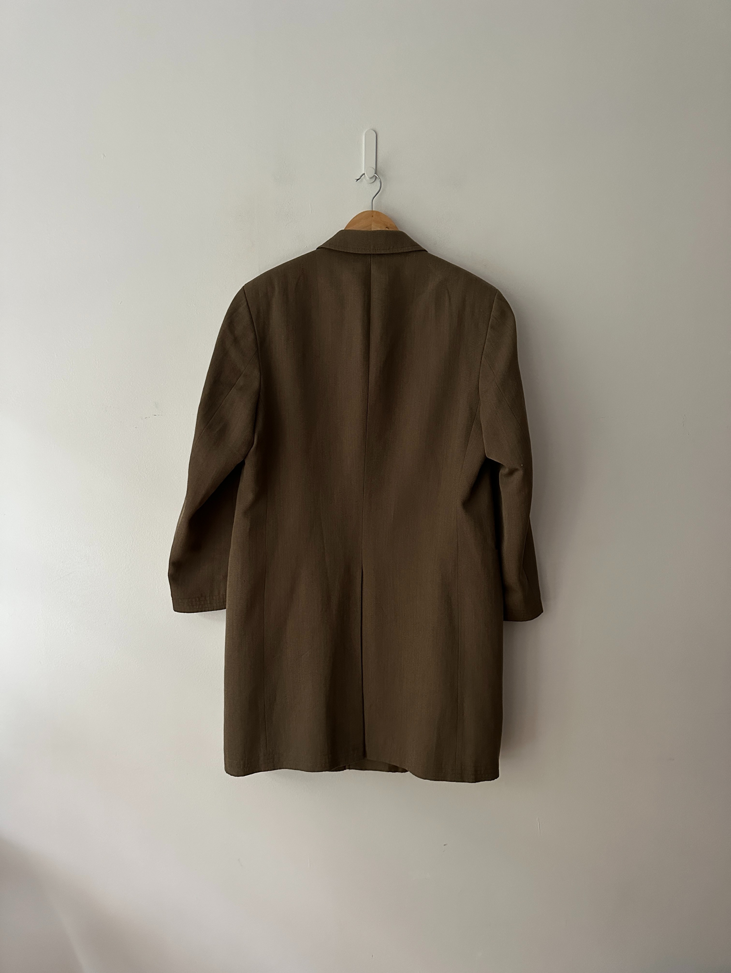 M&S x Sartorial olive green/brown long double-breasted coat.