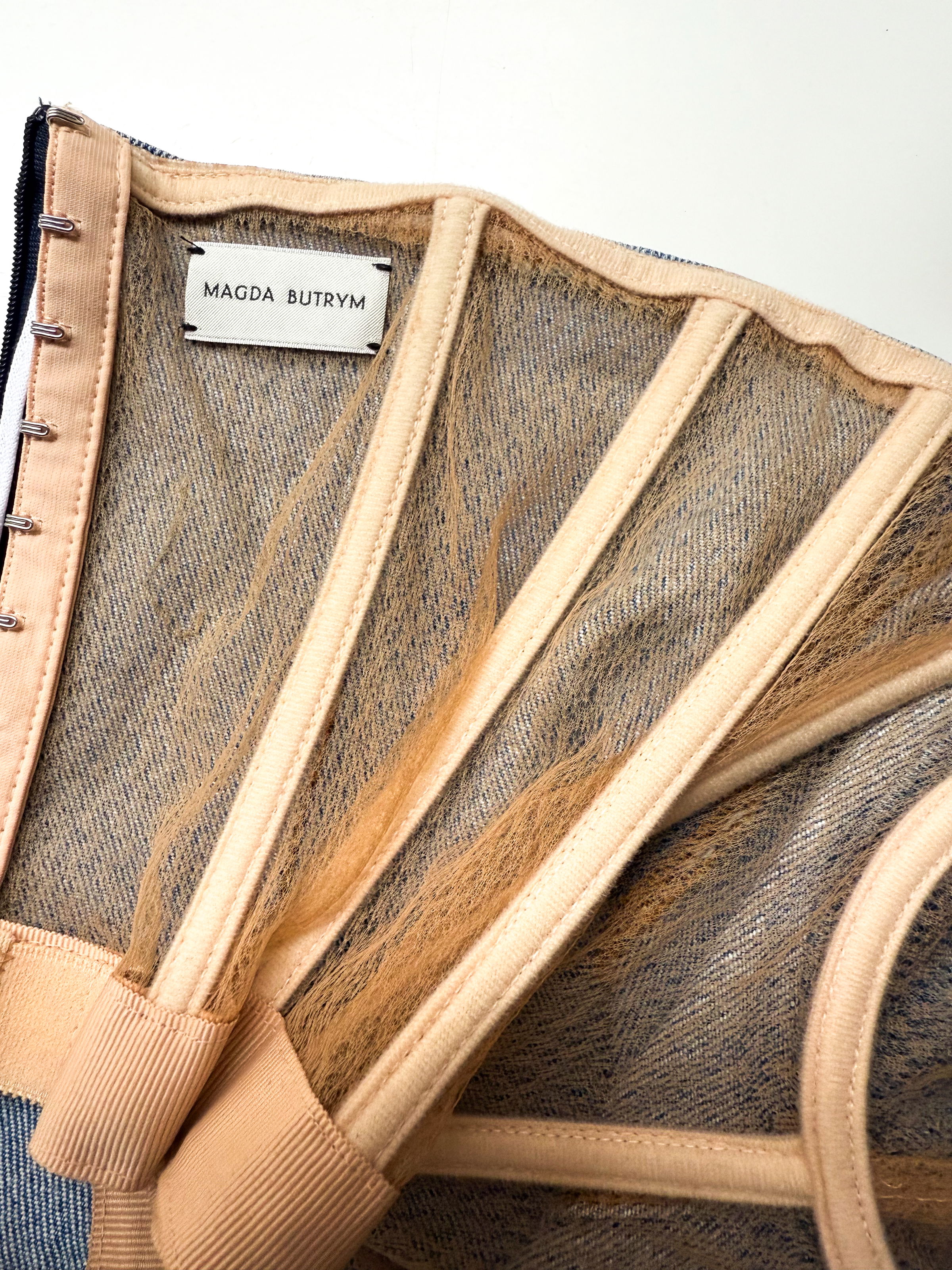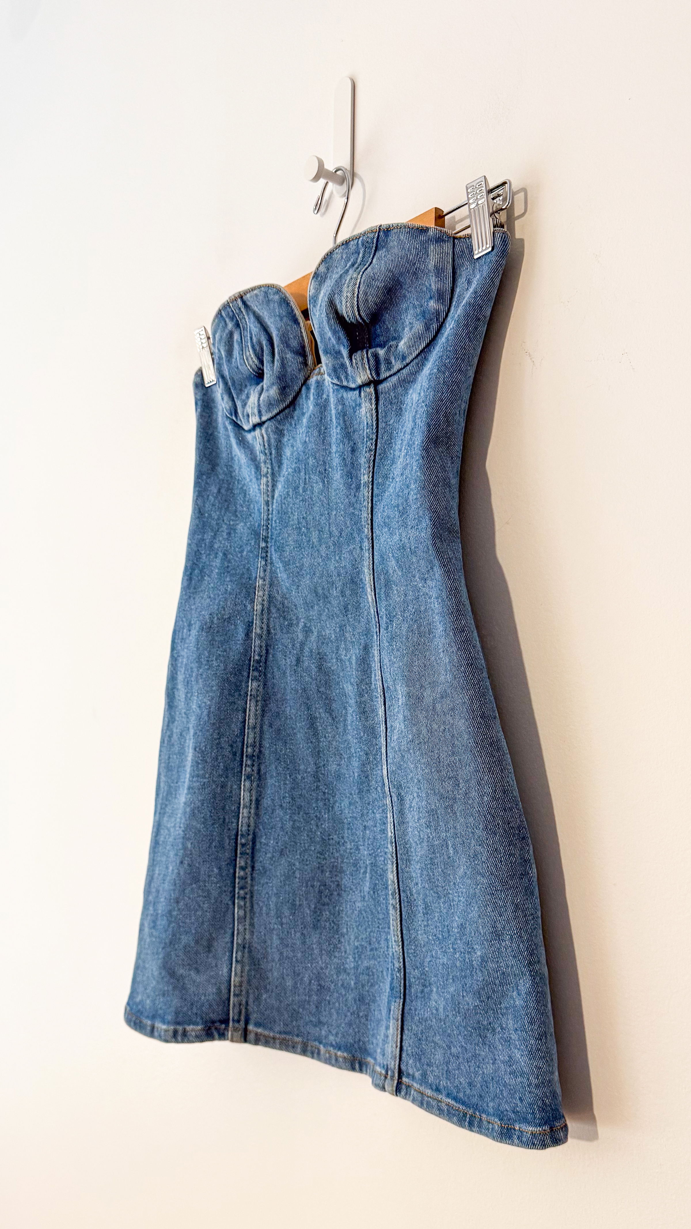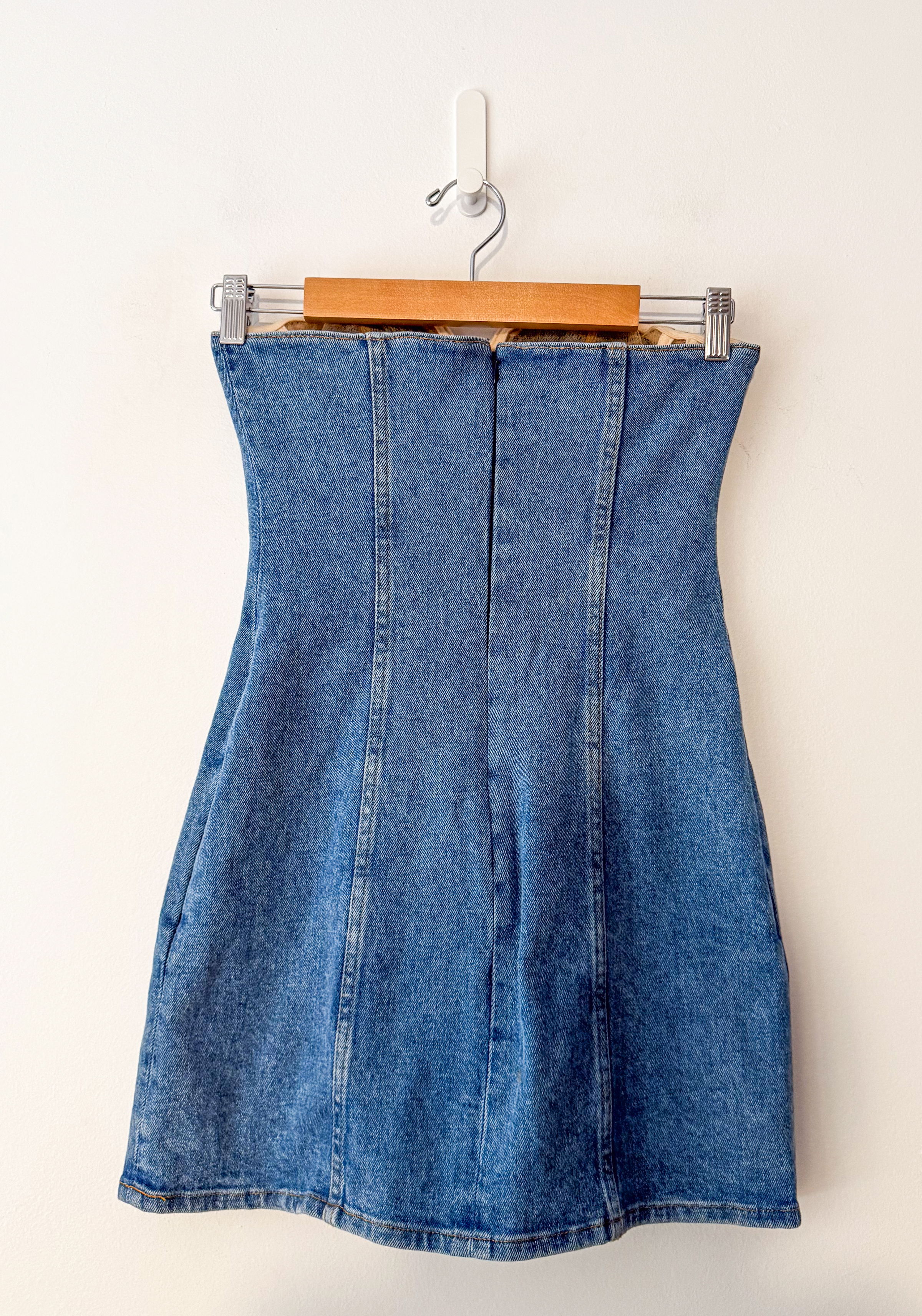 Denim bustier strapless mini dress. Closure: zipped back Pockets: side slit pockets. Material: 100% cotton.