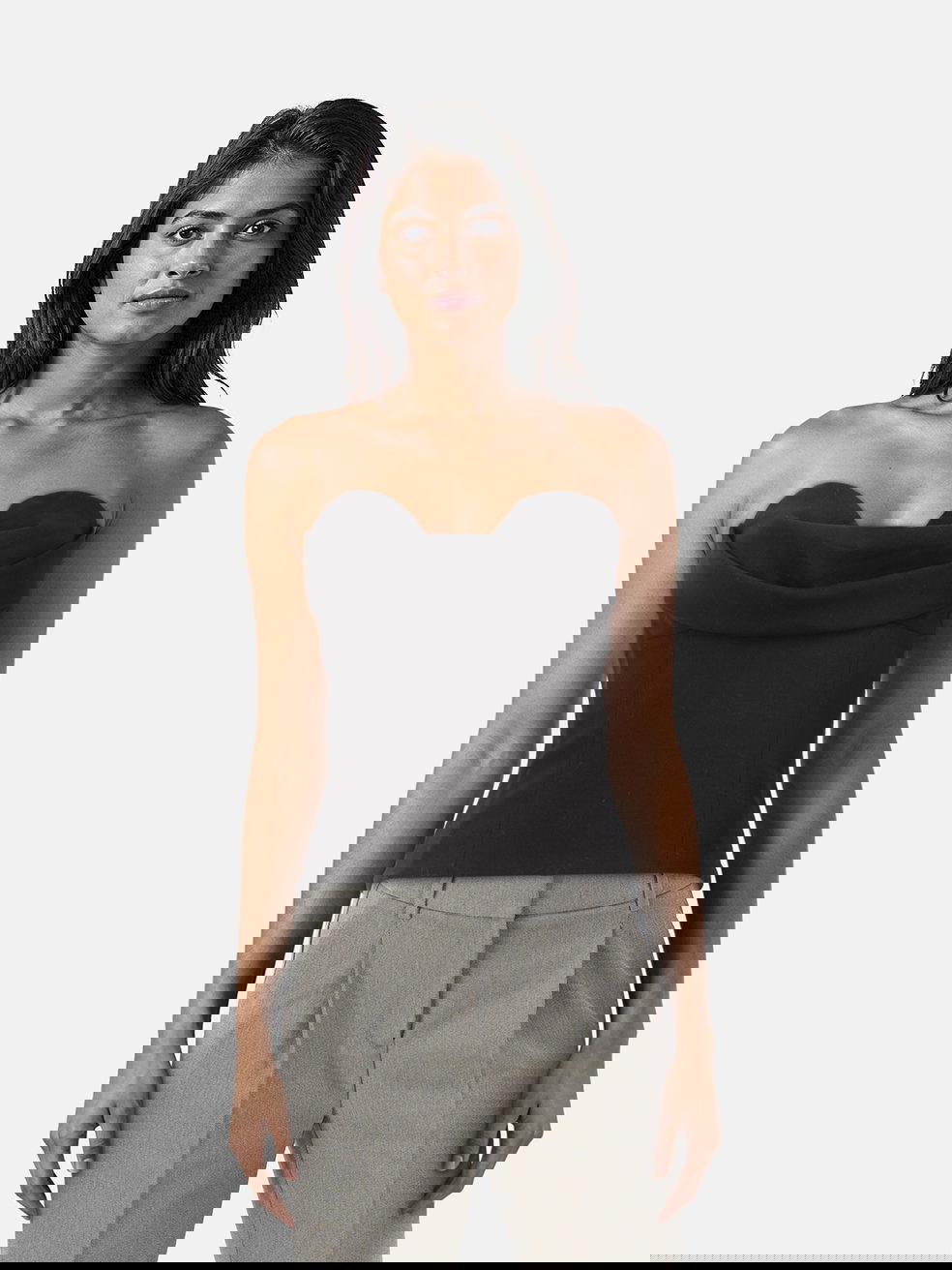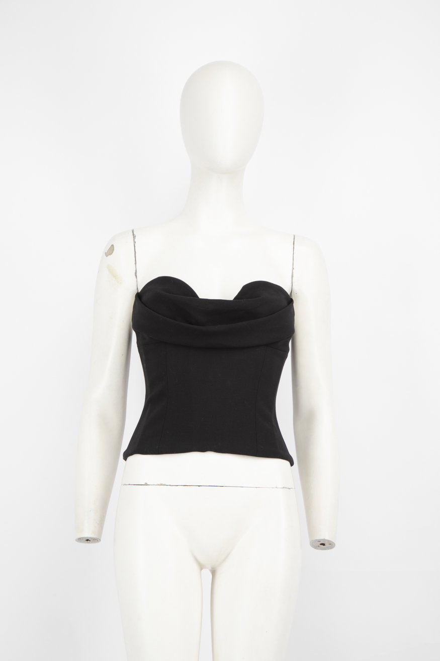 Brand new with tags black wool corset top in perfect, never worn condition. Strapless, boned bodice, back hook fastening, draped neck. Composition: 96% wool, 4% elastane. Measurements: bust 37cm, waist 33cm, length 33cm.