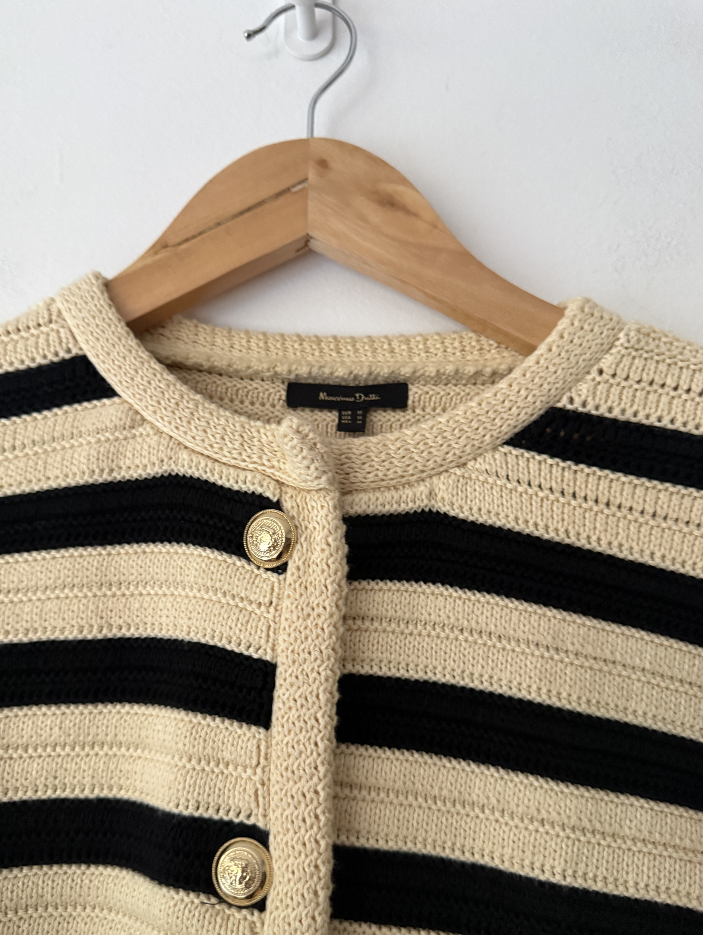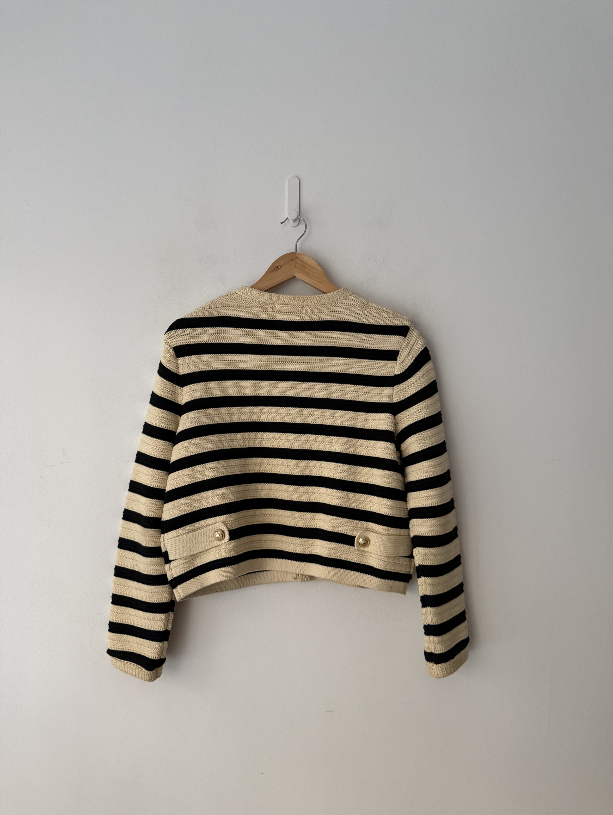 Striped cardigan with gold button fastening and gold button side tabs.