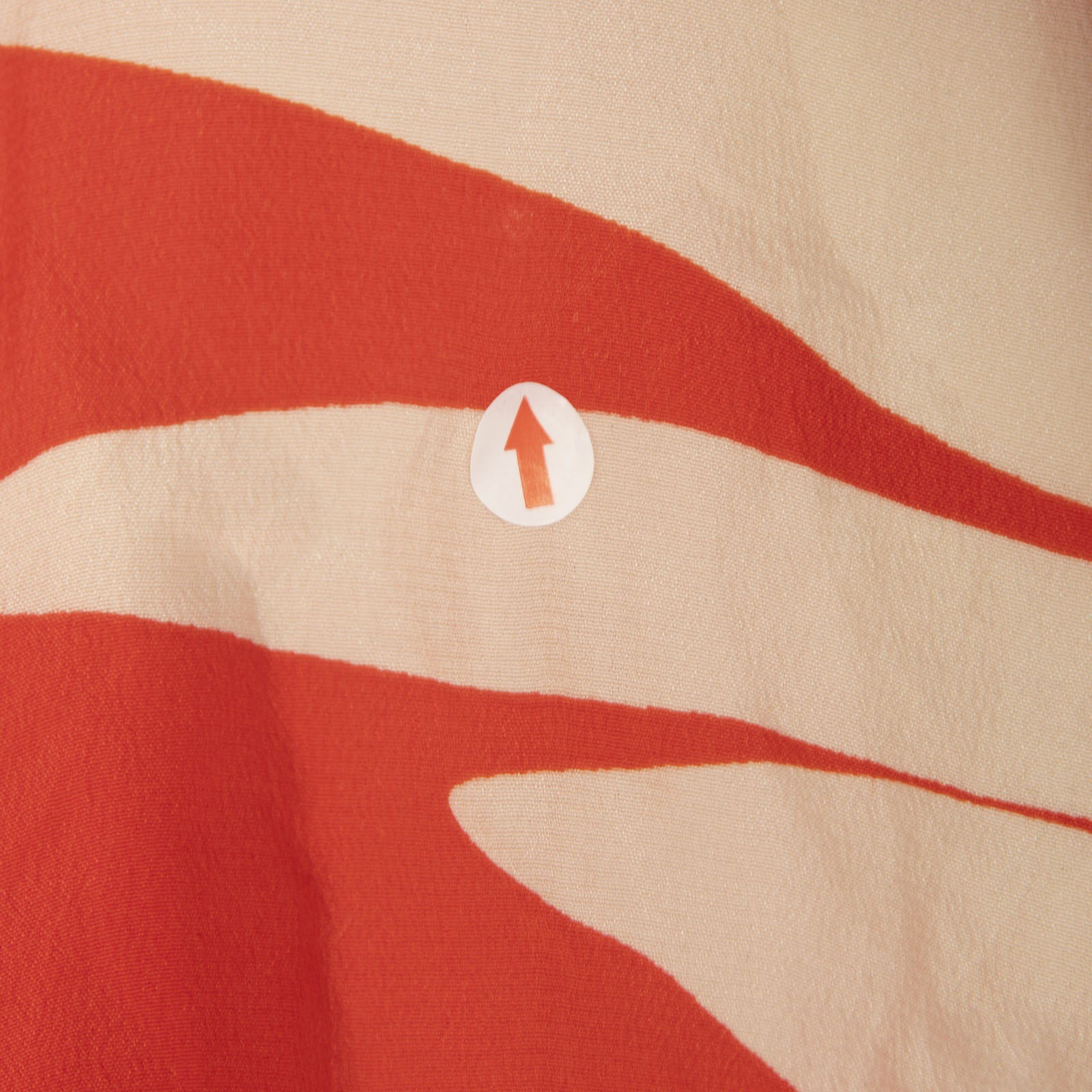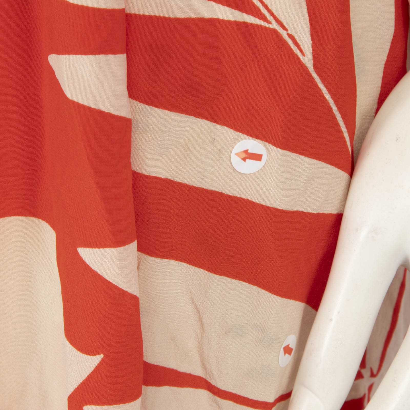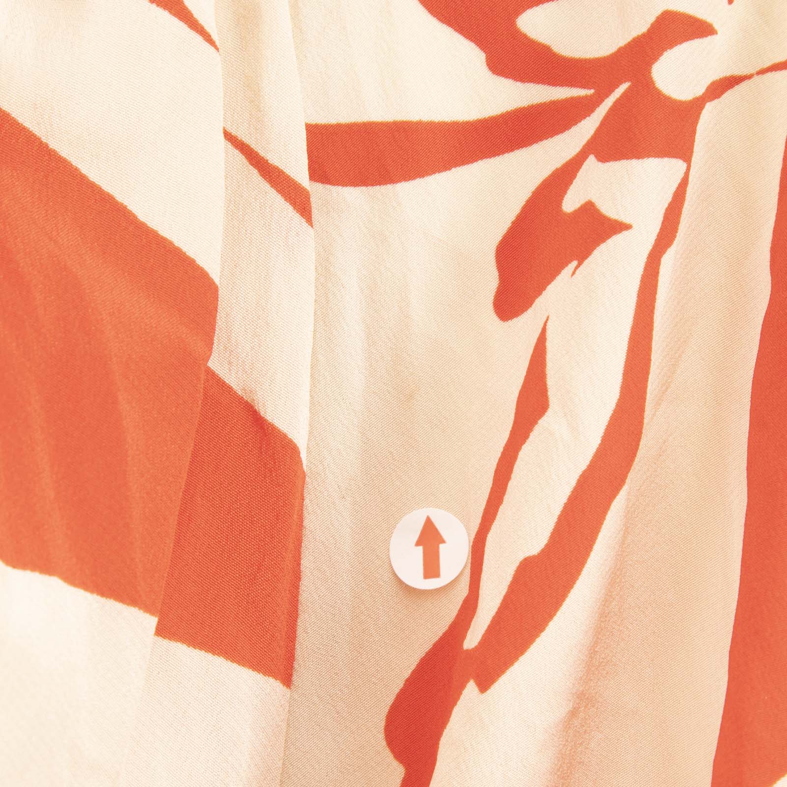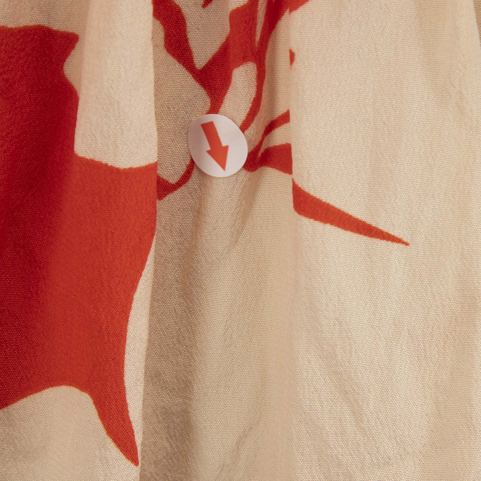 Red and cream leaf print mini dress in excellent, pre-worn condition. See images for signs of wear. Composition: 100% silk. Dry clean only. Measurements: Shoulder: 35cm, Sleeve Length: 55 cm, Bust: 44cm, Waist: 31cm, Hip: 45cm, Length: 75cm.