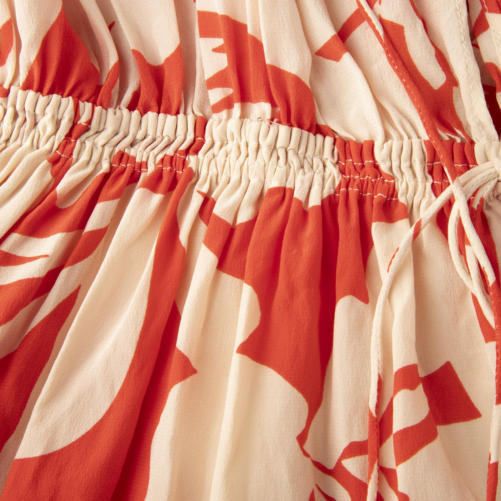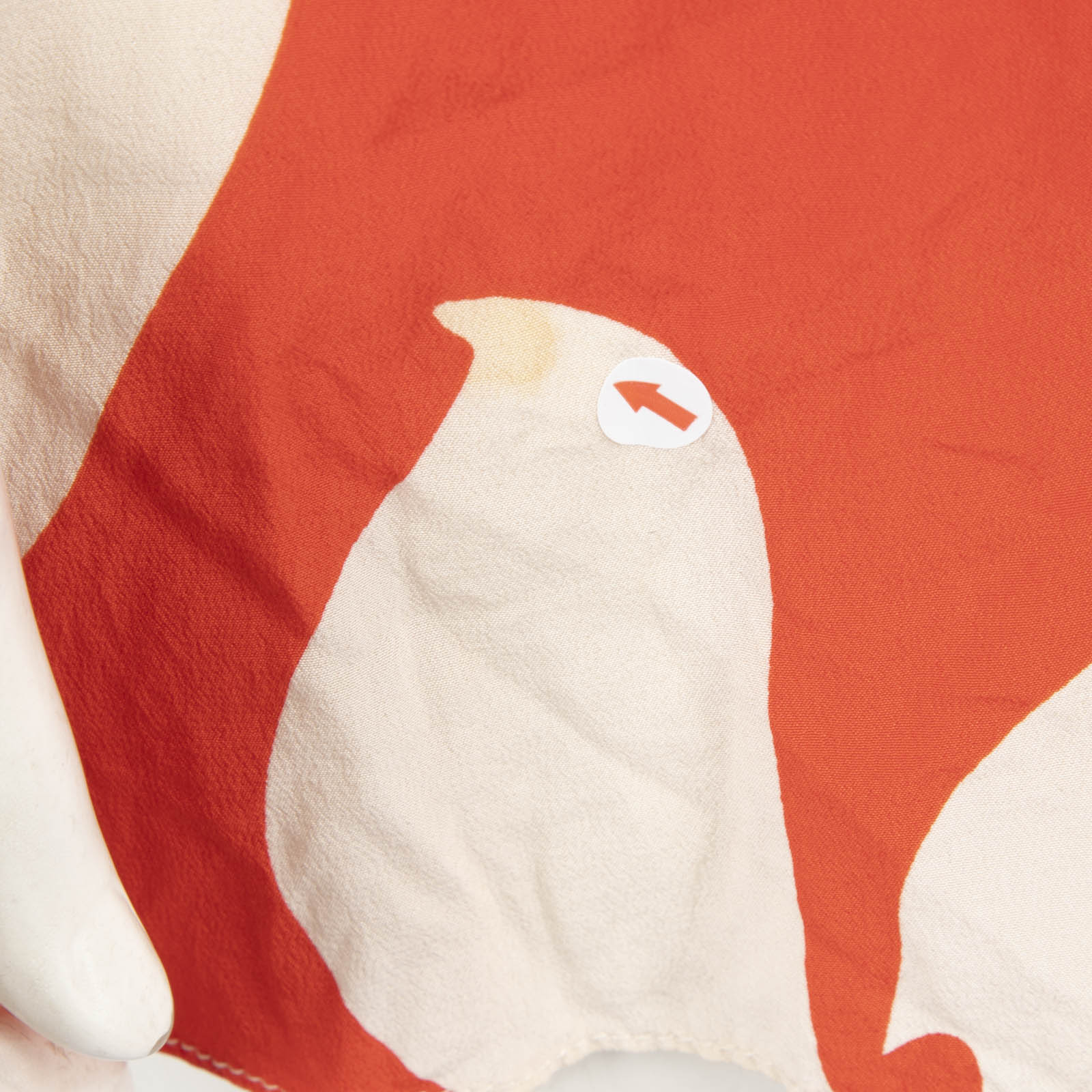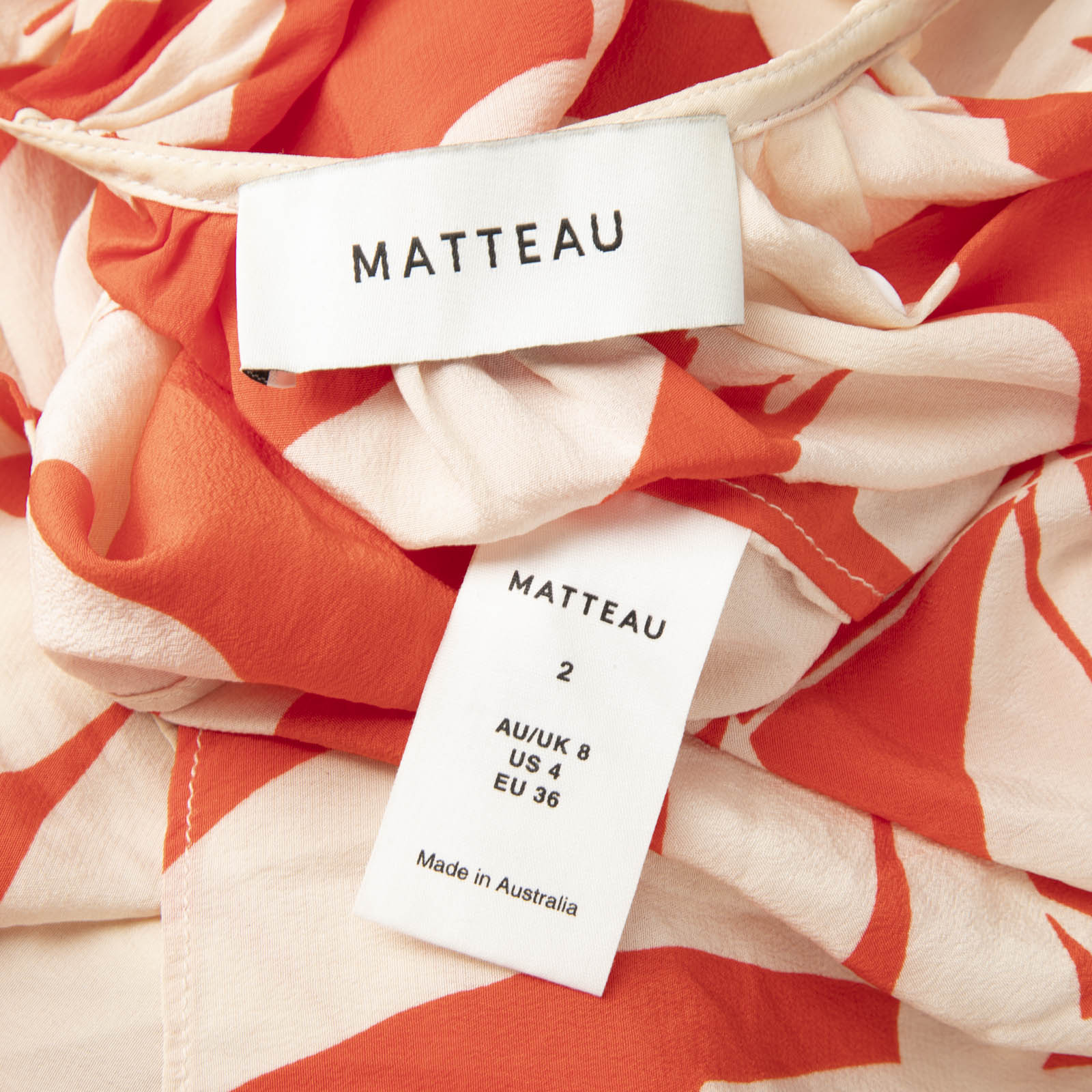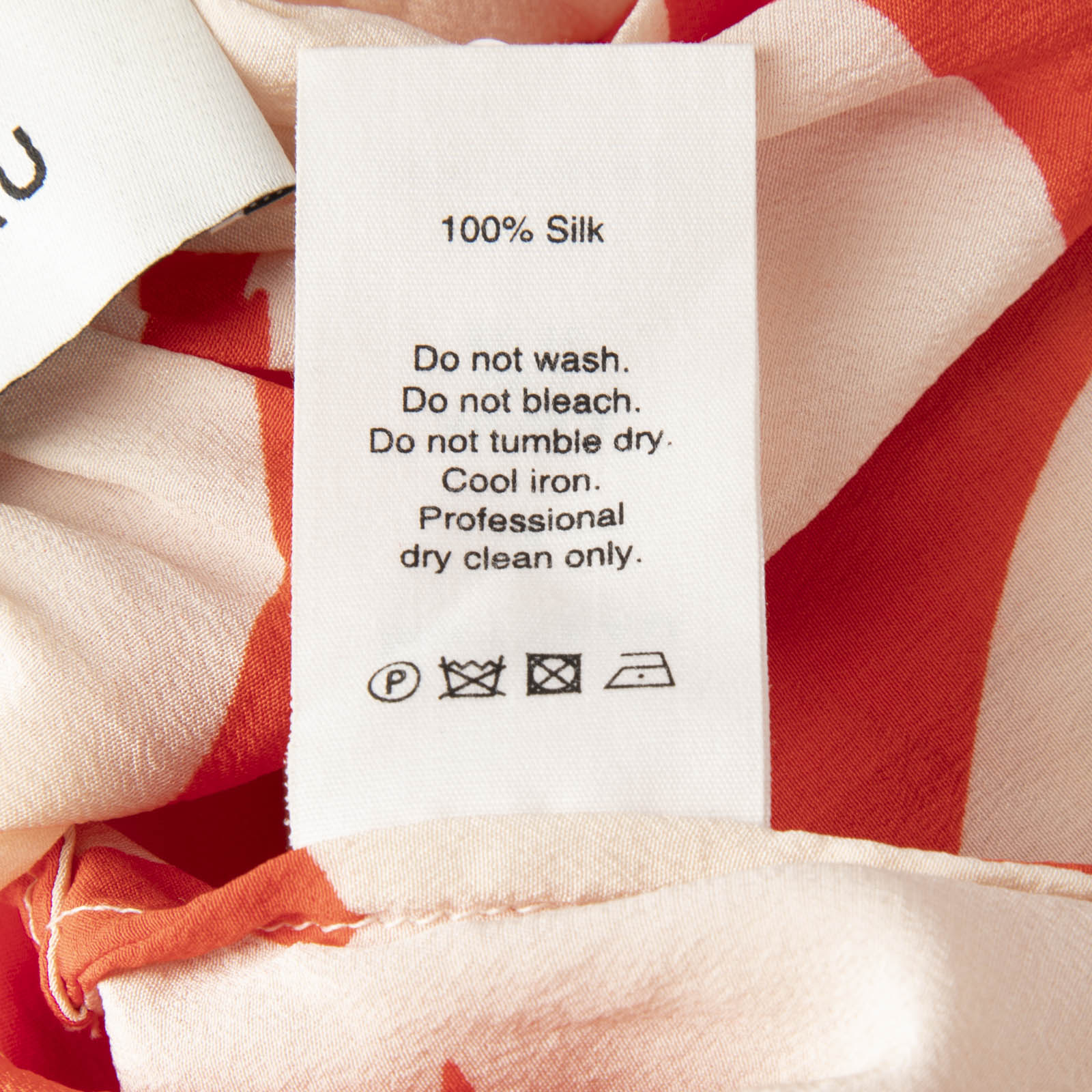 Red and cream leaf print mini dress in excellent, pre-worn condition. See images for signs of wear. Composition: 100% silk. Dry clean only. Measurements: Shoulder: 35cm, Sleeve Length: 55 cm, Bust: 44cm, Waist: 31cm, Hip: 45cm, Length: 75cm.