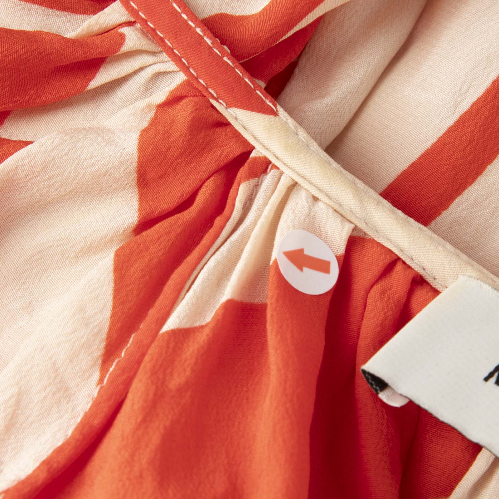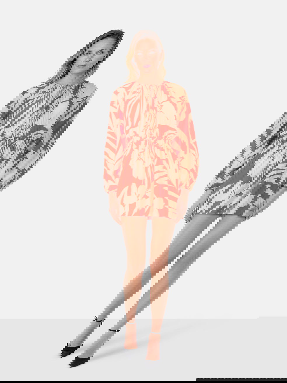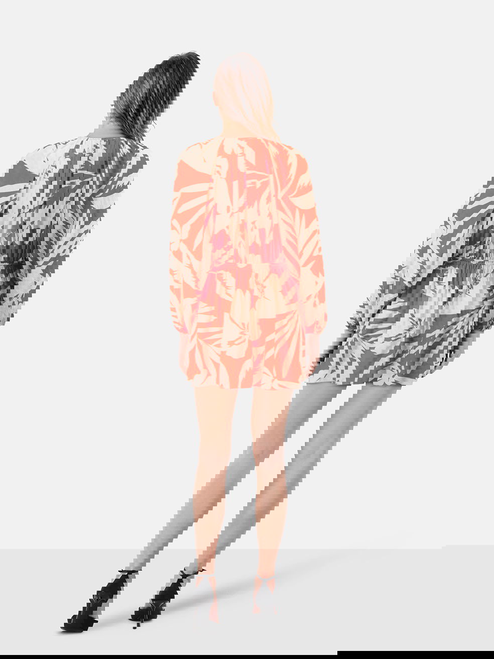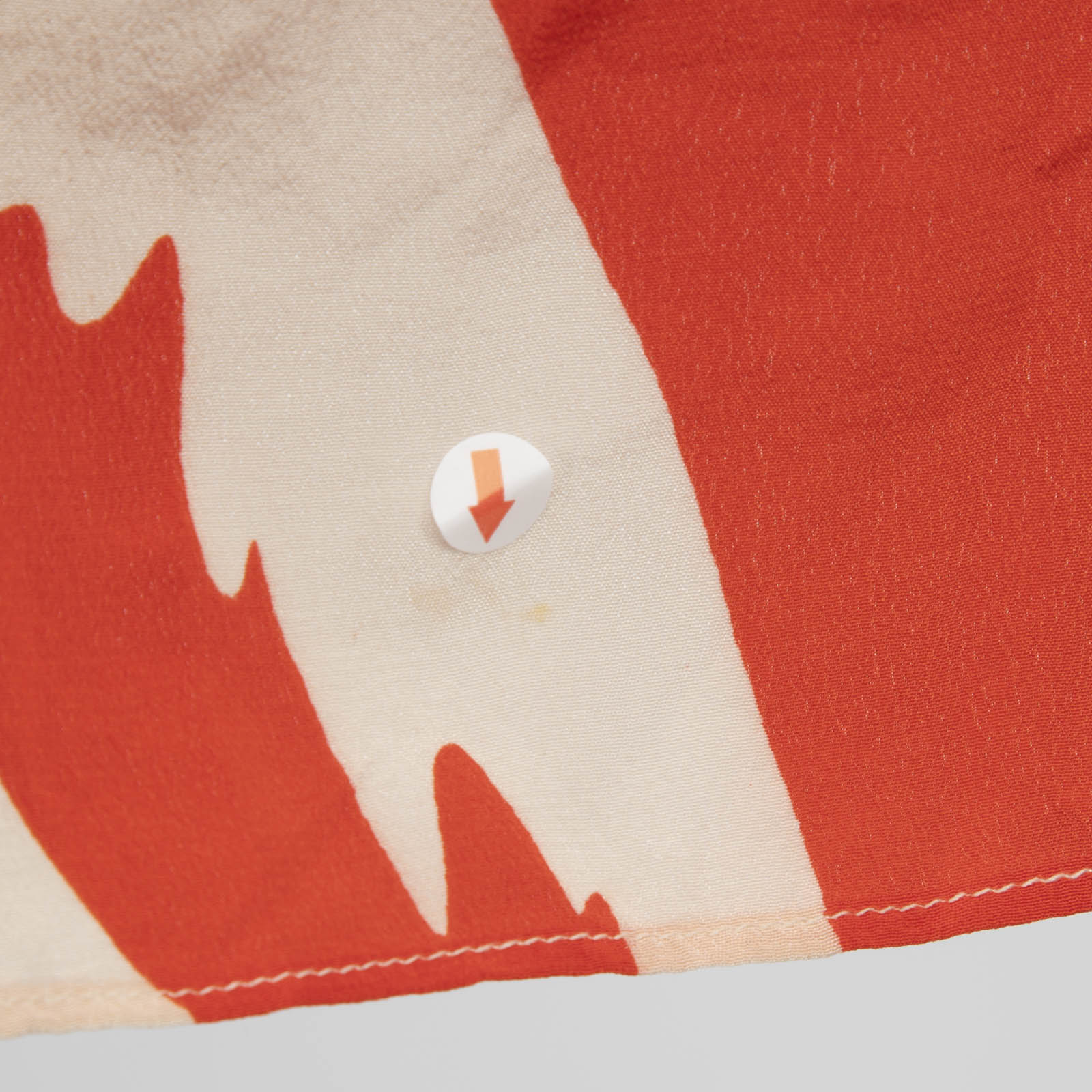 Red and cream leaf print mini dress in excellent, pre-worn condition. See images for signs of wear. Composition: 100% silk. Dry clean only. Measurements: Shoulder: 35cm, Sleeve Length: 55 cm, Bust: 44cm, Waist: 31cm, Hip: 45cm, Length: 75cm.