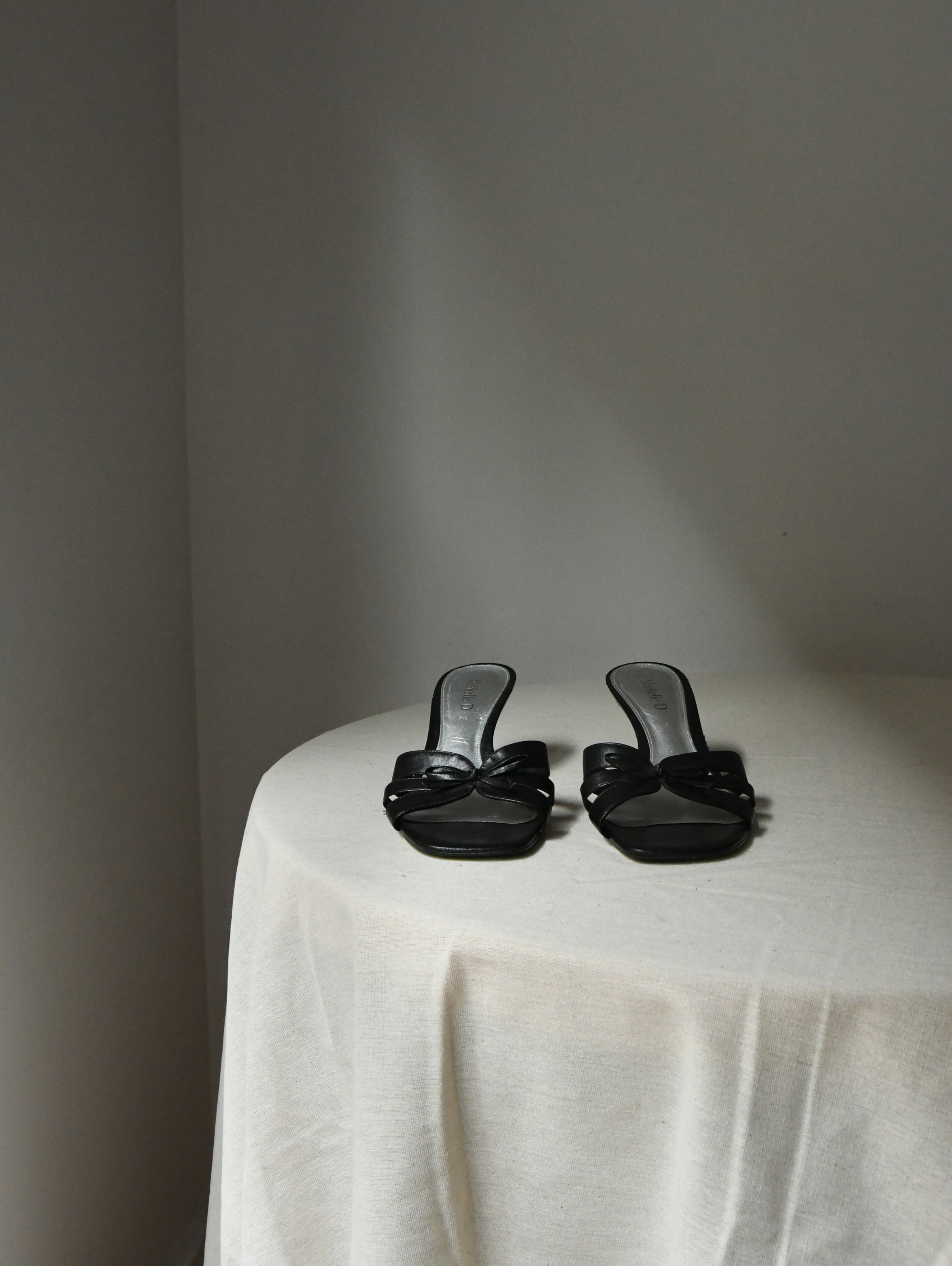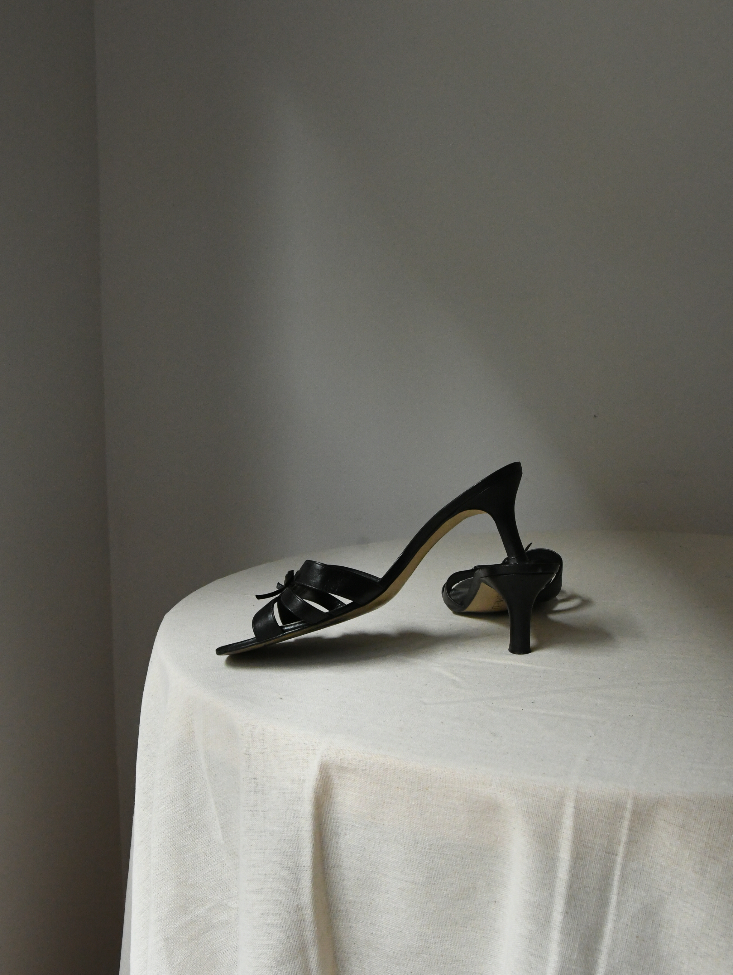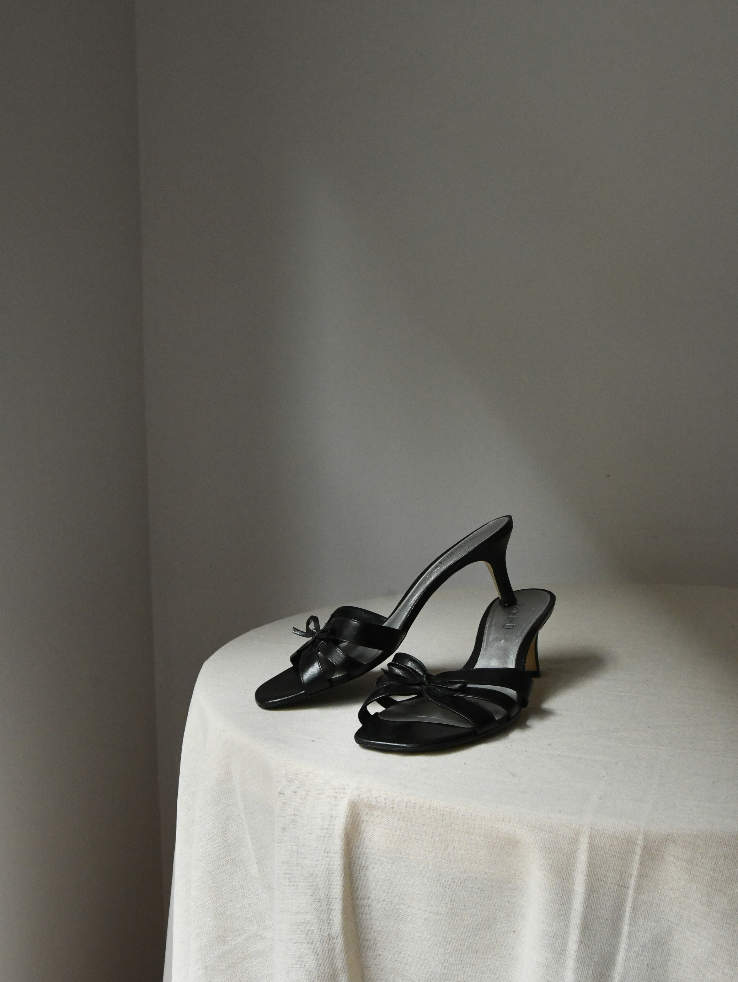 Open toe'd bow detail kitten heel sandal. 100% Leather .