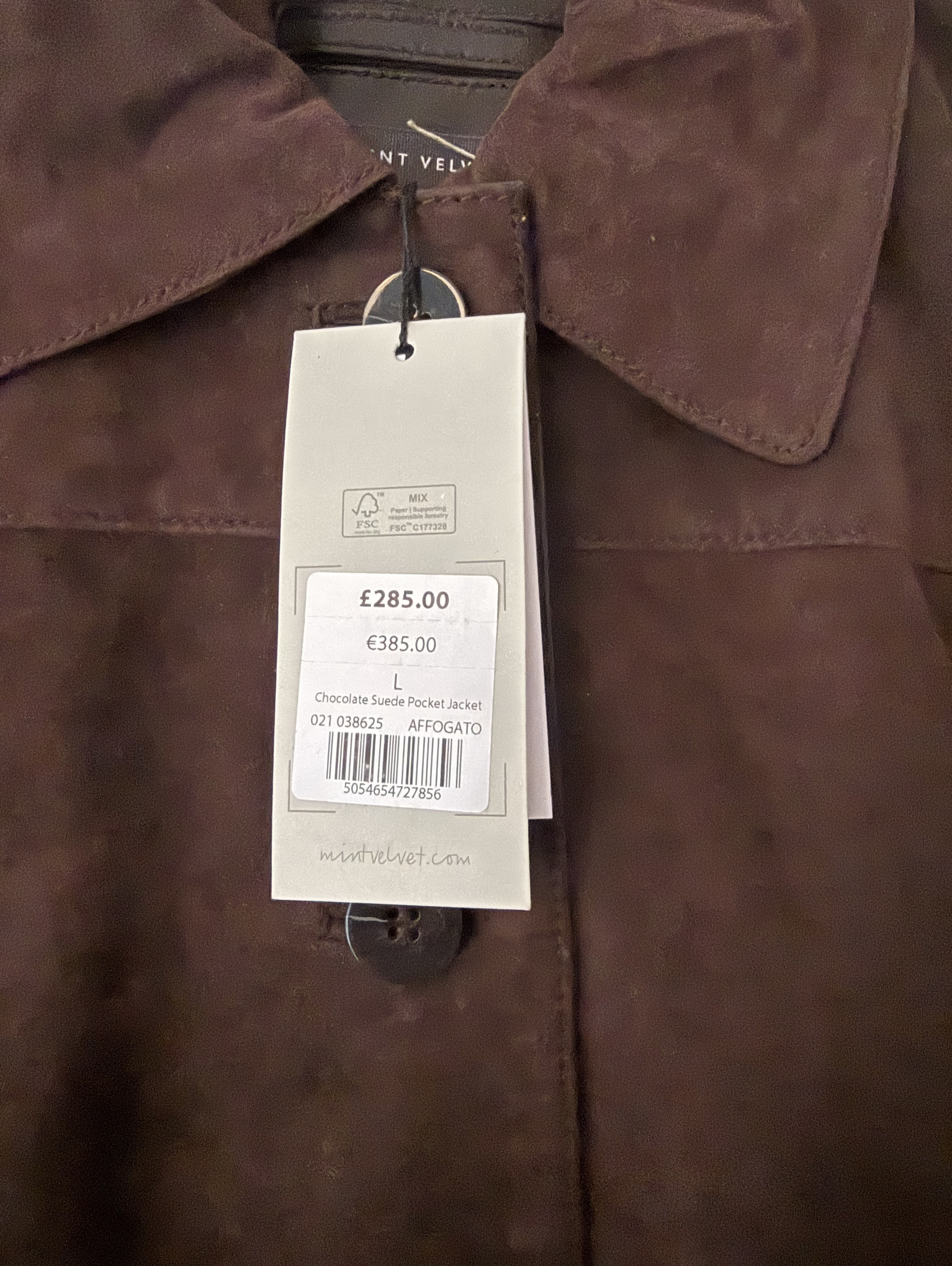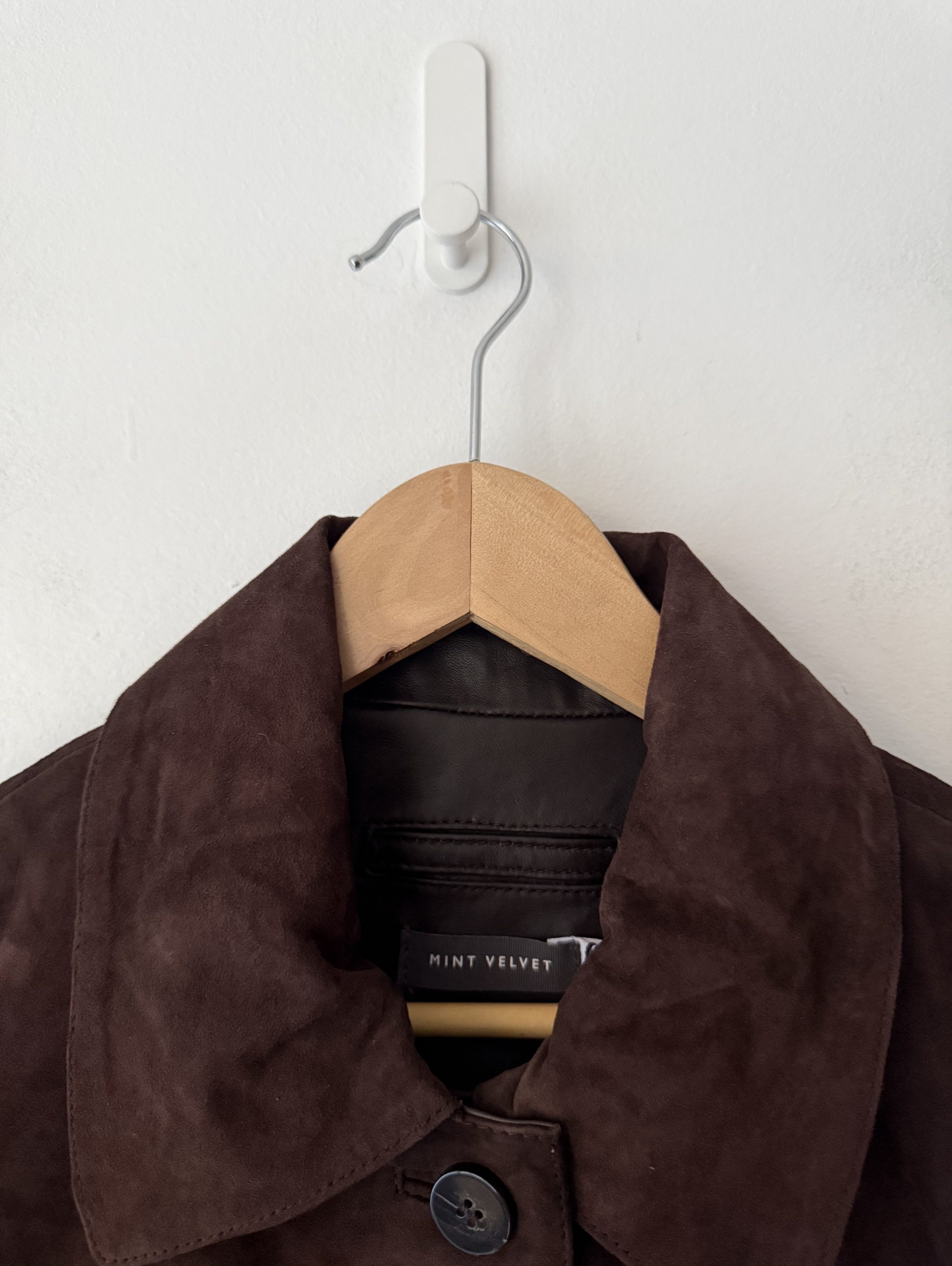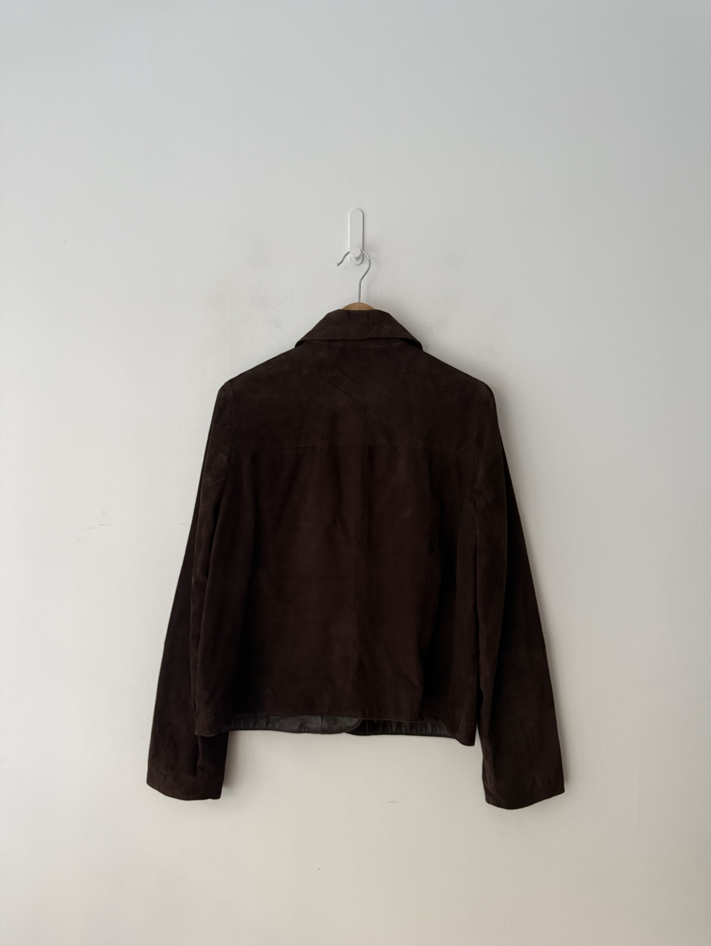Brown suede jacket featuring a classic collar, long sleeves, square pockets with a button fastening through the front. The length from side neck point to front hem measures 59cm/23in. Current Season.