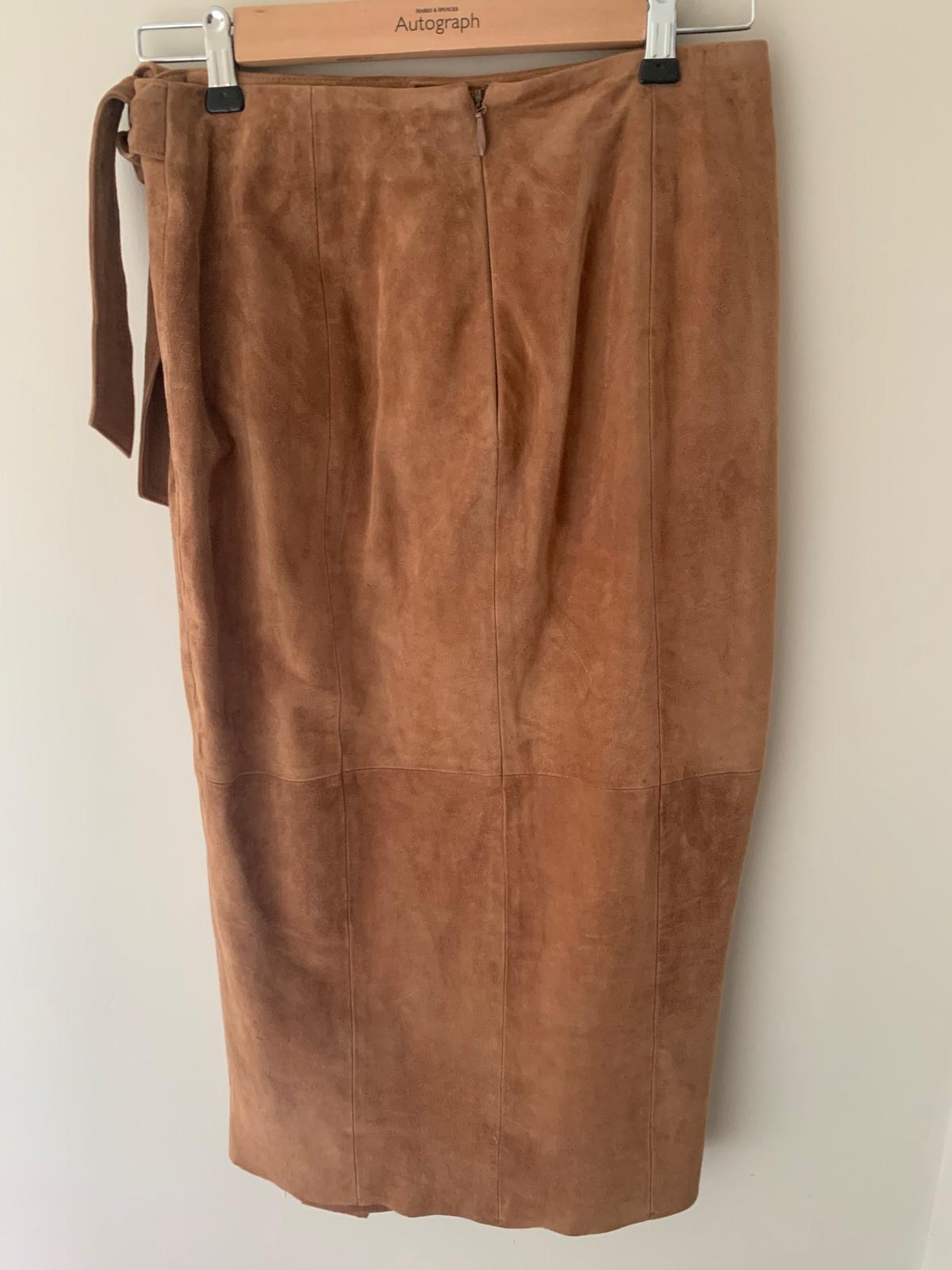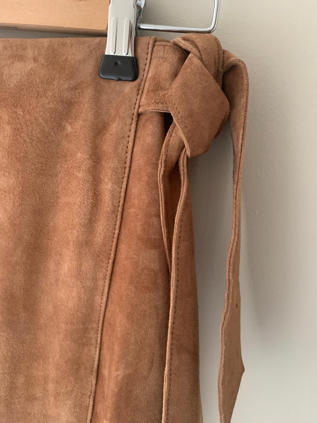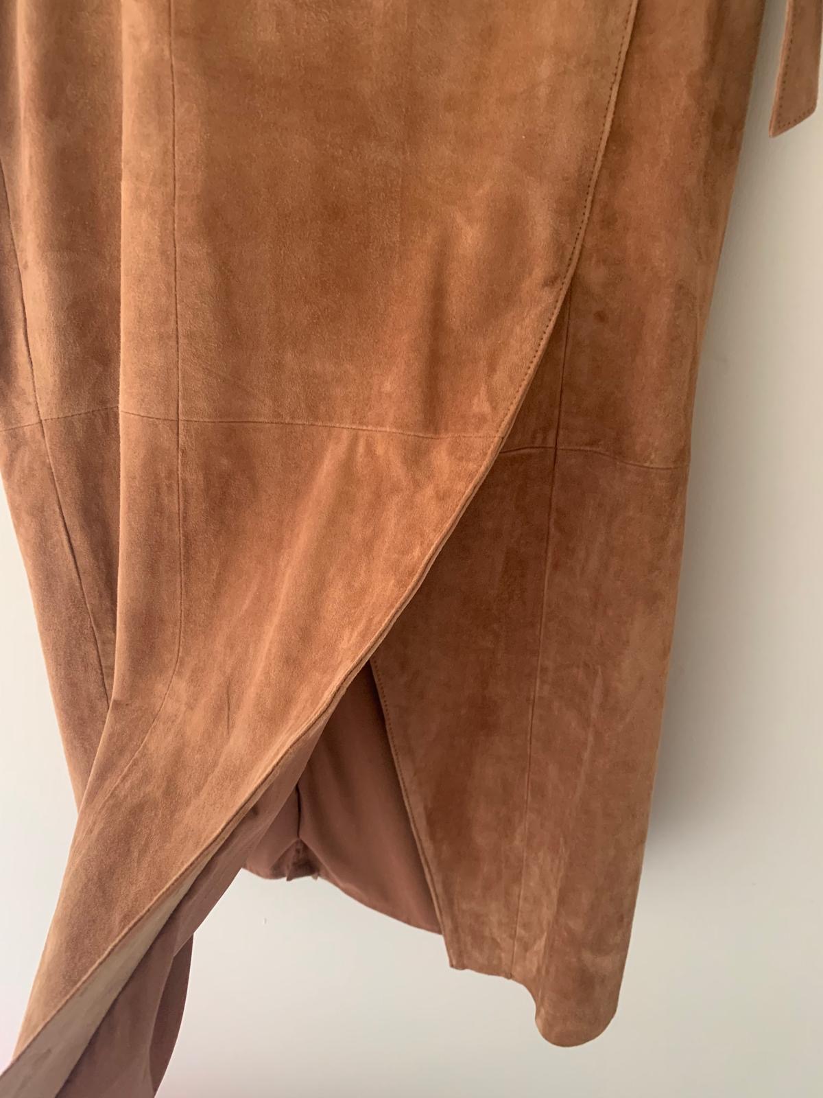 Beautiful genuine suede mock-wrap midi skirt in timeless tan colour. Length of skirt is 82cm and with zip fastening to side. Tags removed but never worn - stored in a garment bag since purchase.