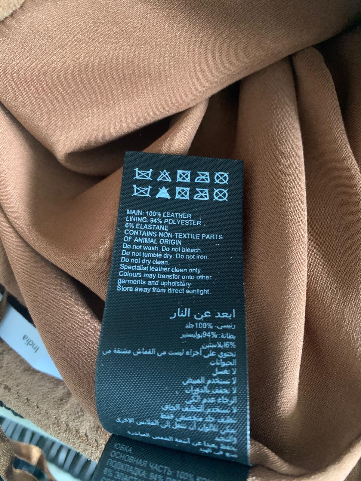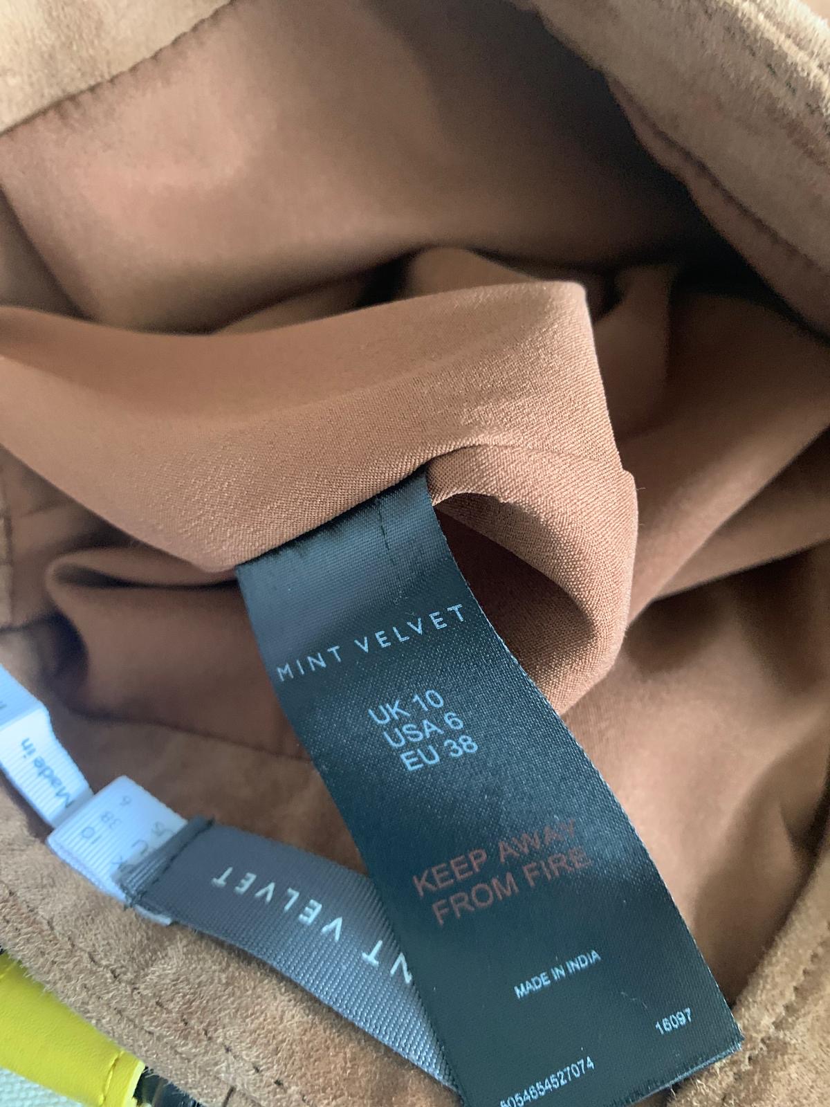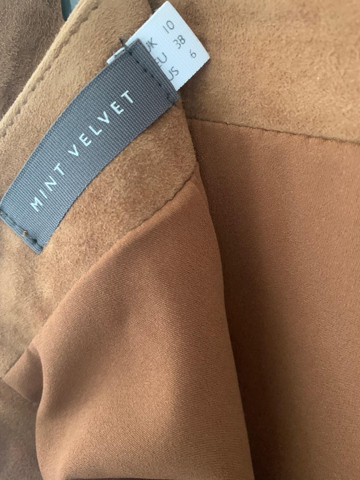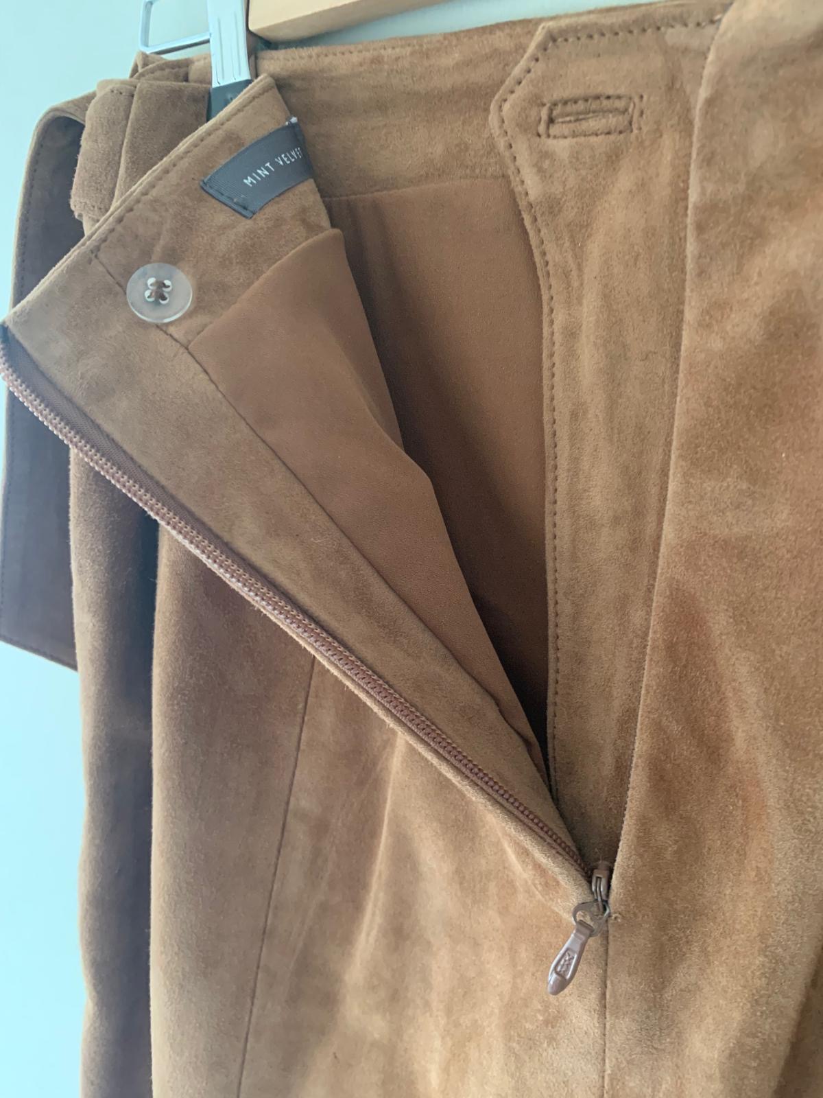 Beautiful genuine suede mock-wrap midi skirt in timeless tan colour. Length of skirt is 82cm and with zip fastening to side. Tags removed but never worn - stored in a garment bag since purchase.