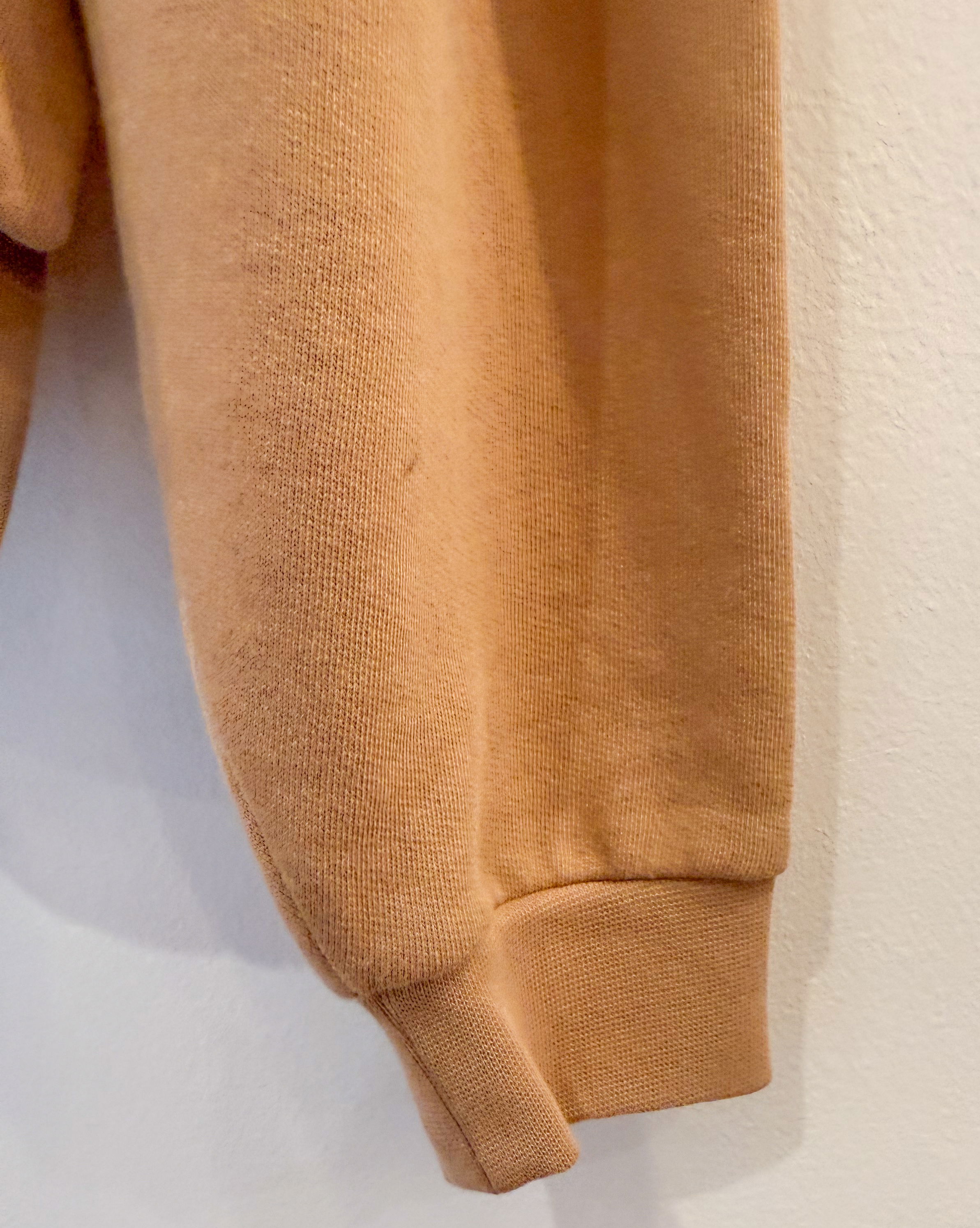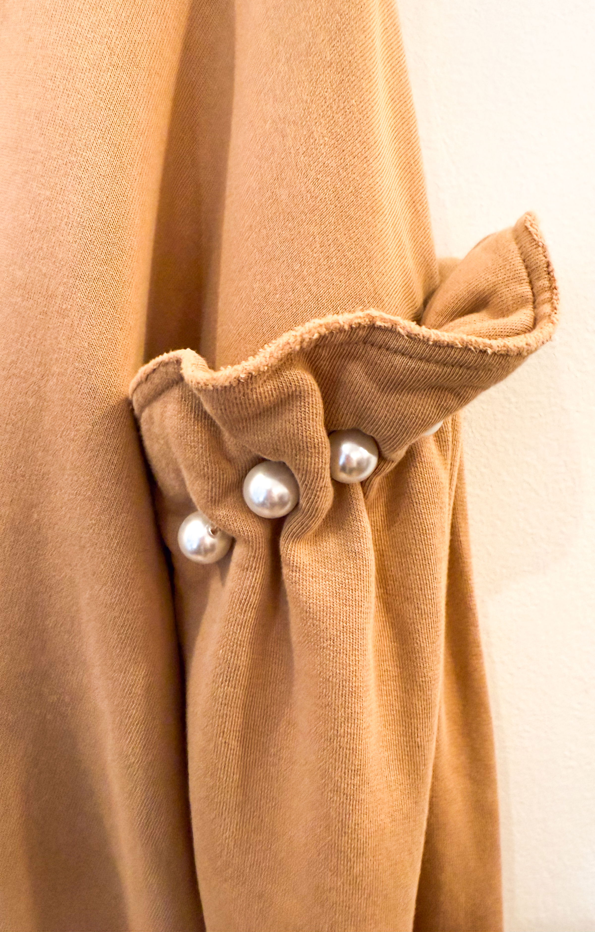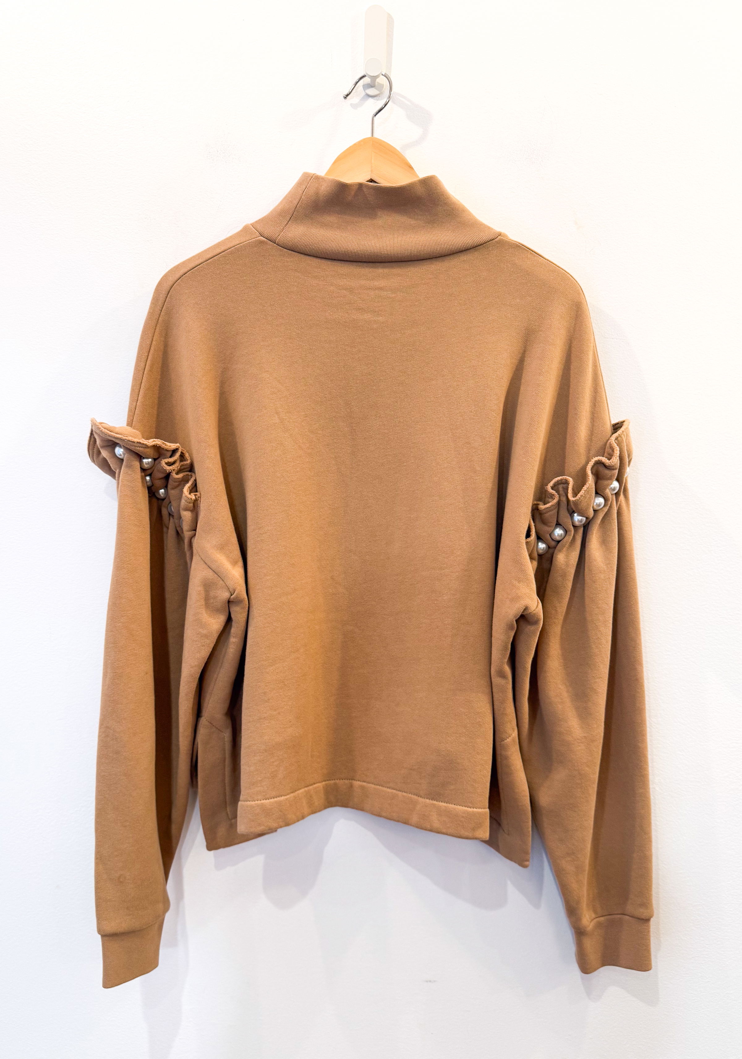 Camel, high-necked, cropped sweatshirt with embellished pearl shoulder in excellent, pre-worn condition. Composition: 100% organic cotton. Hand wash.