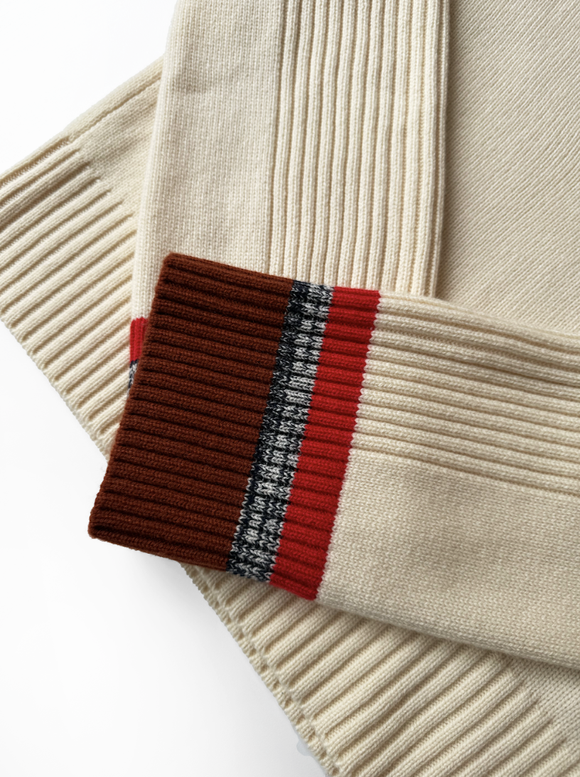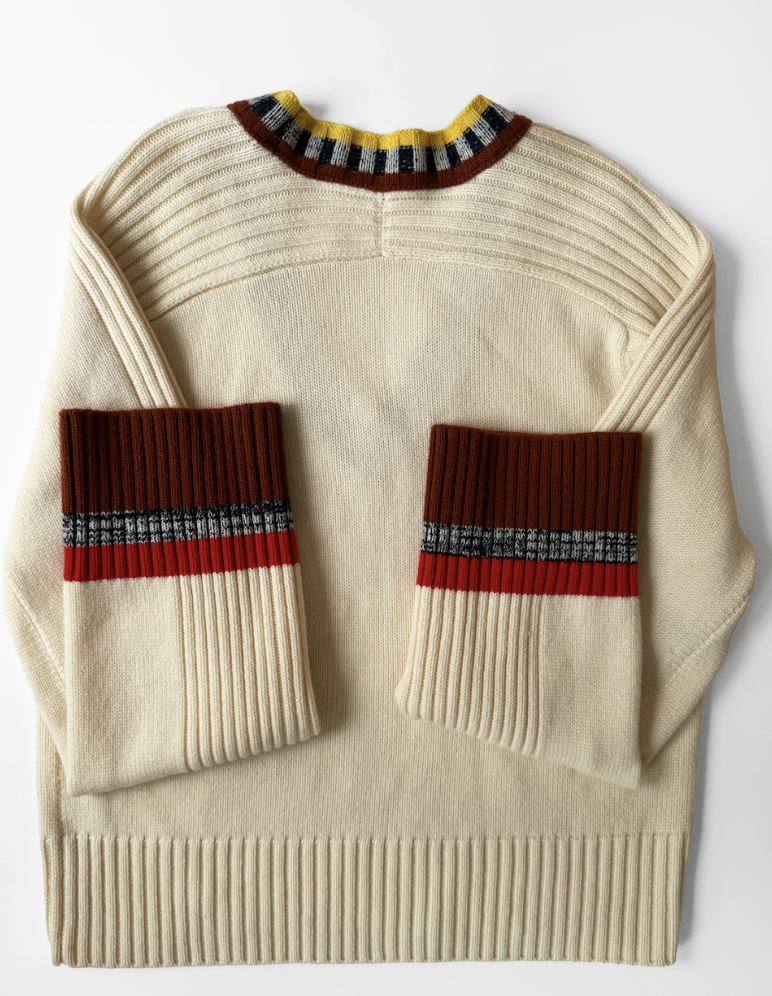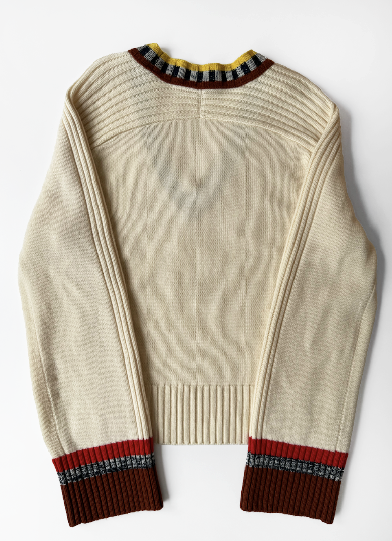 This jumper is crafted from an ultra-soft, mid-heavyweight luxurious blend of 5gg merino wool and cashmere in a creamy hue with contrasting striped trims outlining the neckline and cuffs. Such a colourful finish lends this neutral jumper a sporty vibrancy. Dry clean only.